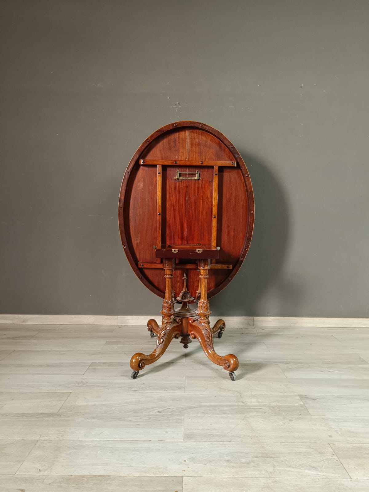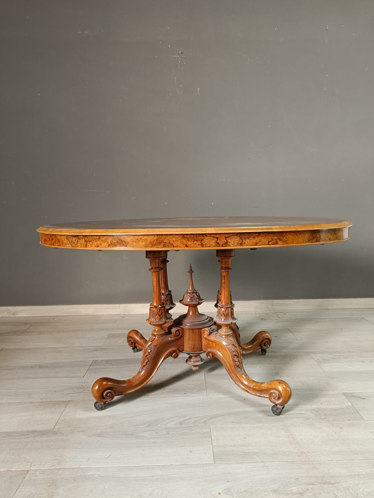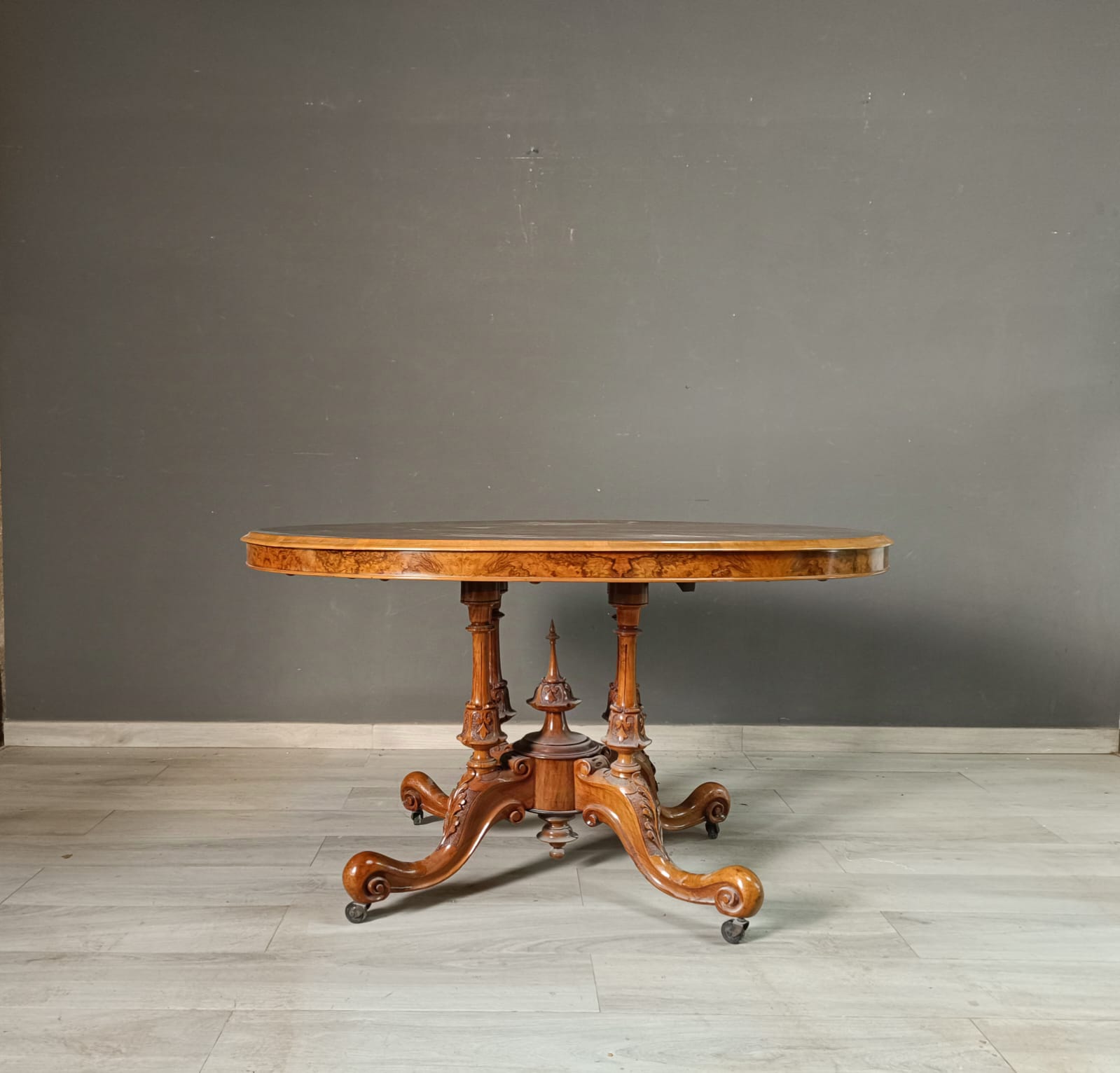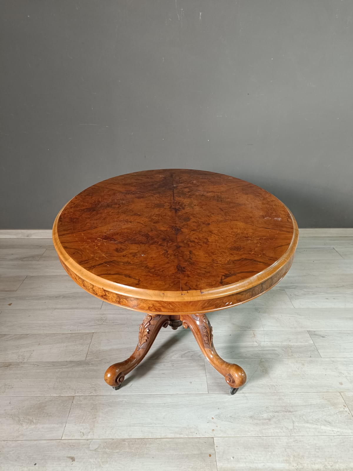 Tavolo a vela in stile vittoriano con il piano in radica di noce e intarsi in acero. Perfetto stato conservativo.