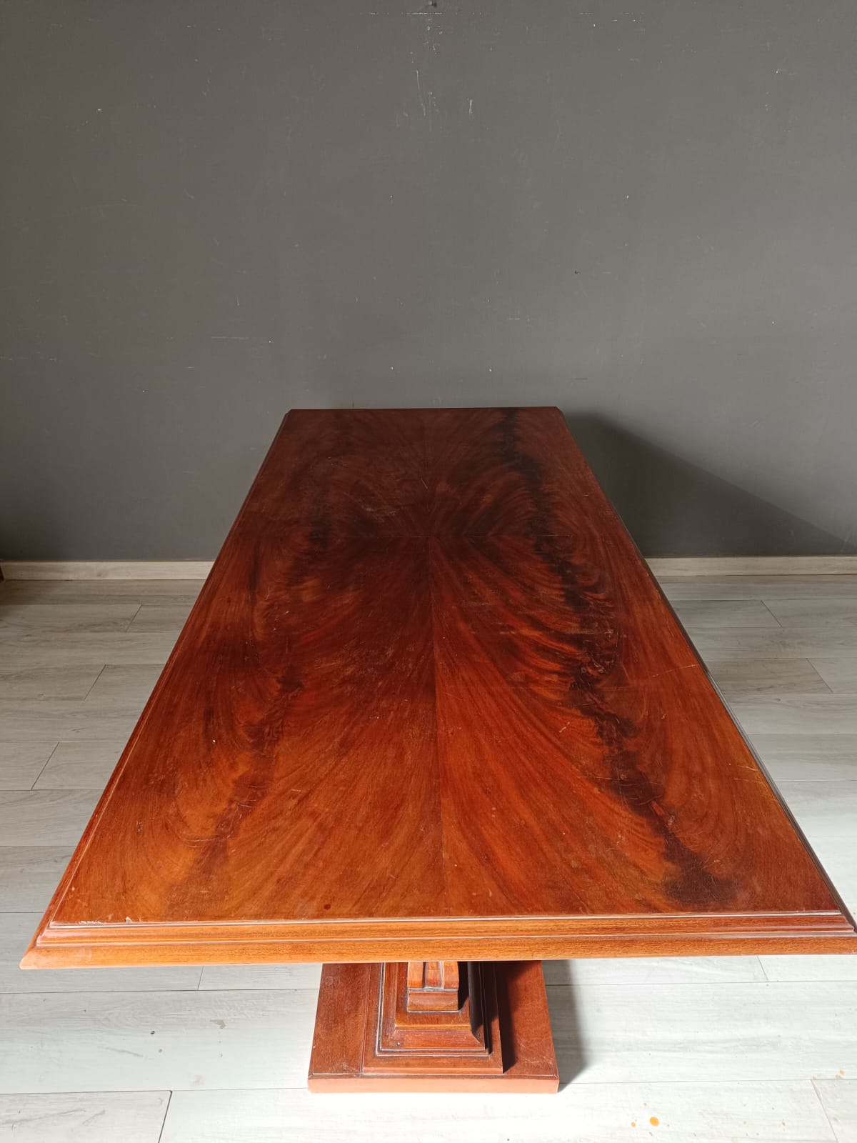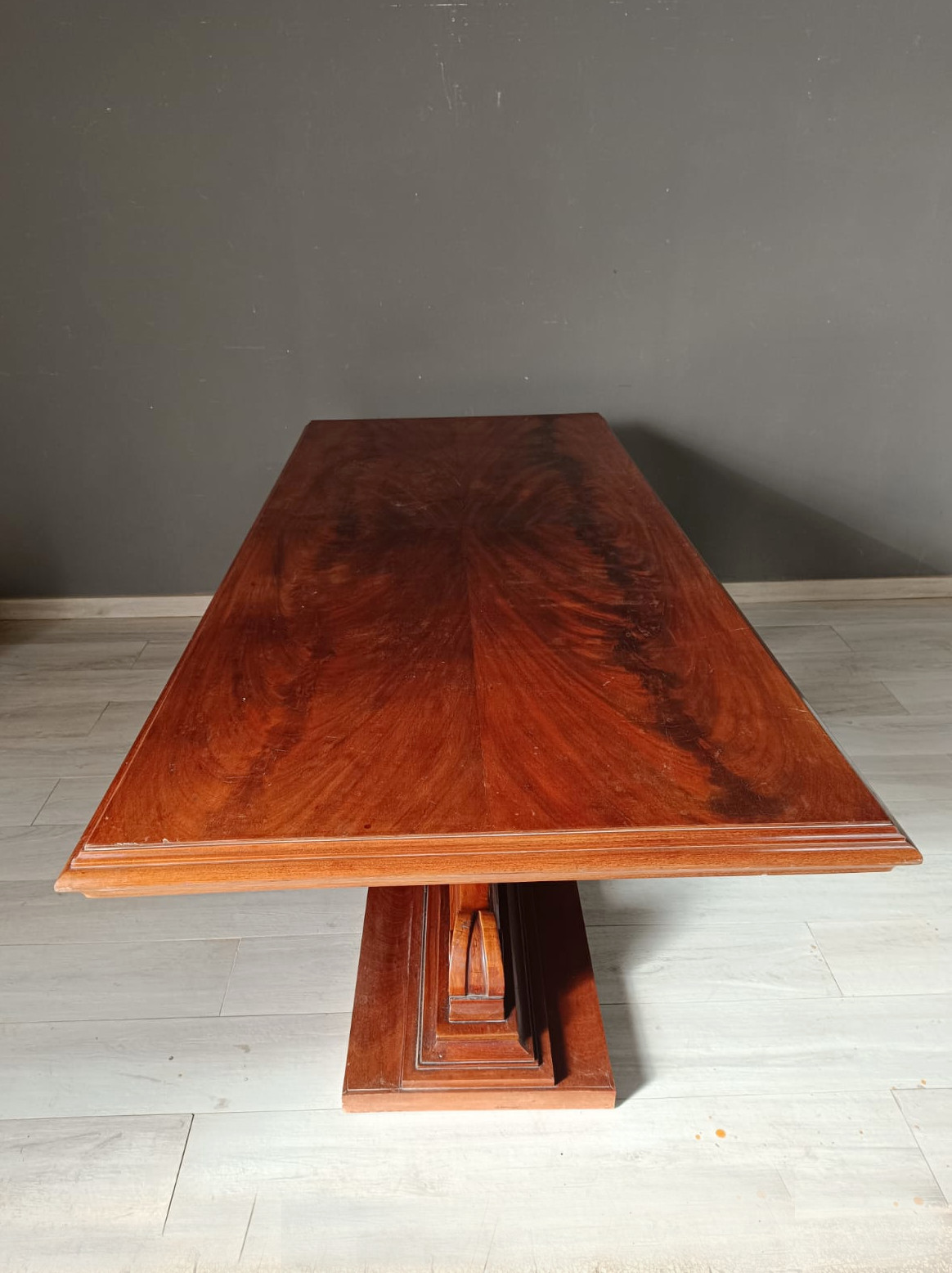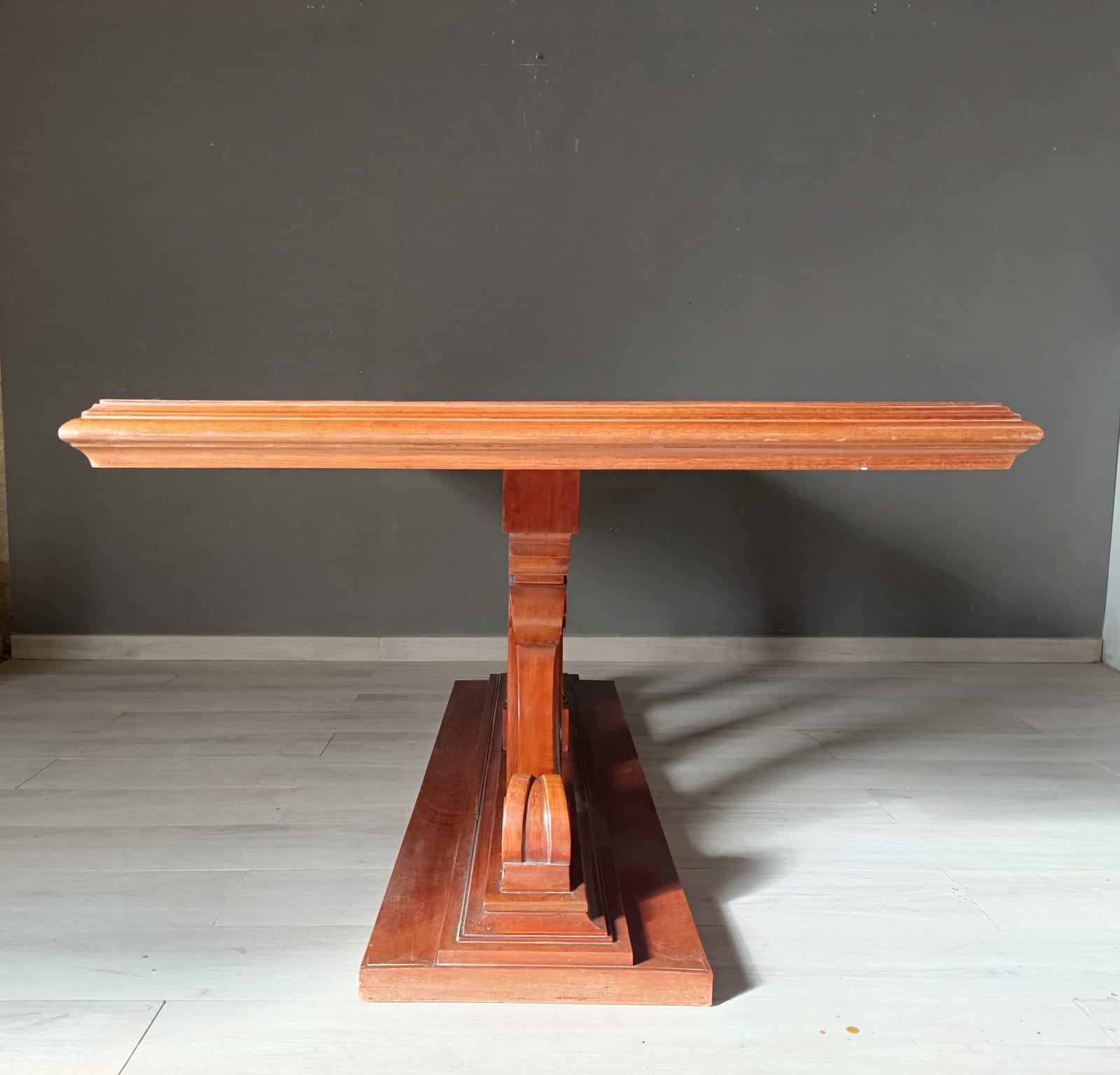 Tavolo da pranzo di forma rettangolare con struttura tipica dell’art-déco. Lavorato finemente con massello e piuma di mogano.