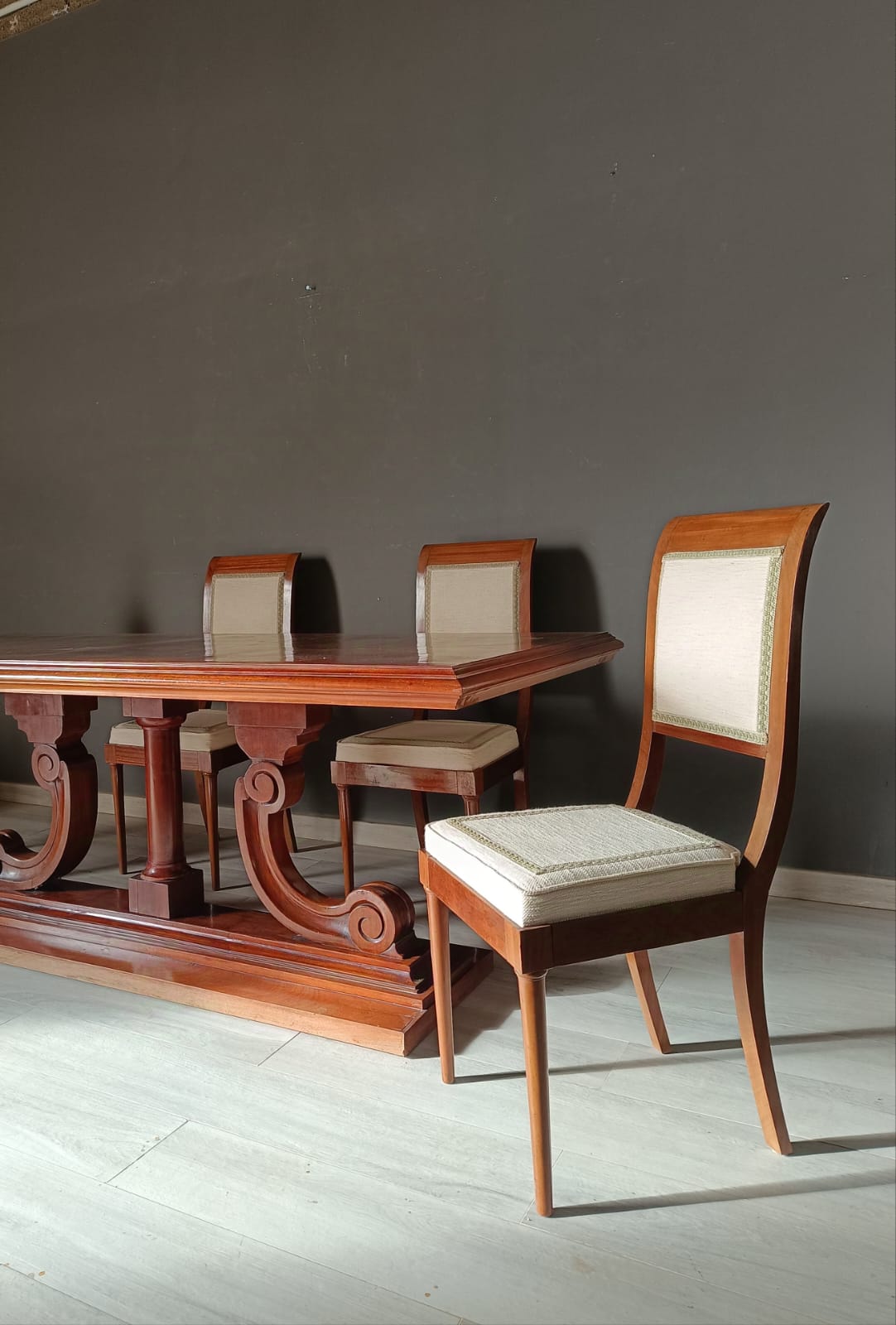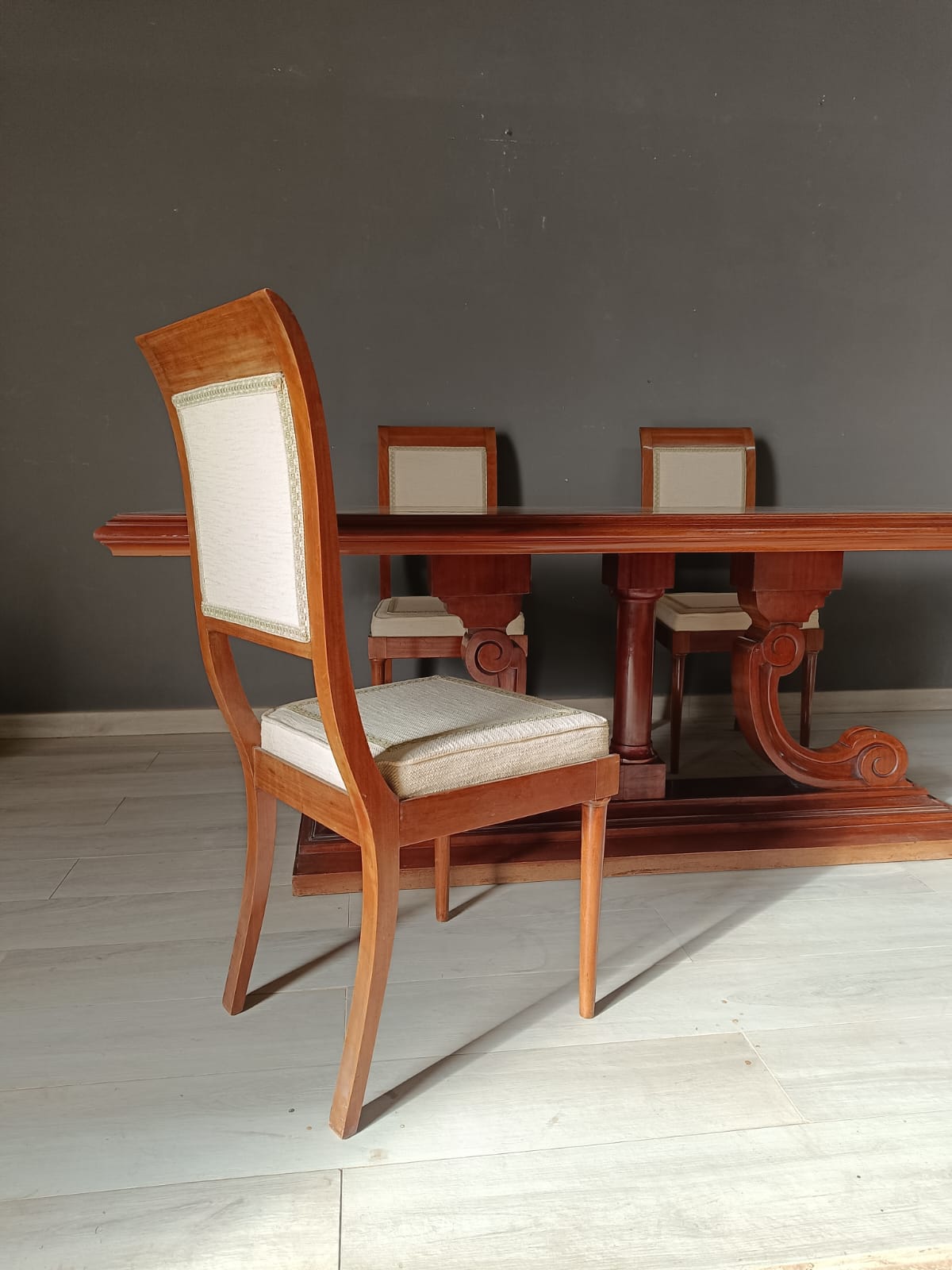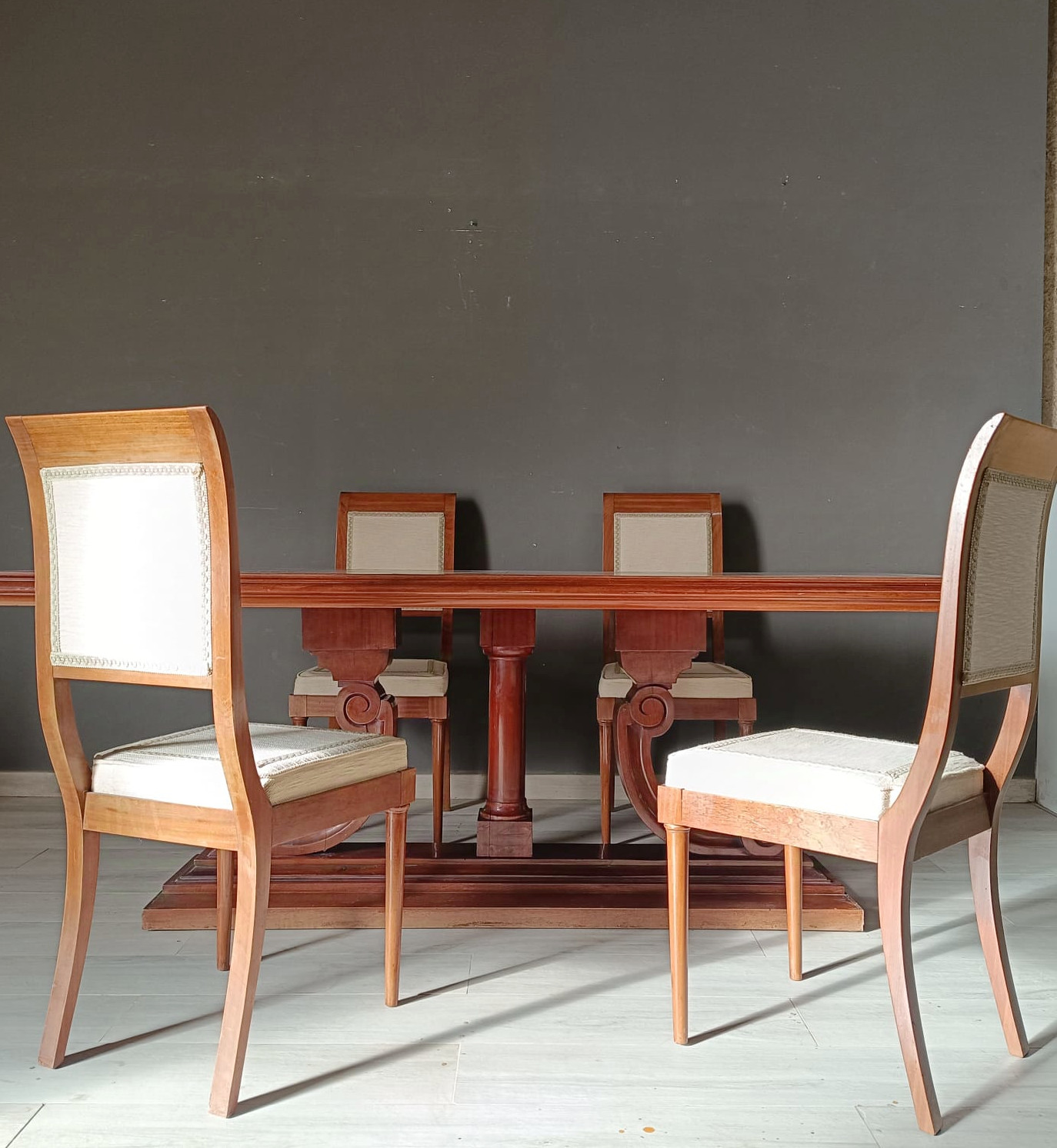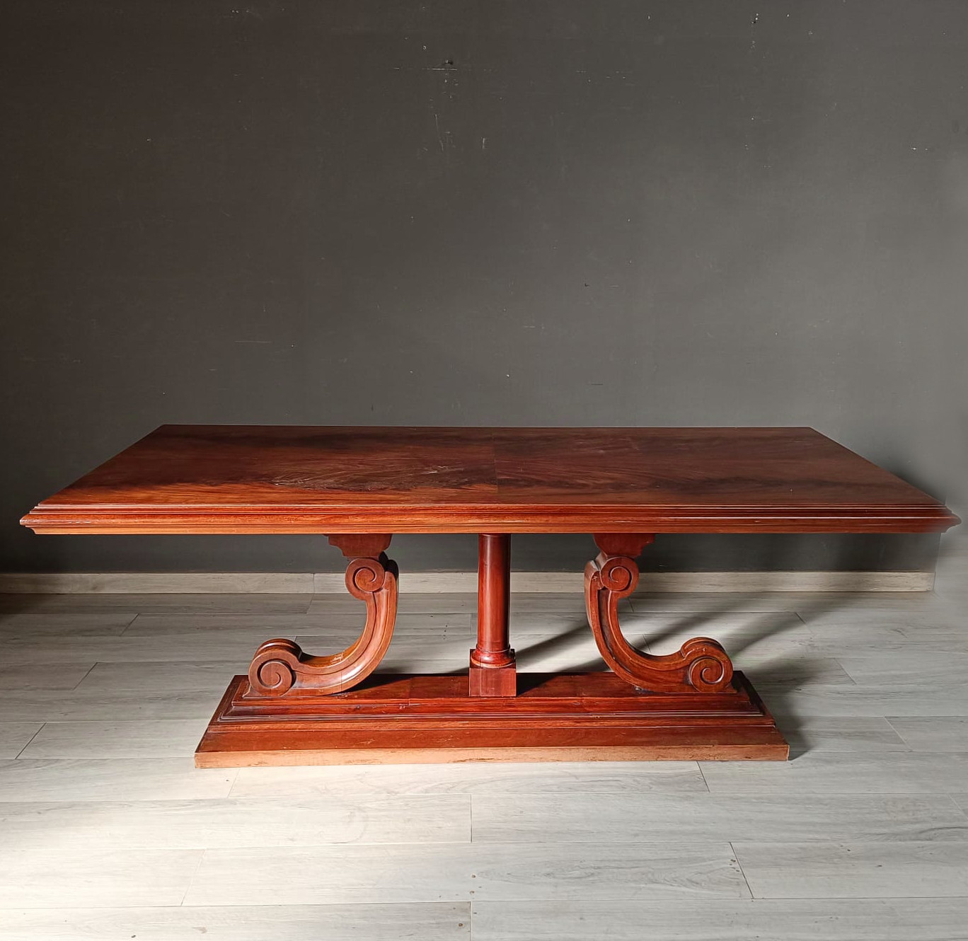 Tavolo da pranzo di forma rettangolare con struttura tipica dell’art-déco. Lavorato finemente con massello e piuma di mogano.