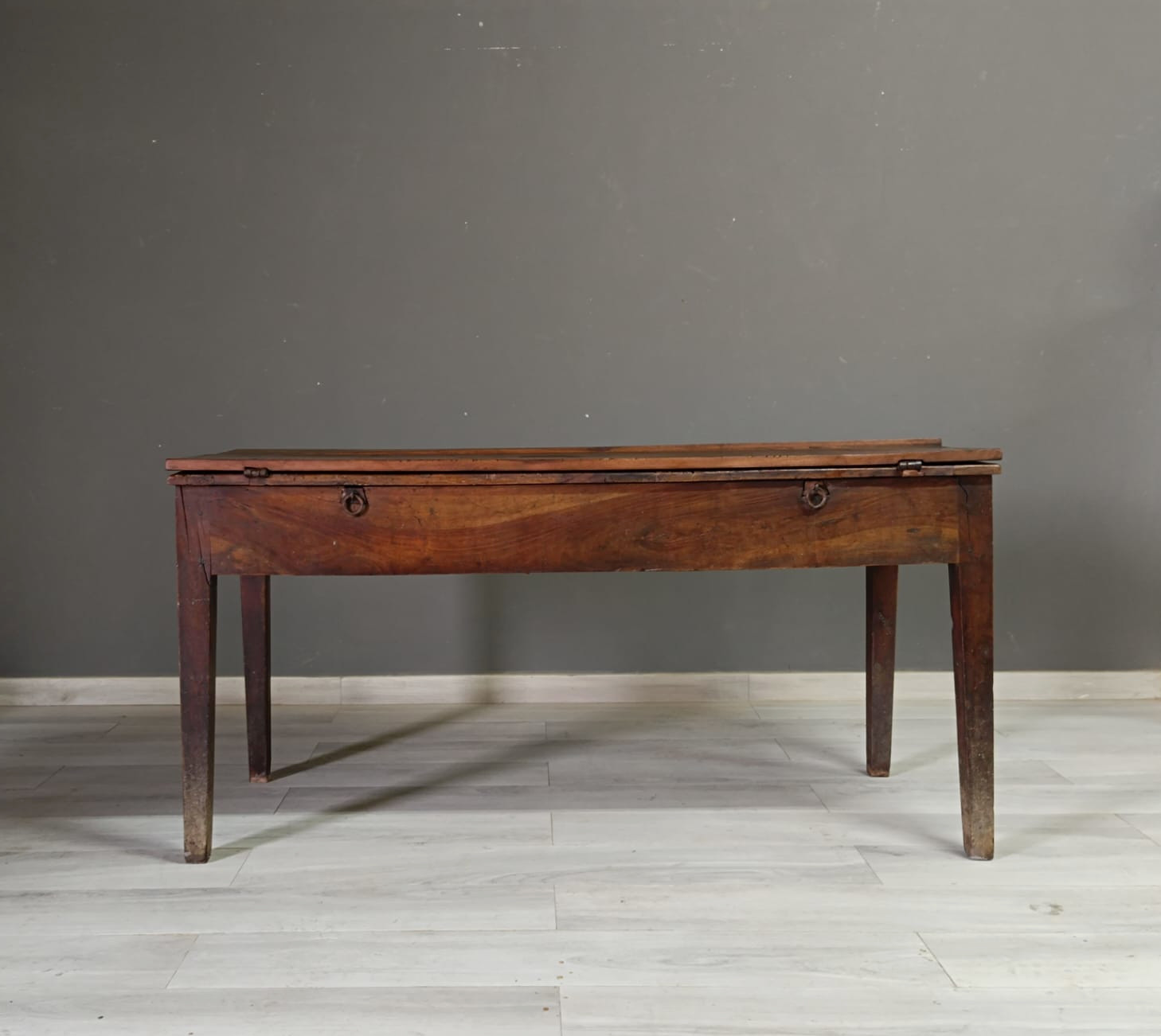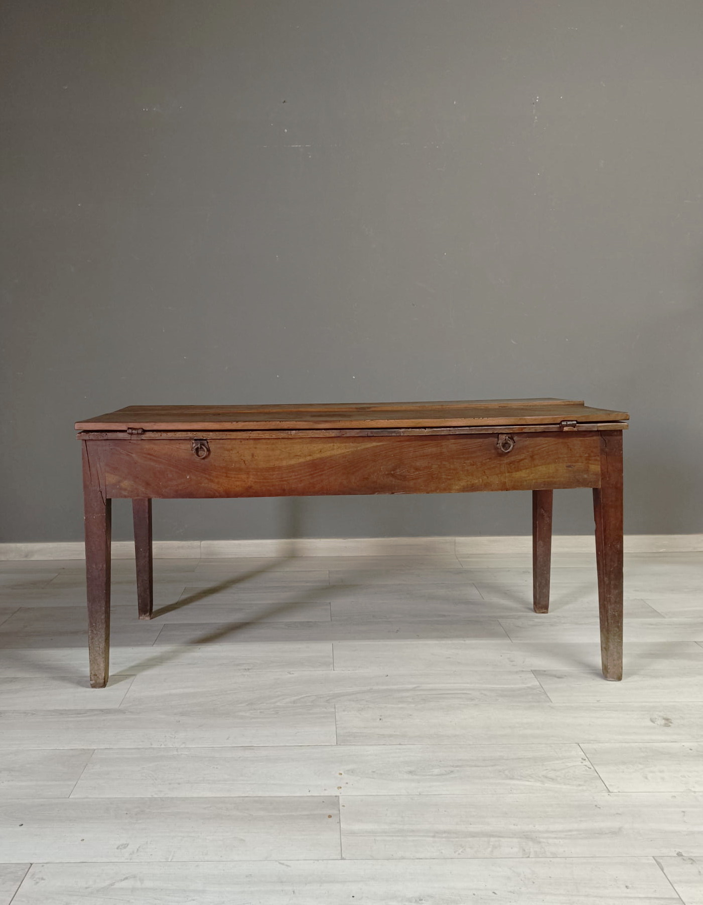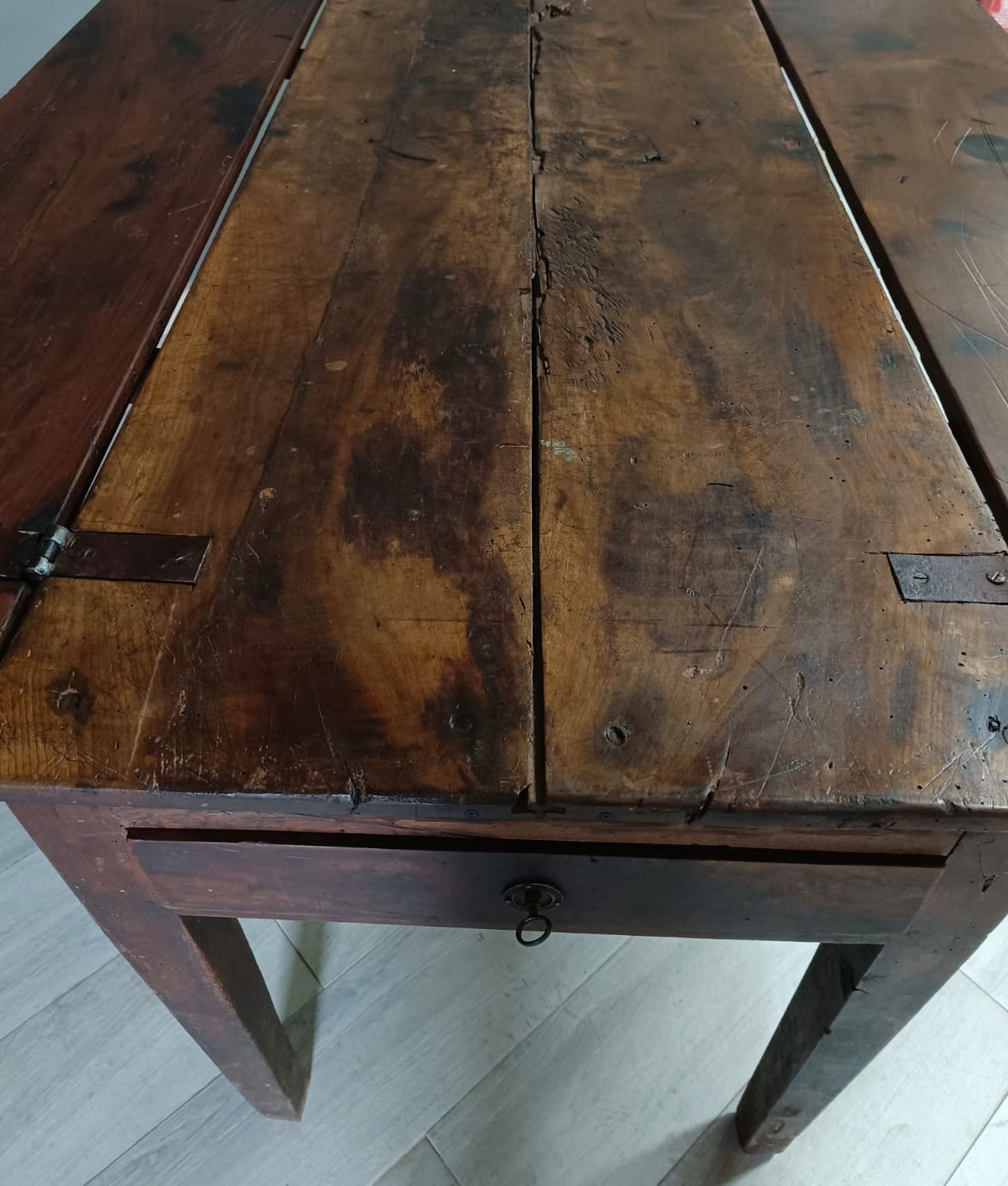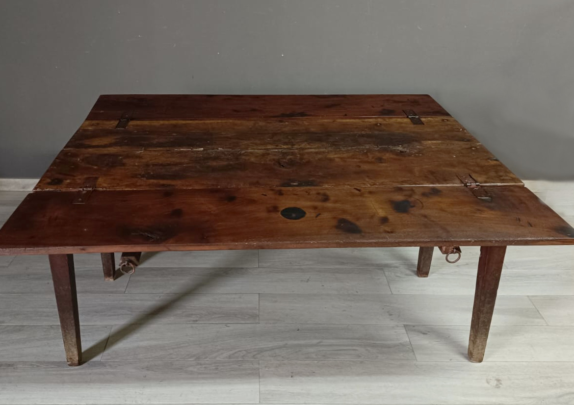 Importante tavolo contadino di ottima qualità realizzato in massello di noce di tipologia con apertura a libro. Lateralmente vi sono delle aste estraibili dettagliate con anelli in ferro forgiato, usate per poggiarci le tavole apribili. Sui due lati corti del tavolo vi sono due cassetti molto ampi, estraibili all’occorrenza e completi di chiave originale.