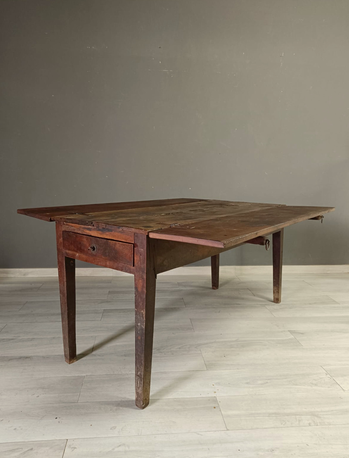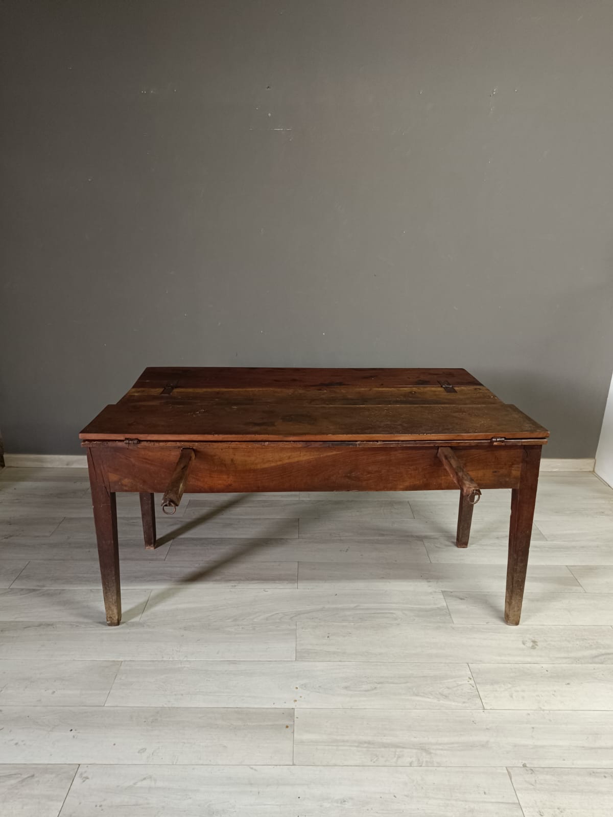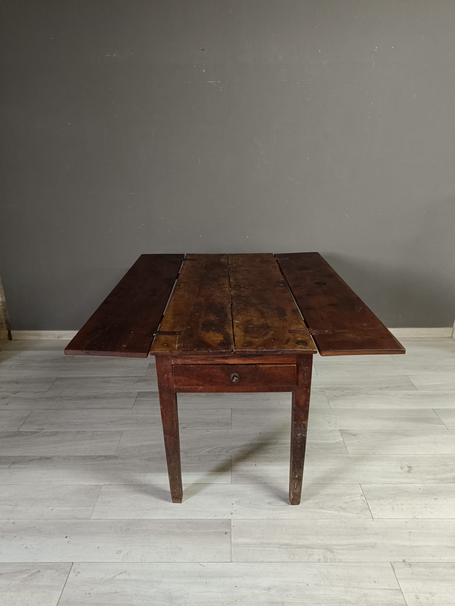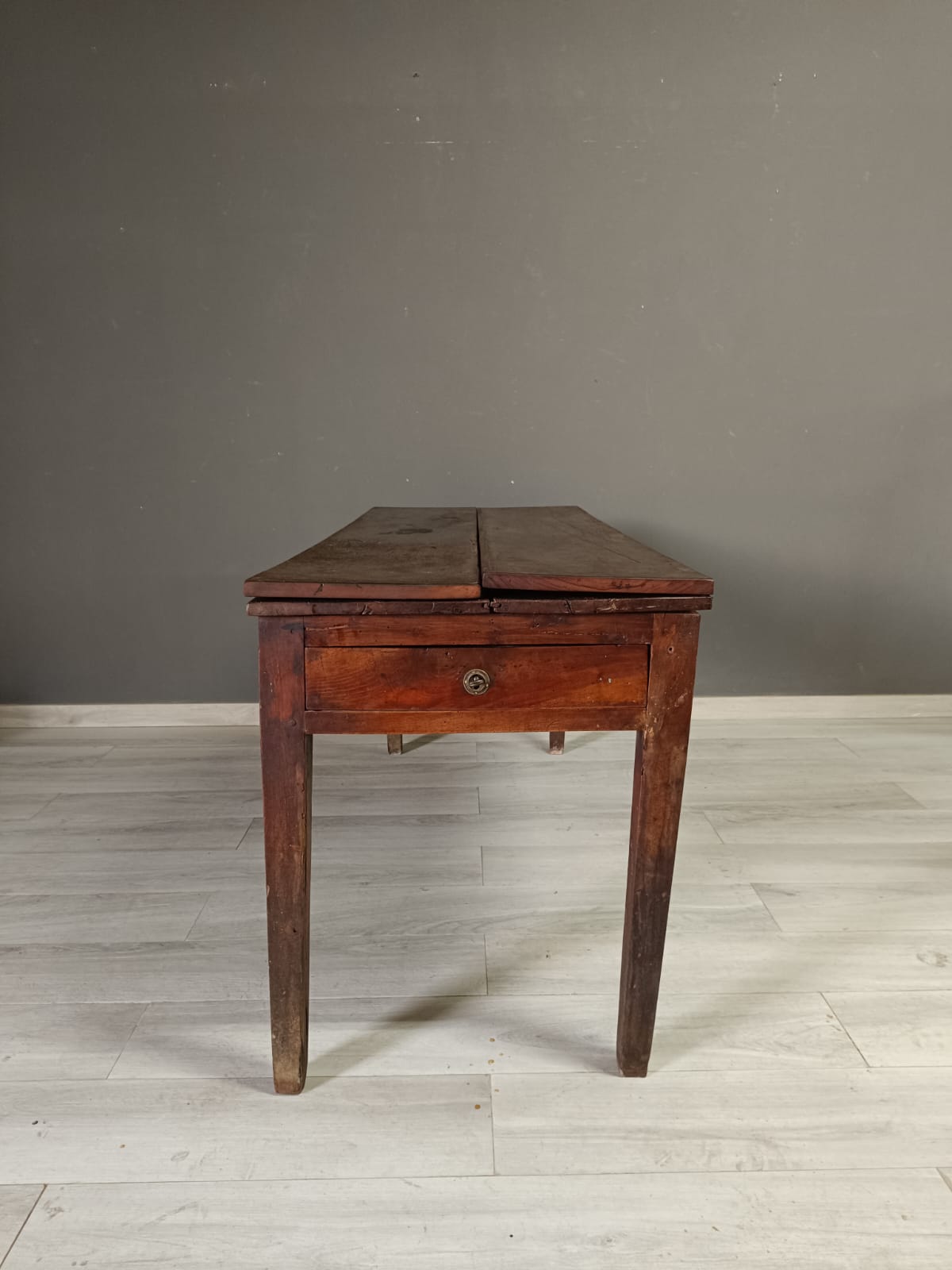 Importante tavolo contadino di ottima qualità realizzato in massello di noce di tipologia con apertura a libro. Lateralmente vi sono delle aste estraibili dettagliate con anelli in ferro forgiato, usate per poggiarci le tavole apribili. Sui due lati corti del tavolo vi sono due cassetti molto ampi, estraibili all’occorrenza e completi di chiave originale.