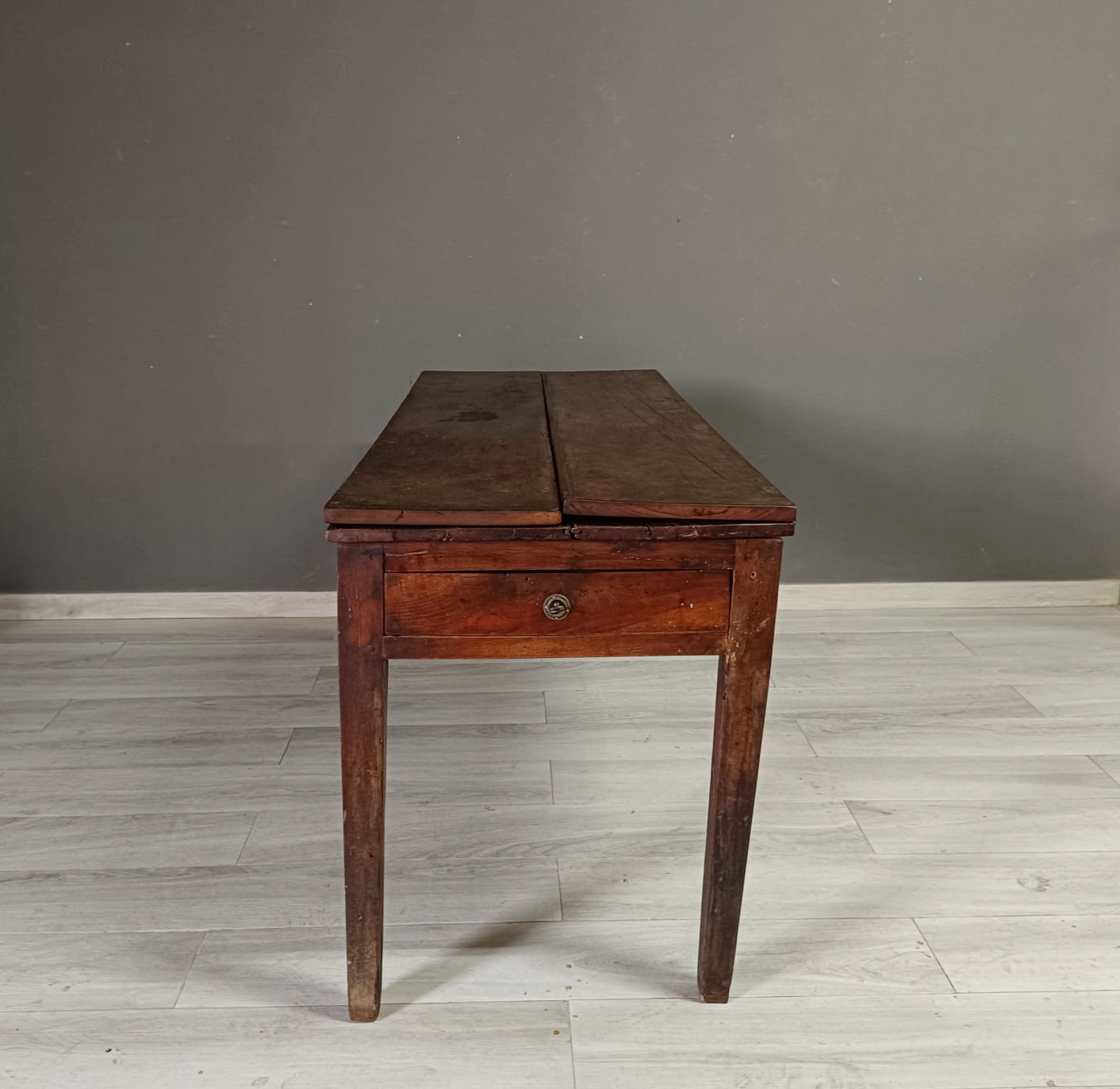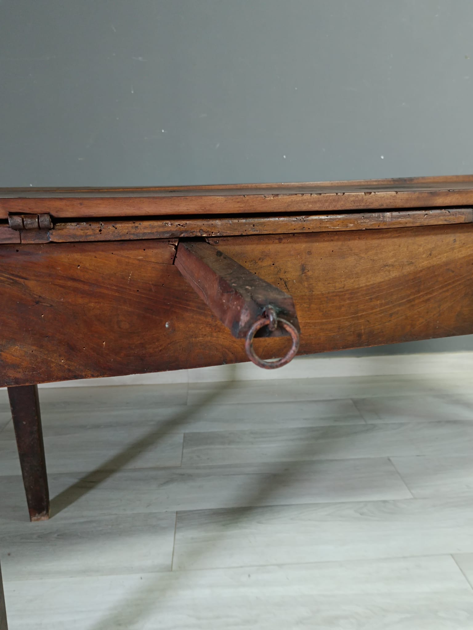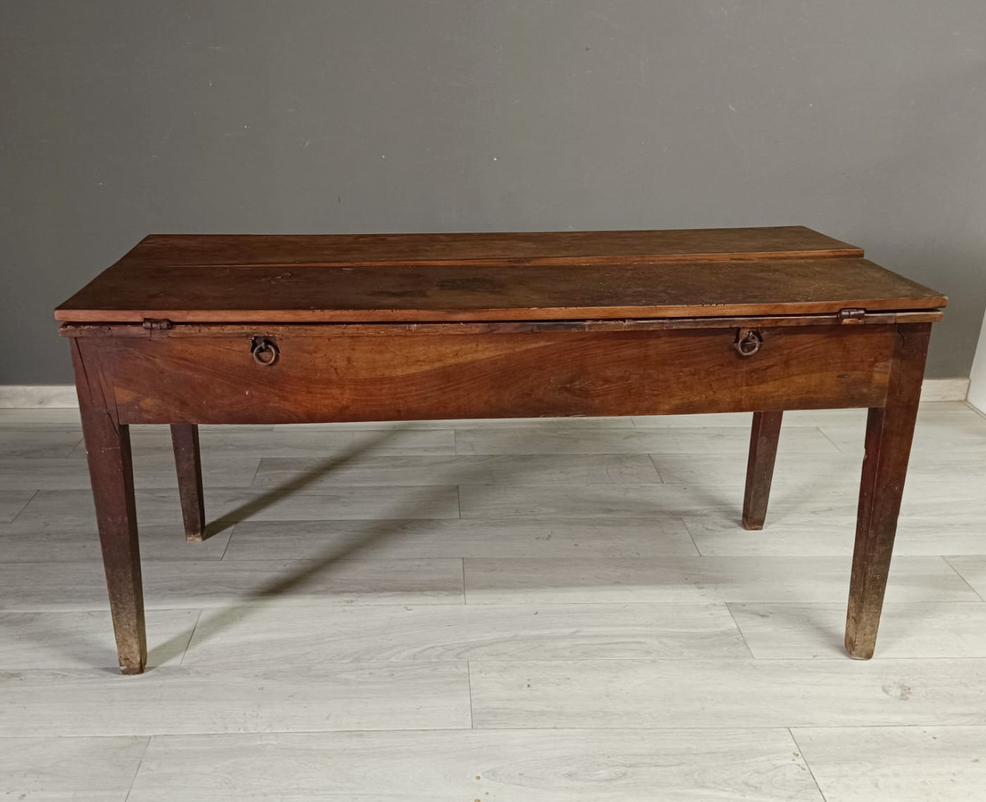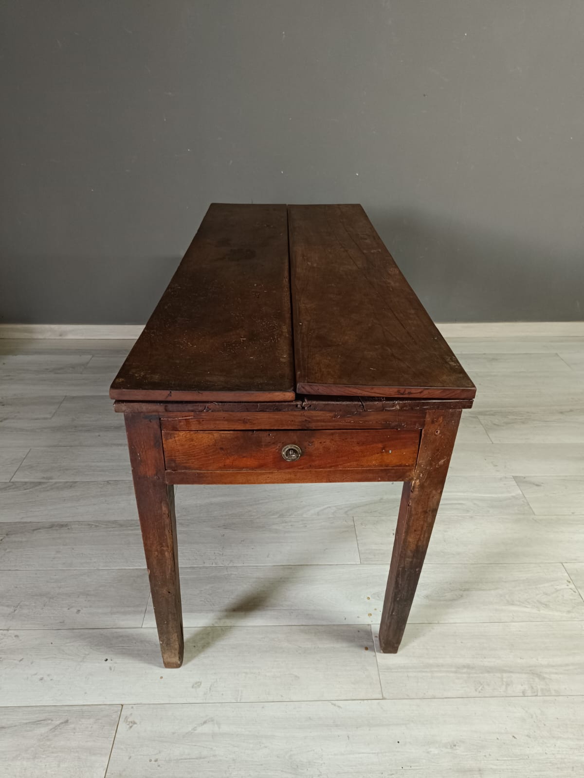 Importante tavolo contadino di ottima qualità realizzato in massello di noce di tipologia con apertura a libro. Lateralmente vi sono delle aste estraibili dettagliate con anelli in ferro forgiato, usate per poggiarci le tavole apribili. Sui due lati corti del tavolo vi sono due cassetti molto ampi, estraibili all’occorrenza e completi di chiave originale.