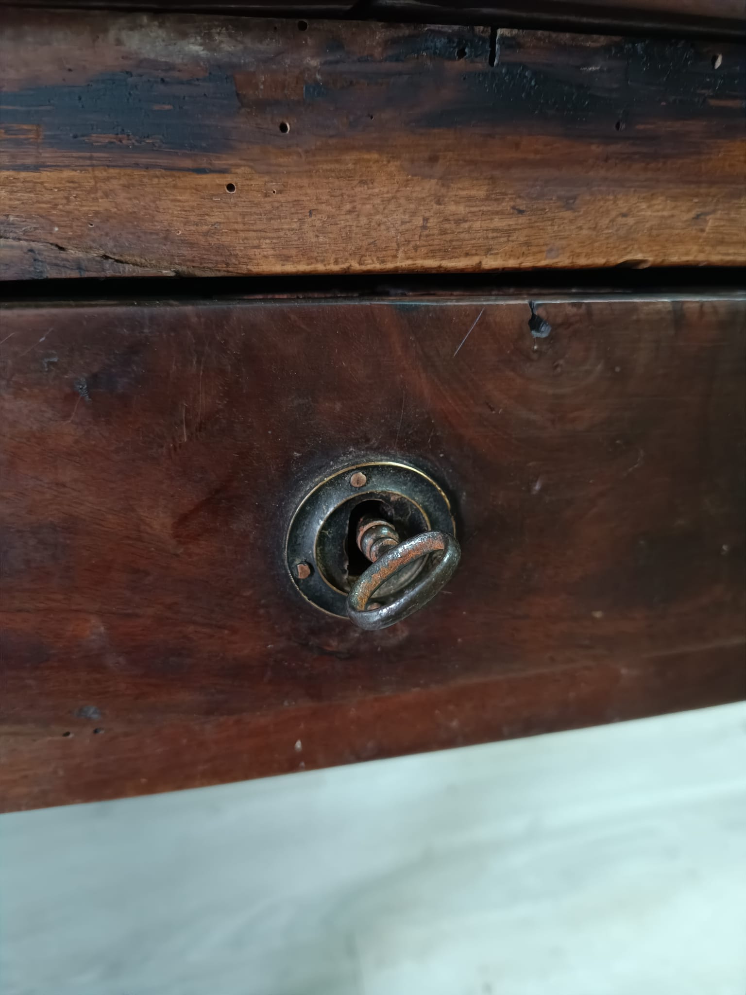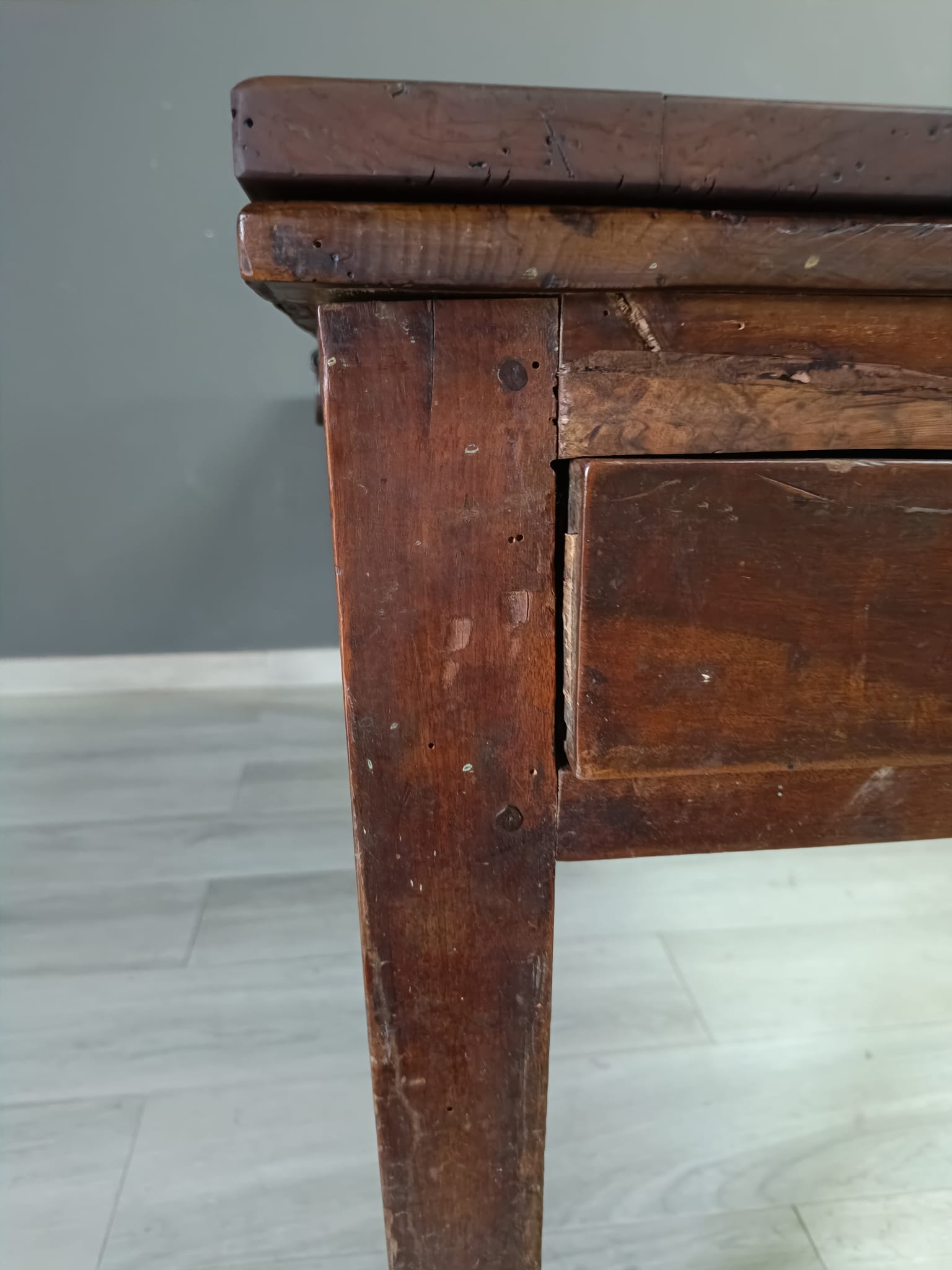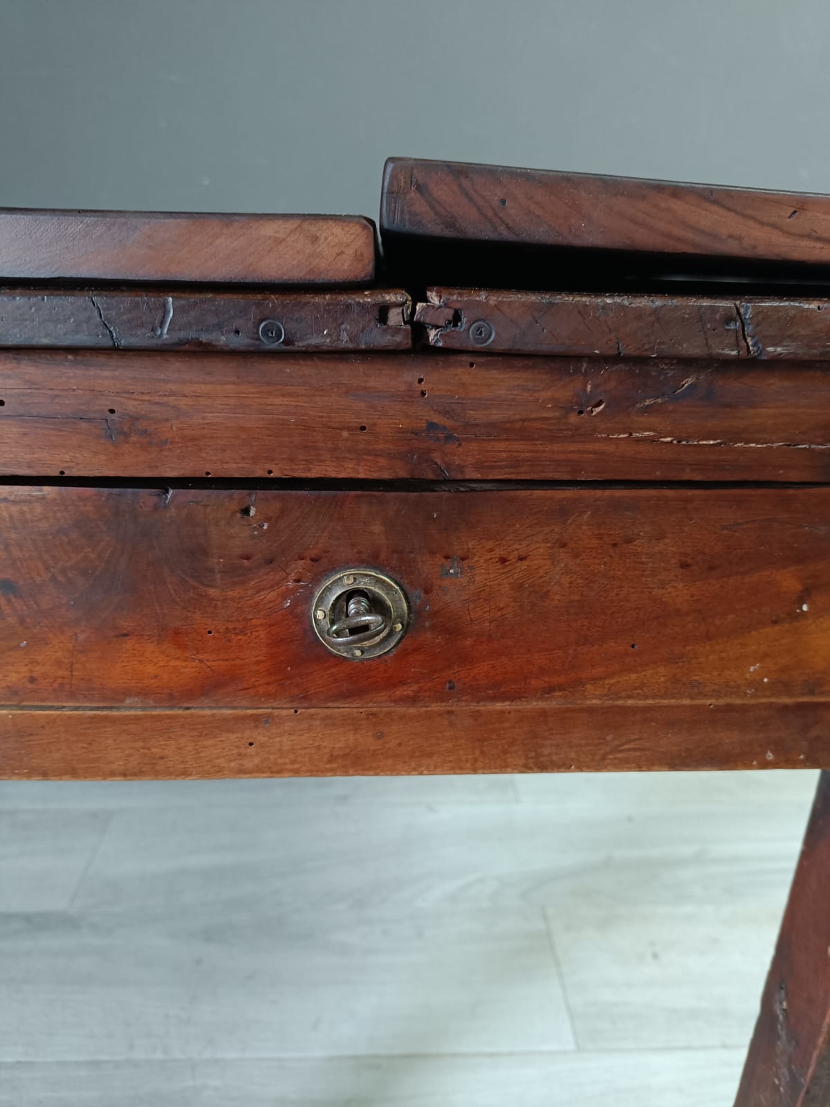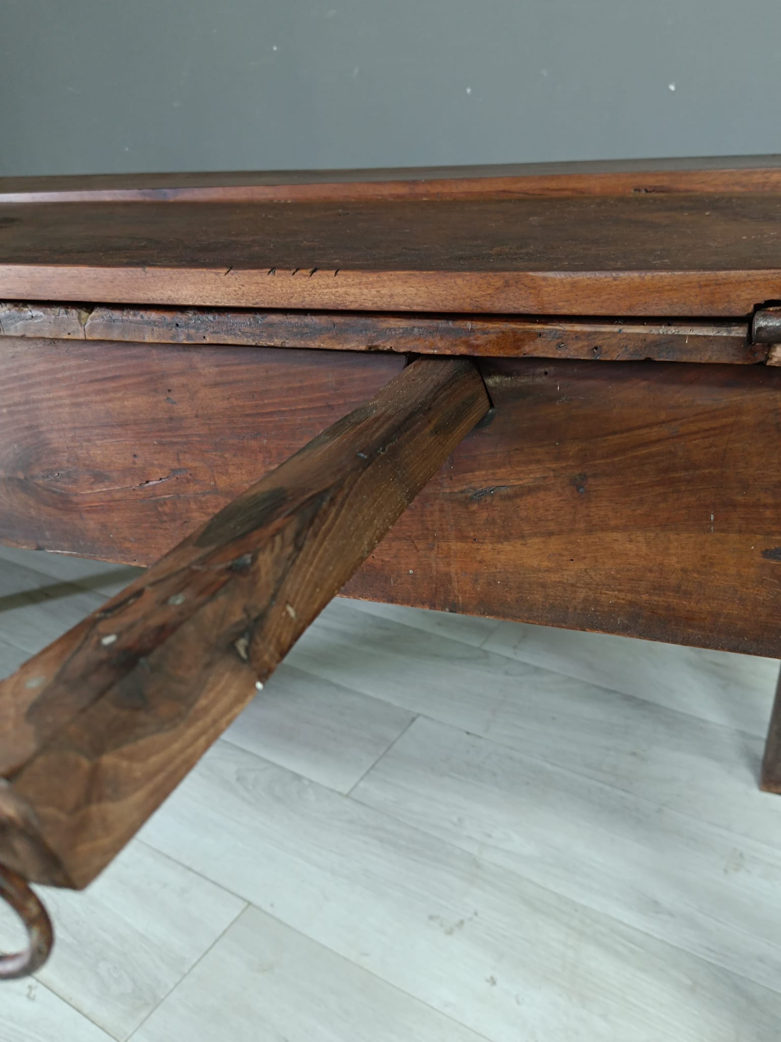 Importante tavolo contadino di ottima qualità realizzato in massello di noce di tipologia con apertura a libro. Lateralmente vi sono delle aste estraibili dettagliate con anelli in ferro forgiato, usate per poggiarci le tavole apribili. Sui due lati corti del tavolo vi sono due cassetti molto ampi, estraibili all’occorrenza e completi di chiave originale.