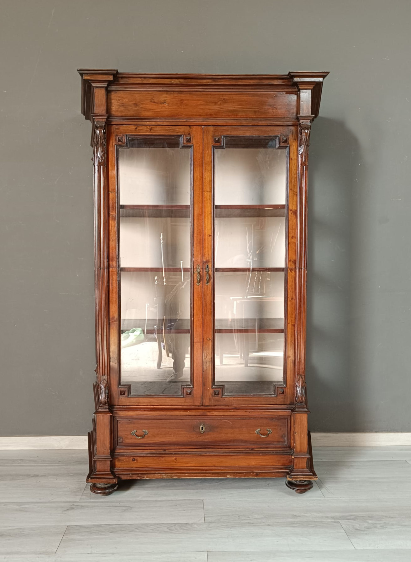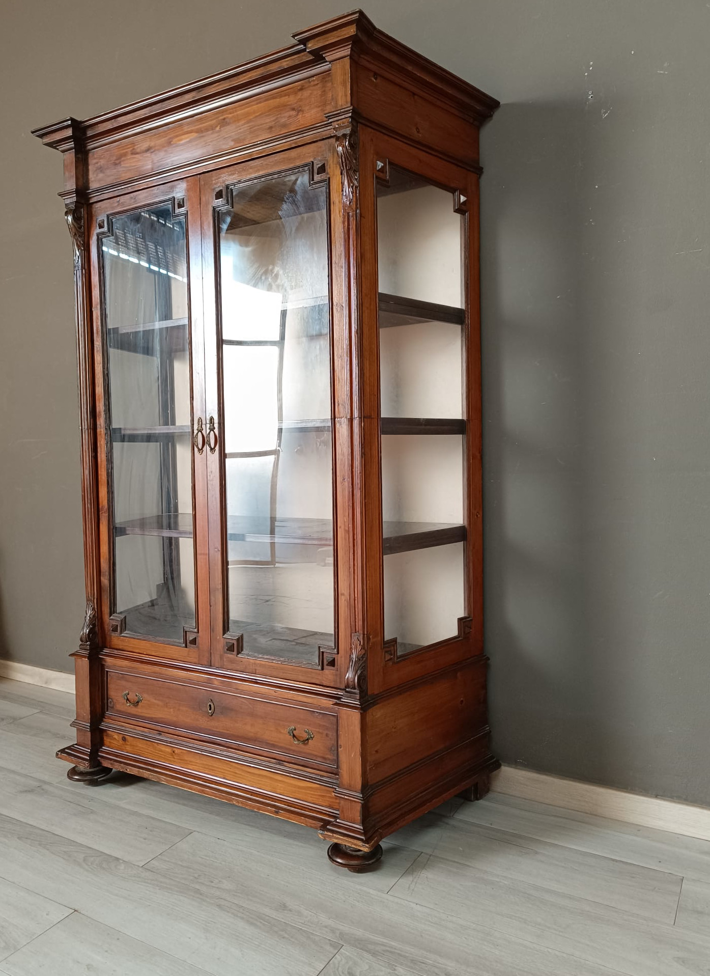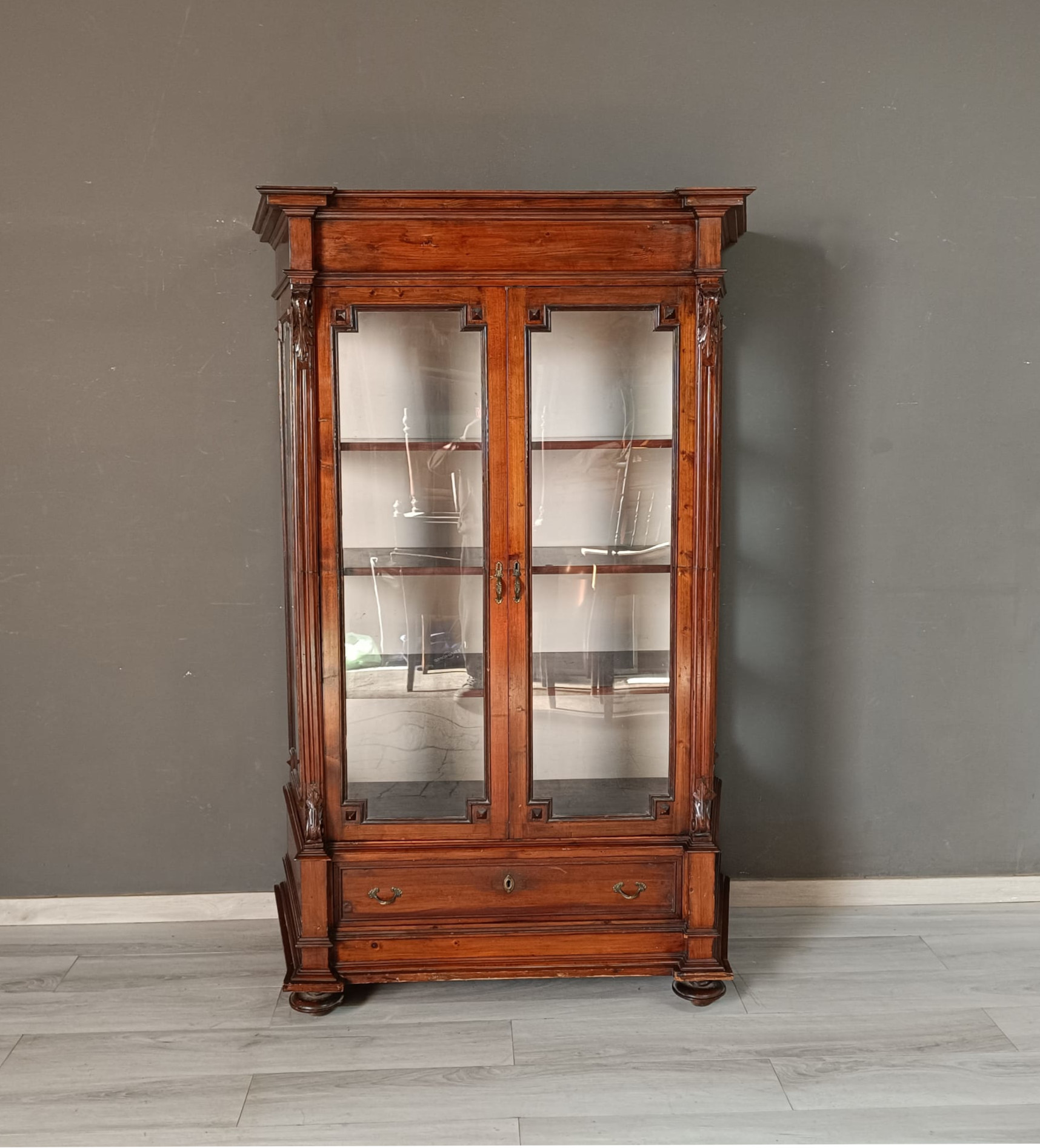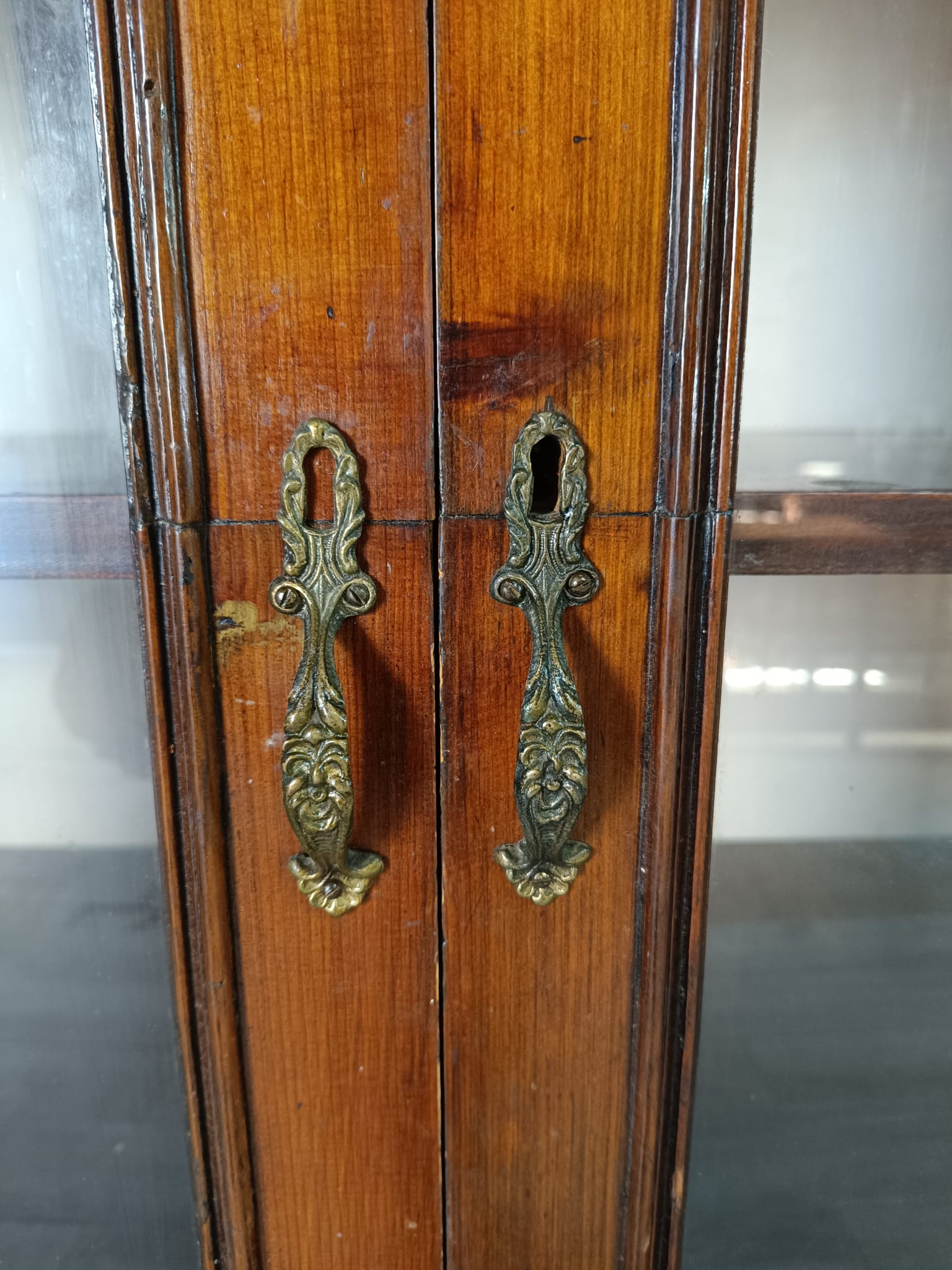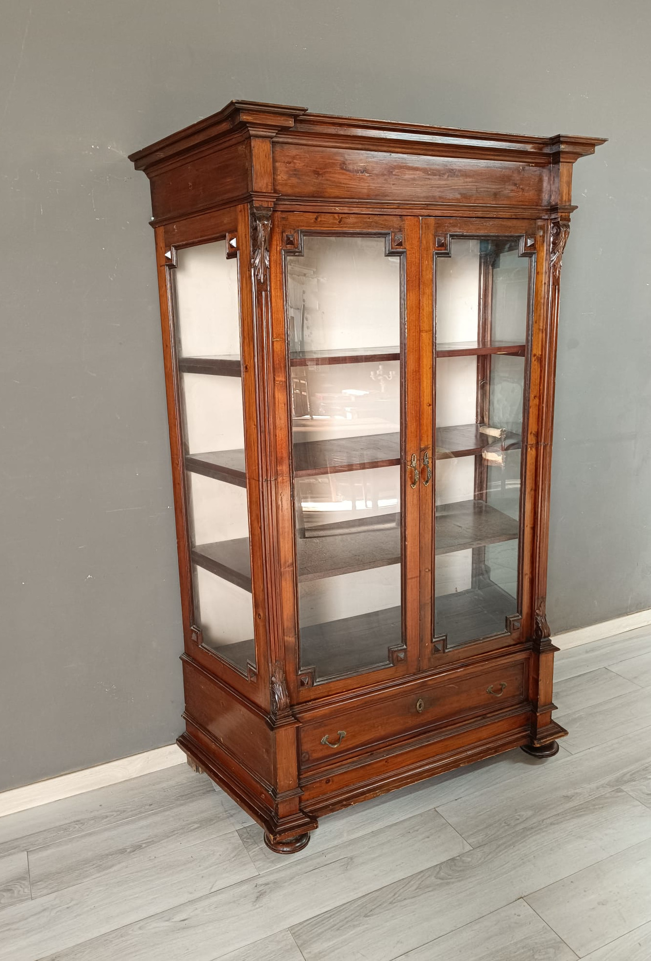 Bellissima vetrinetta di epoca Liberty scantonata con vetri soffiati. Si presenta con due ante e tre mensole interne per la parte a giorno, ed un cassetto sottostante. In ottimo stato conservativo.
