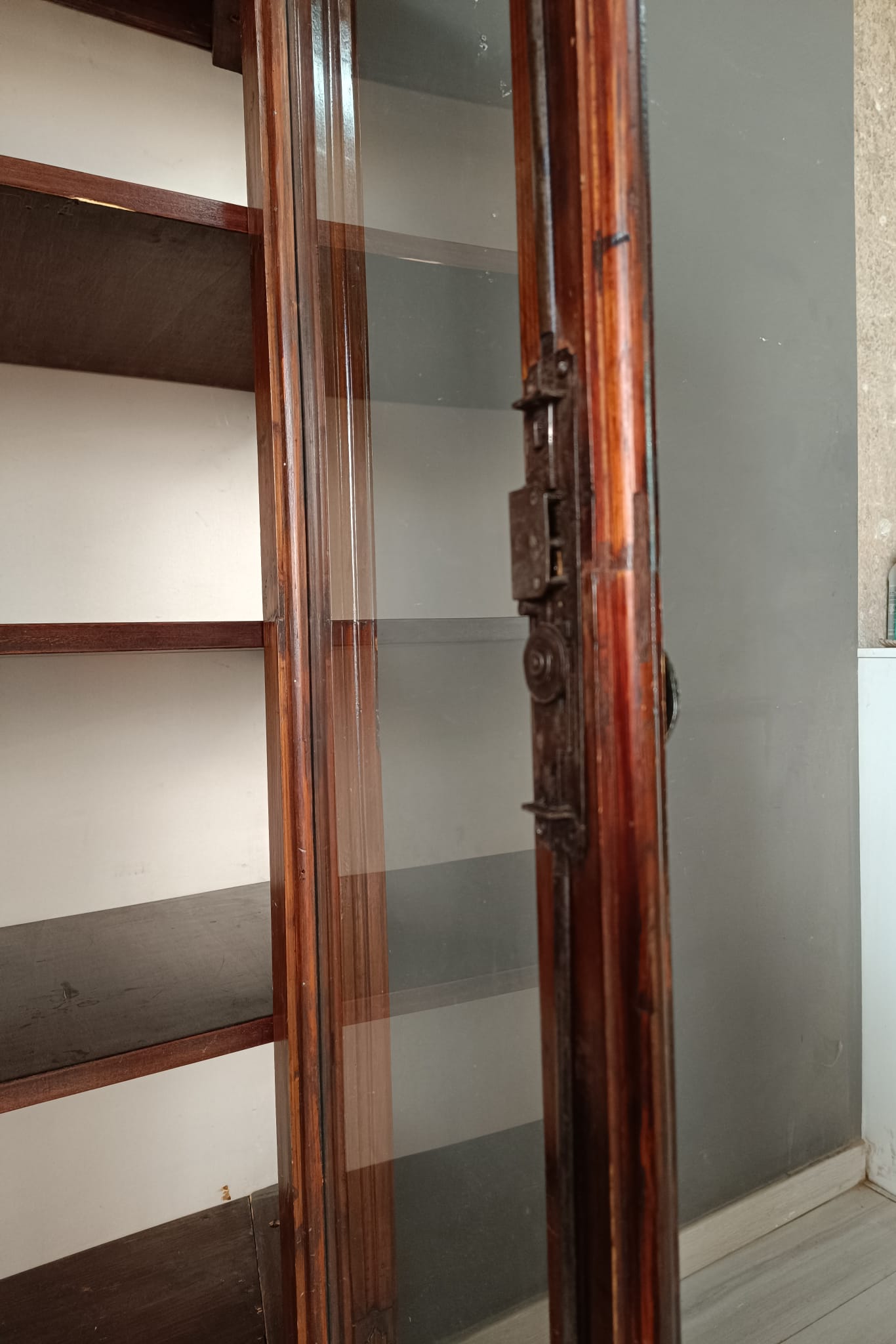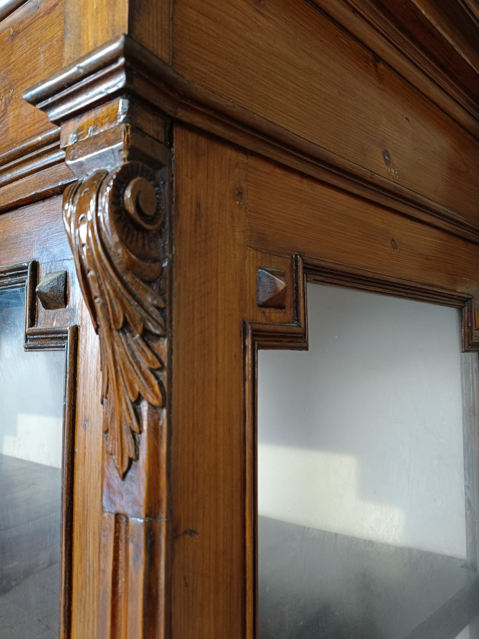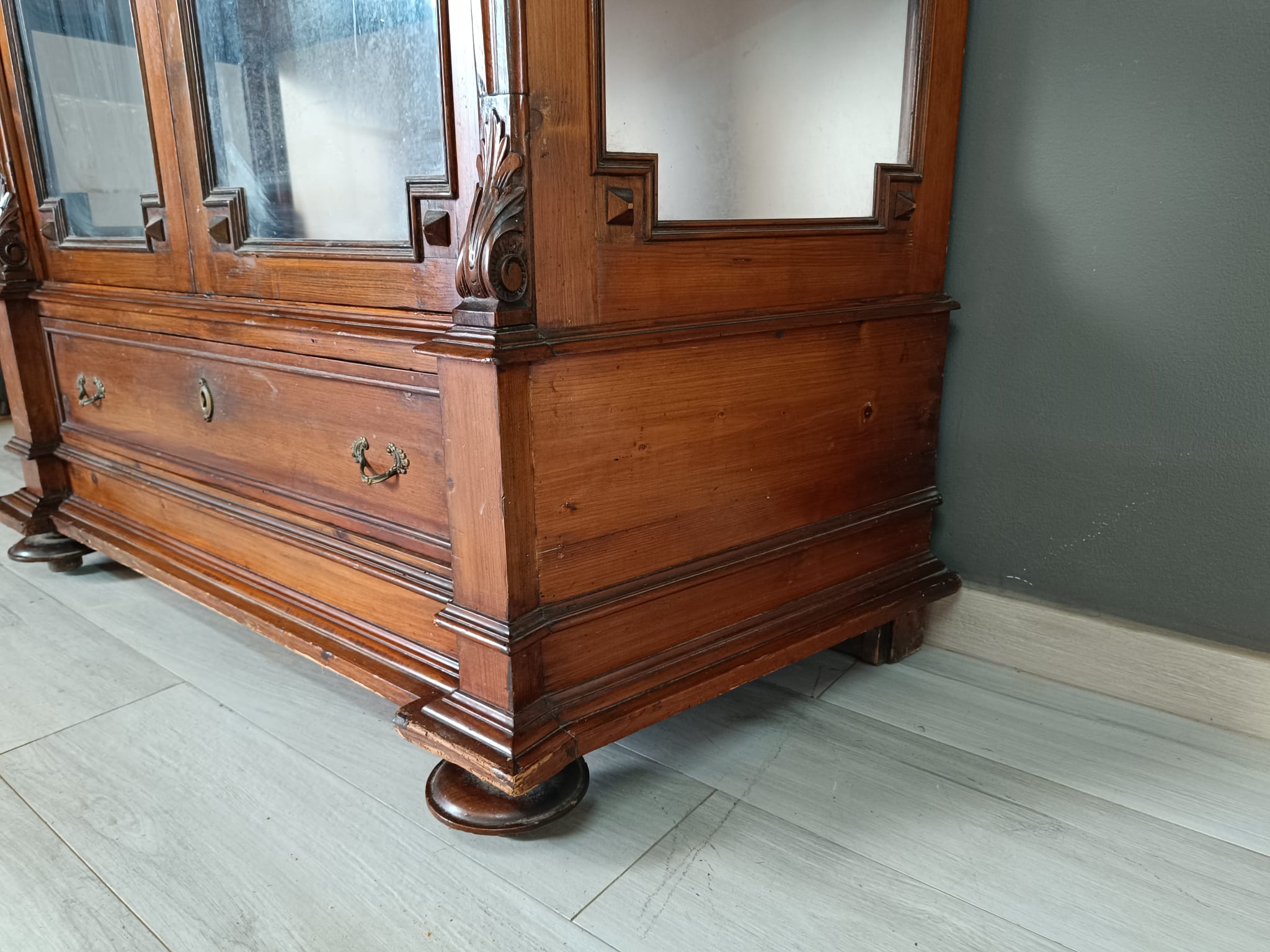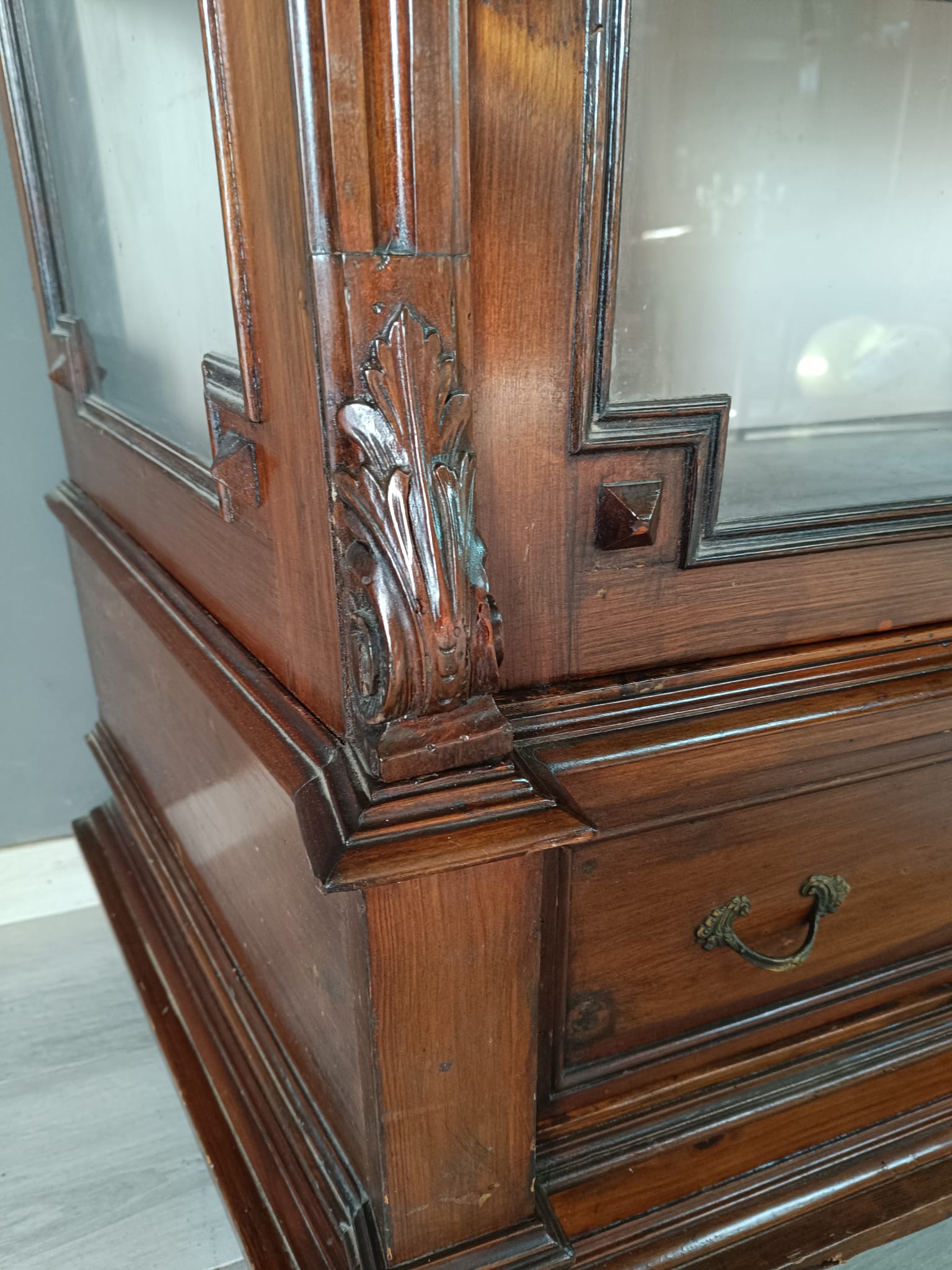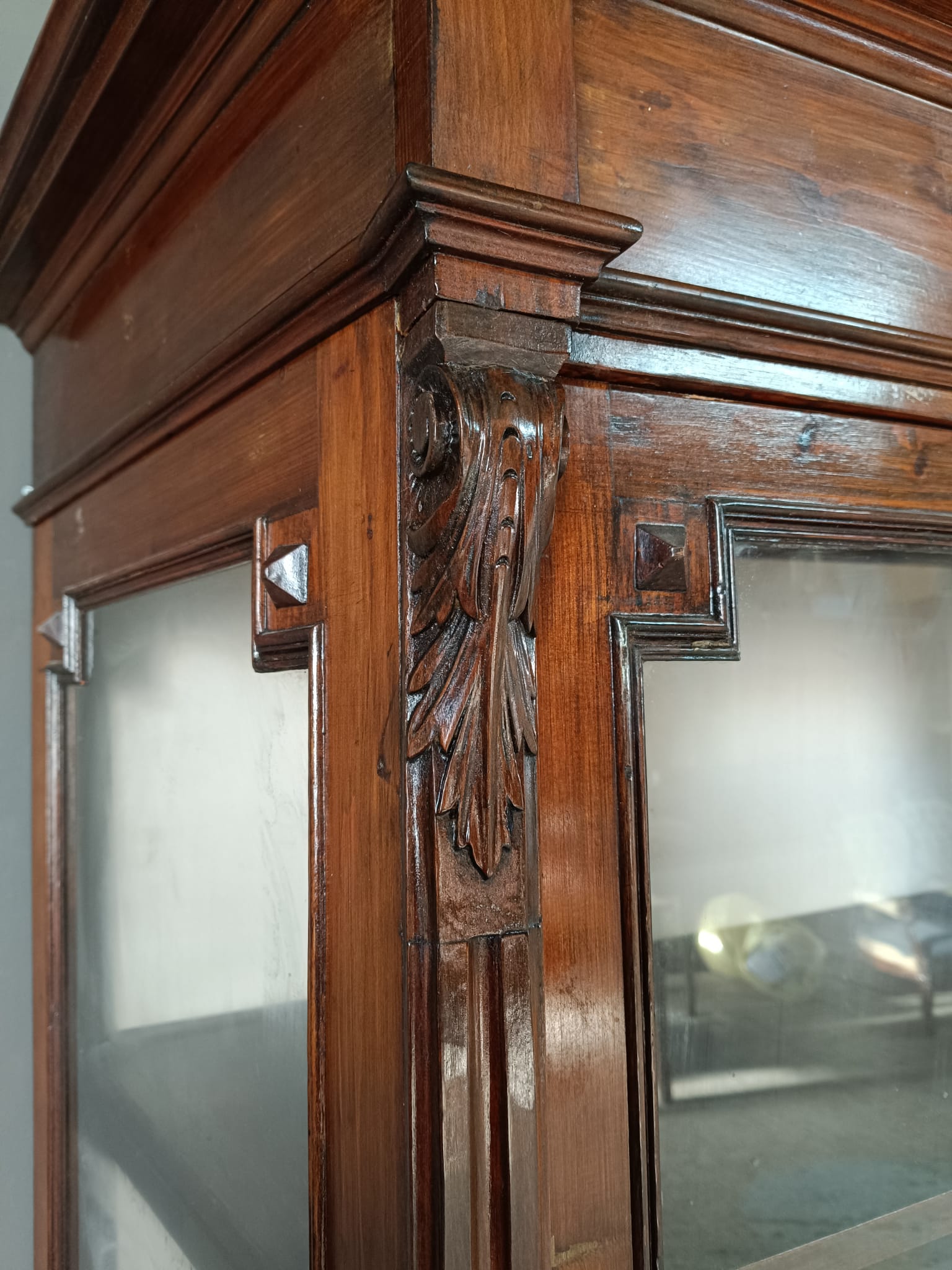 Bellissima vetrinetta di epoca Liberty scantonata con vetri soffiati. Si presenta con due ante e tre mensole interne per la parte a giorno, ed un cassetto sottostante. In ottimo stato conservativo.