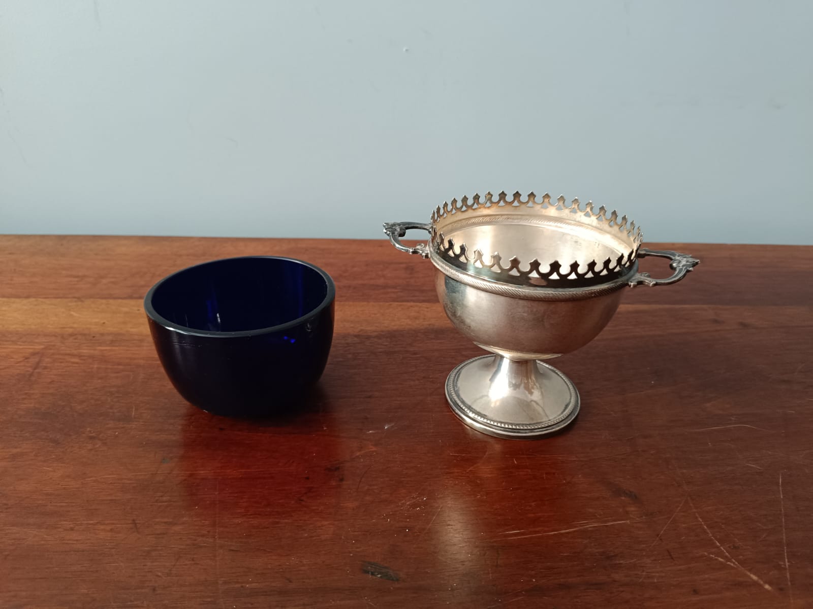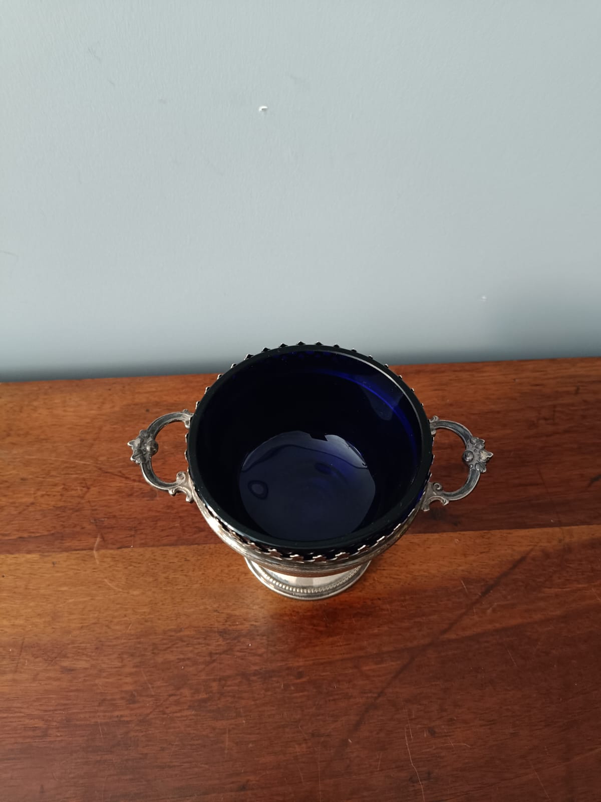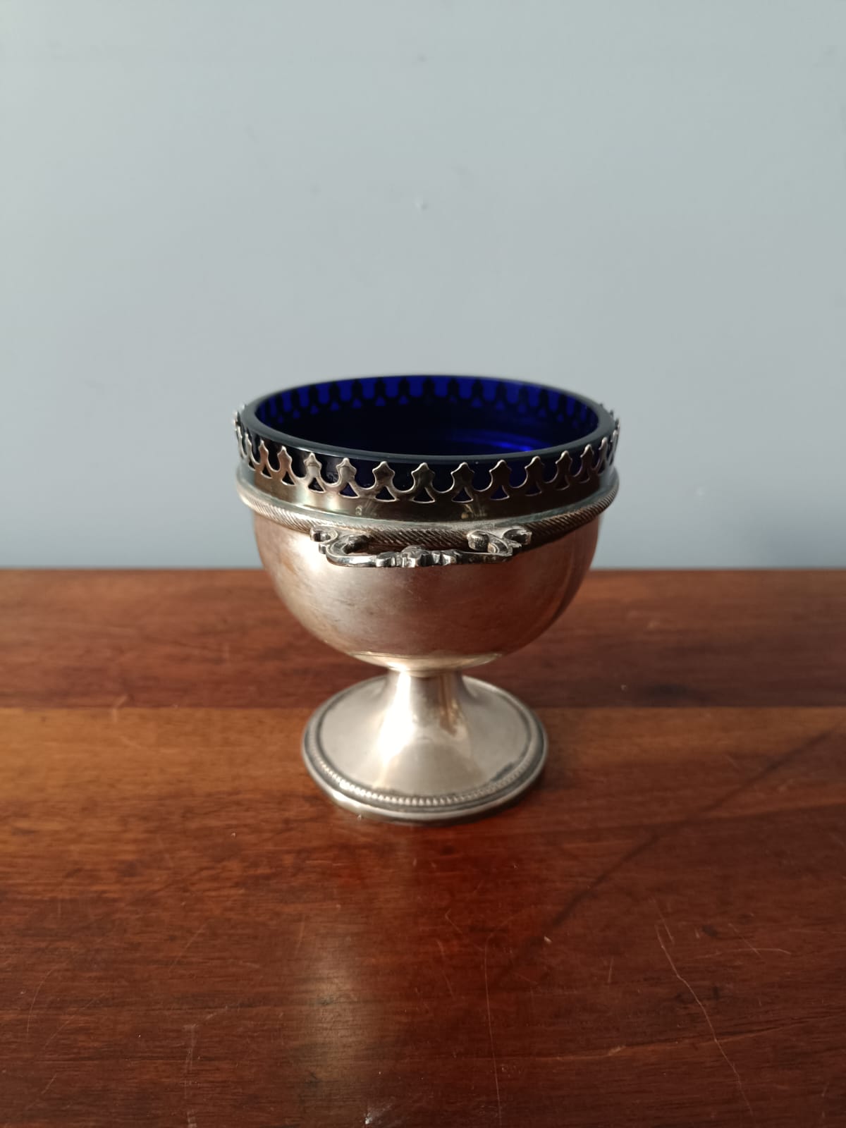 Antica saliera in argento con cristallo blu dei primi del Novecento in ottime condizioni.