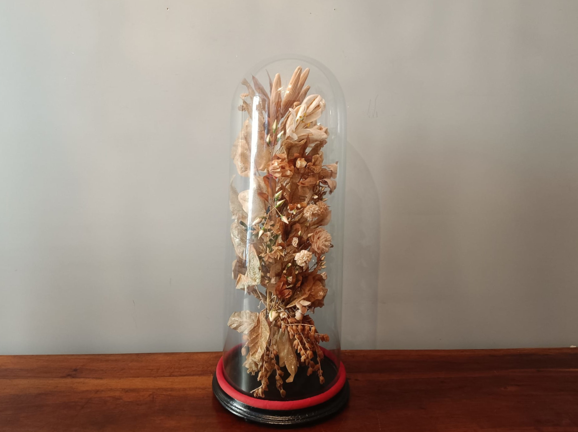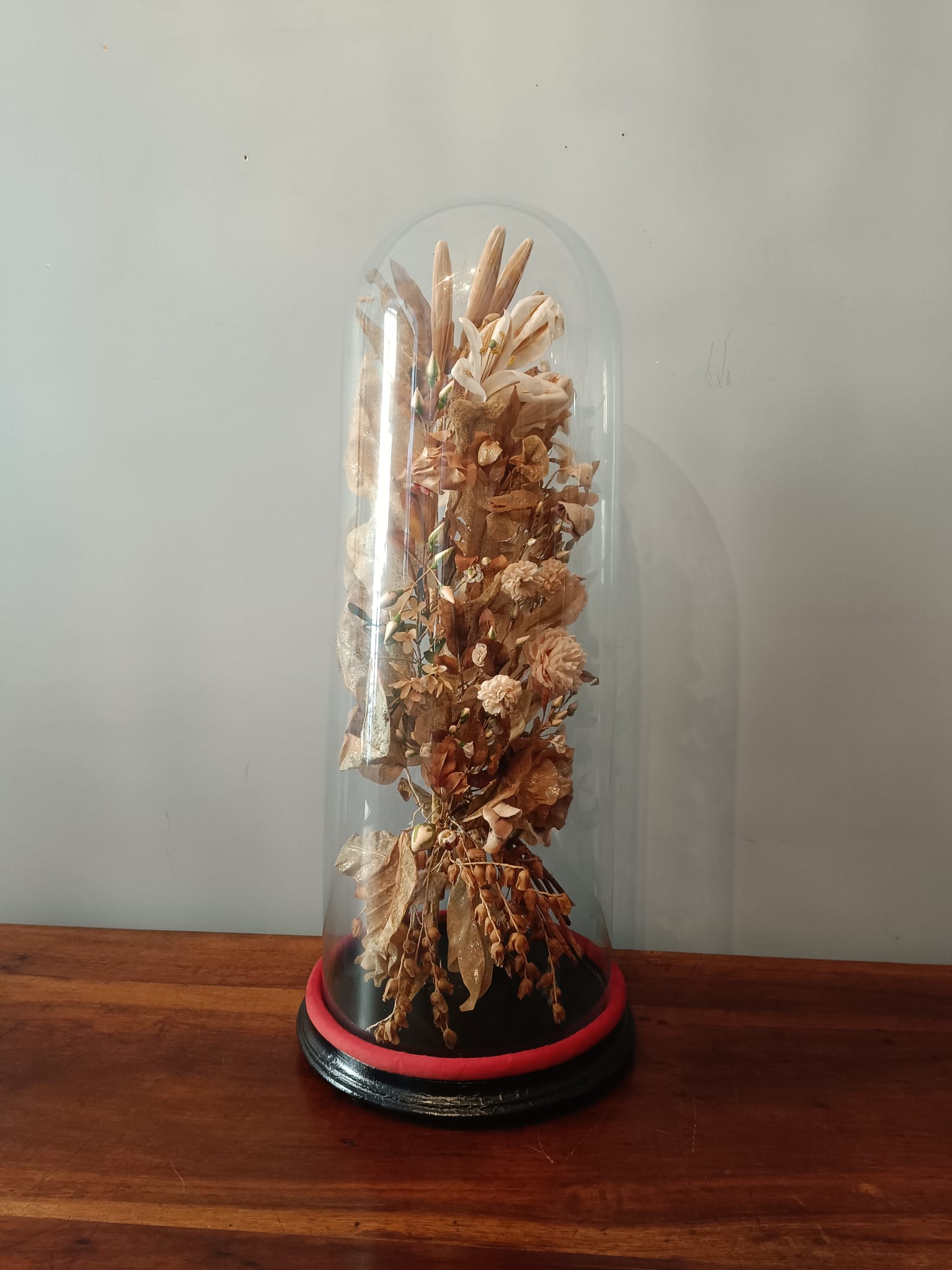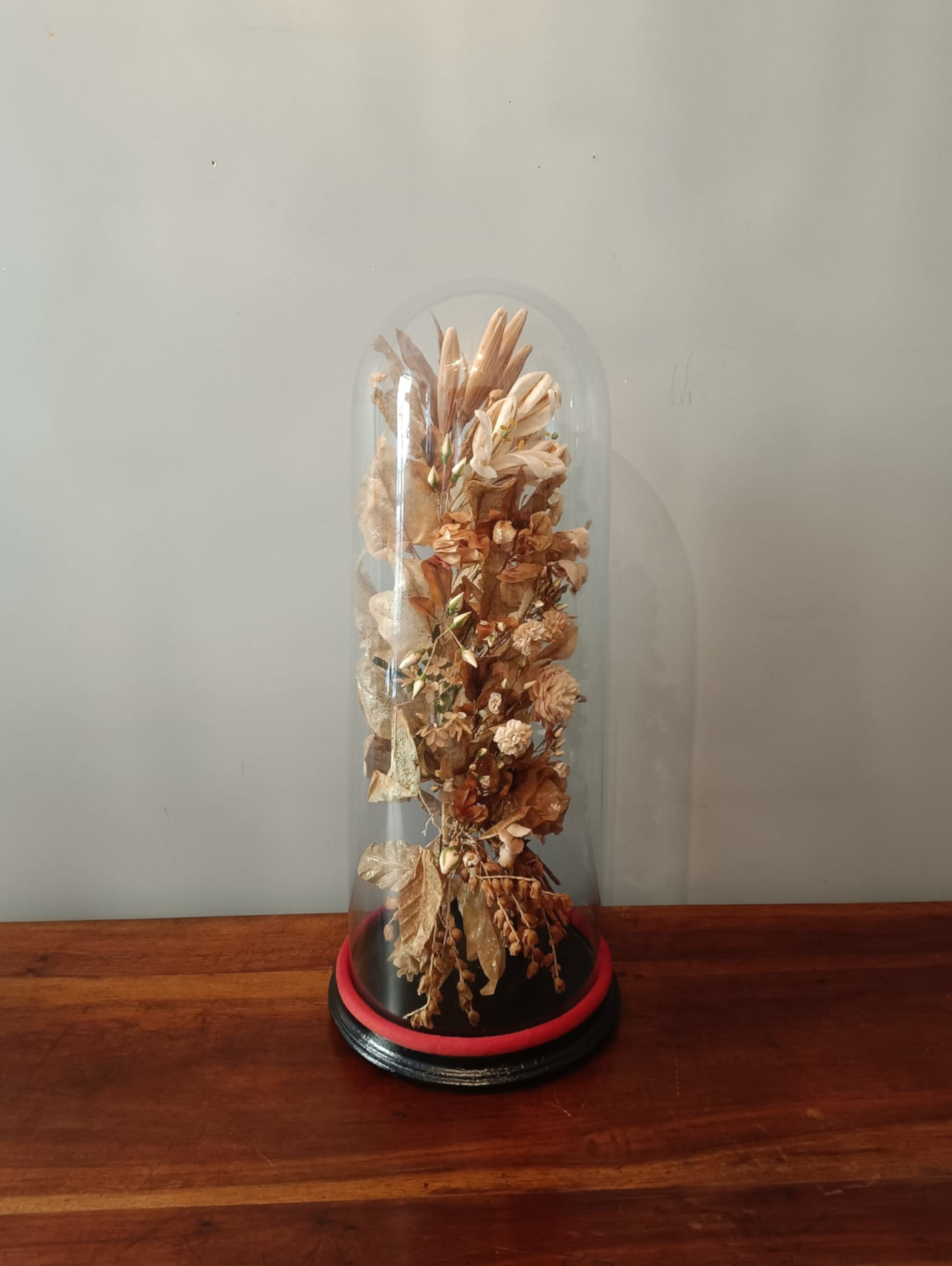 Antica campana in vetro soffiato contenente all’interno fiori pieghettati in tessuto sorretti da un gambo in legno.