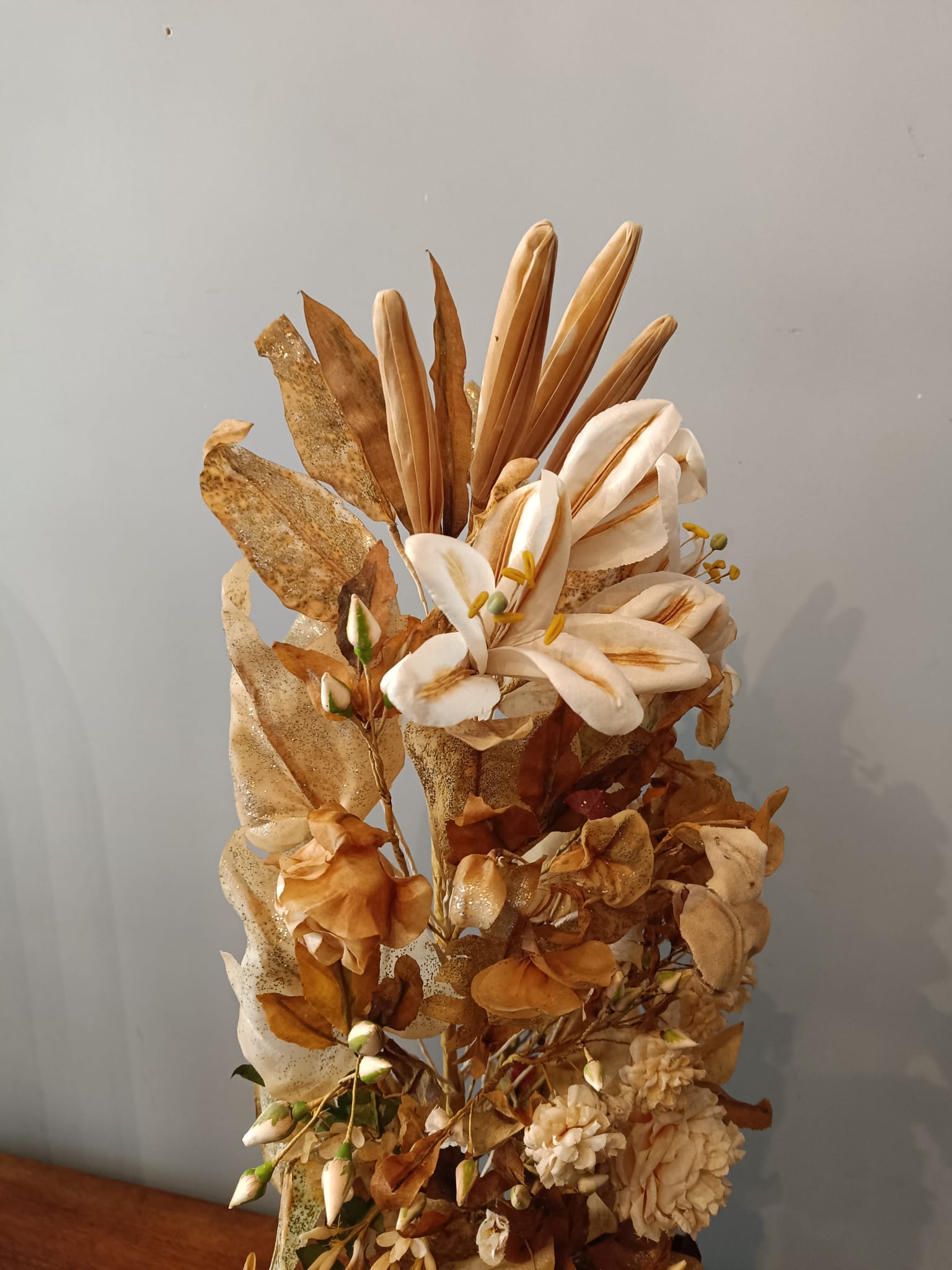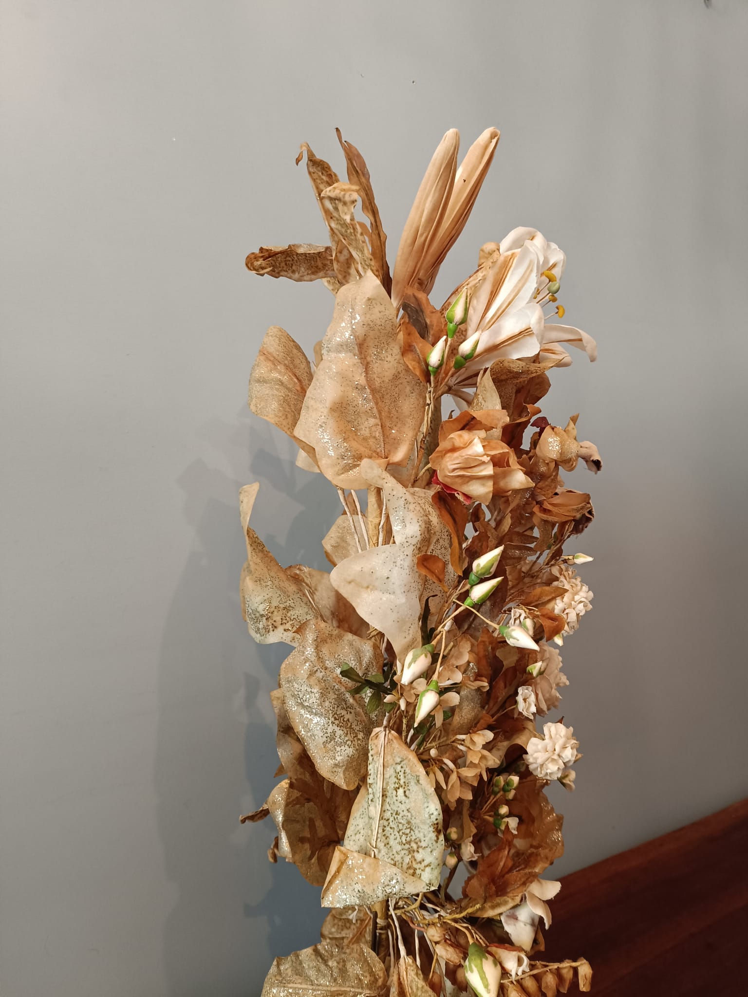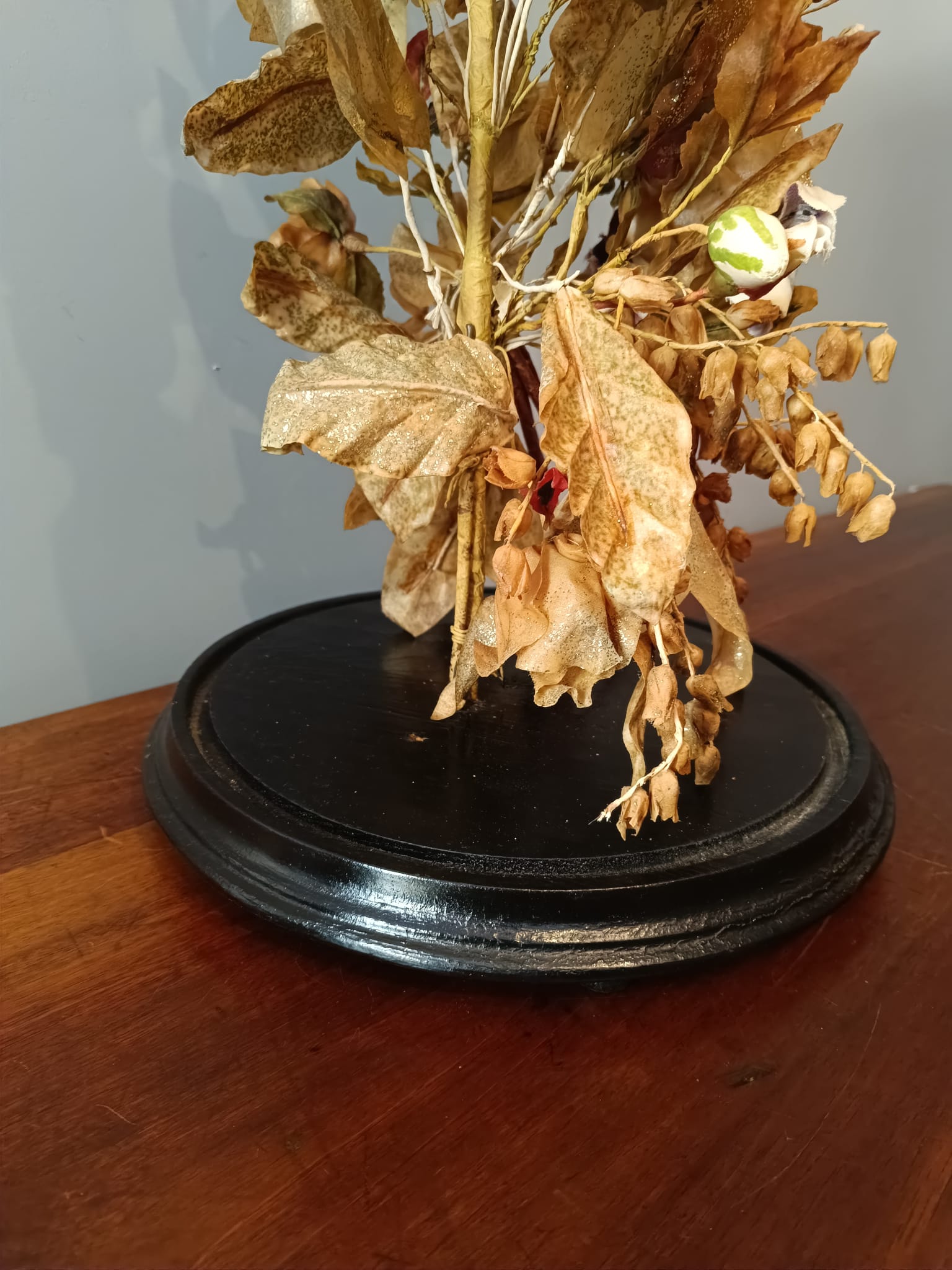 Antica campana in vetro soffiato contenente all’interno fiori pieghettati in tessuto sorretti da un gambo in legno.