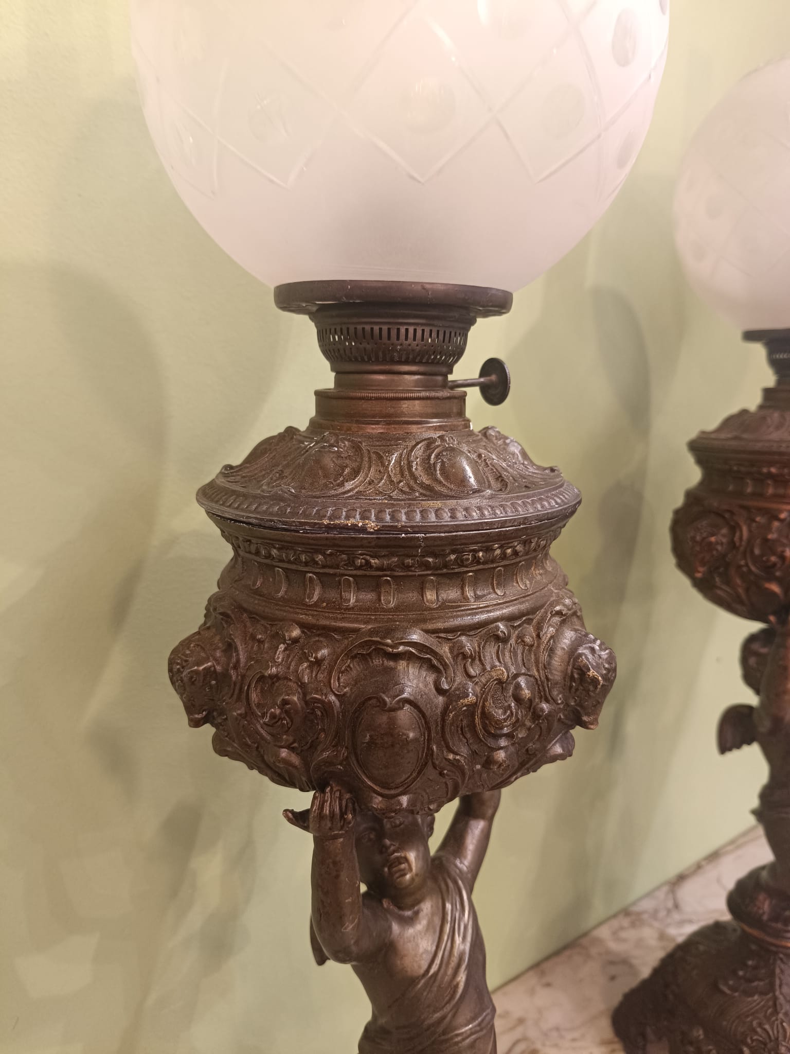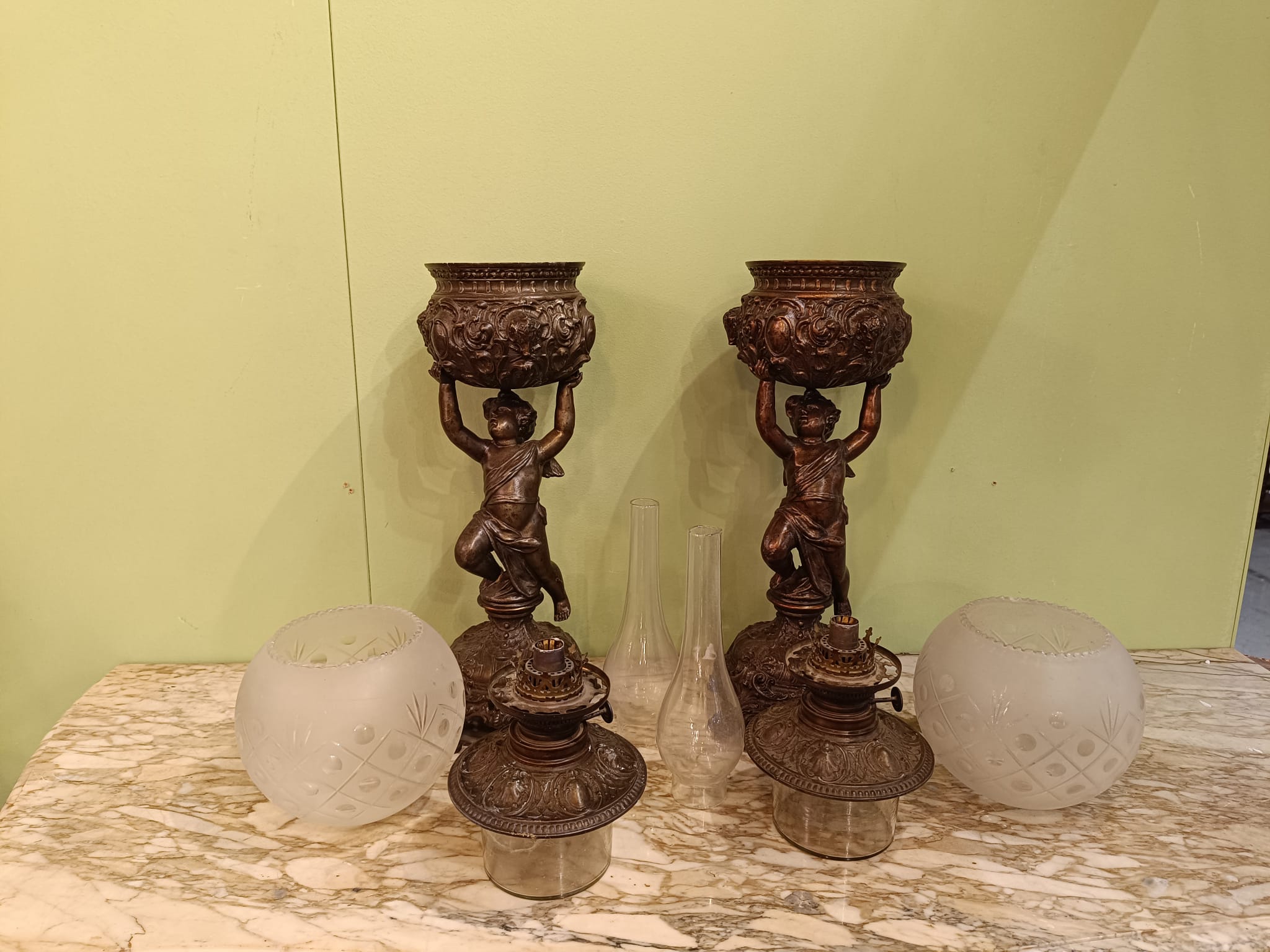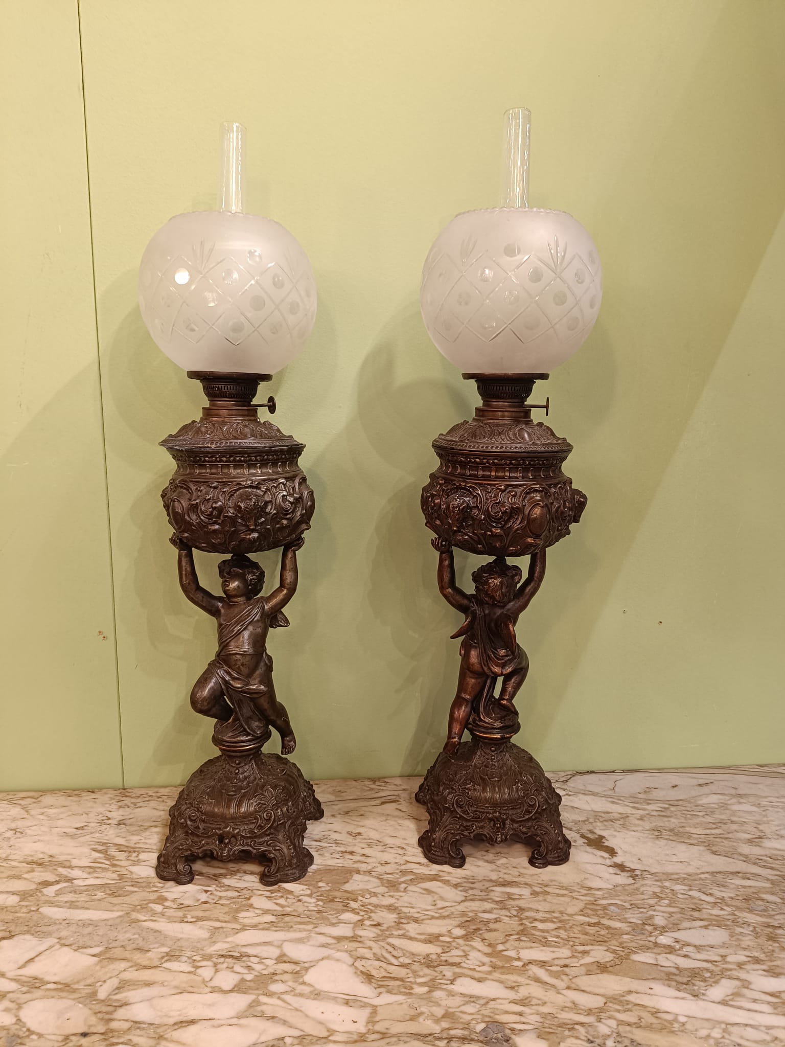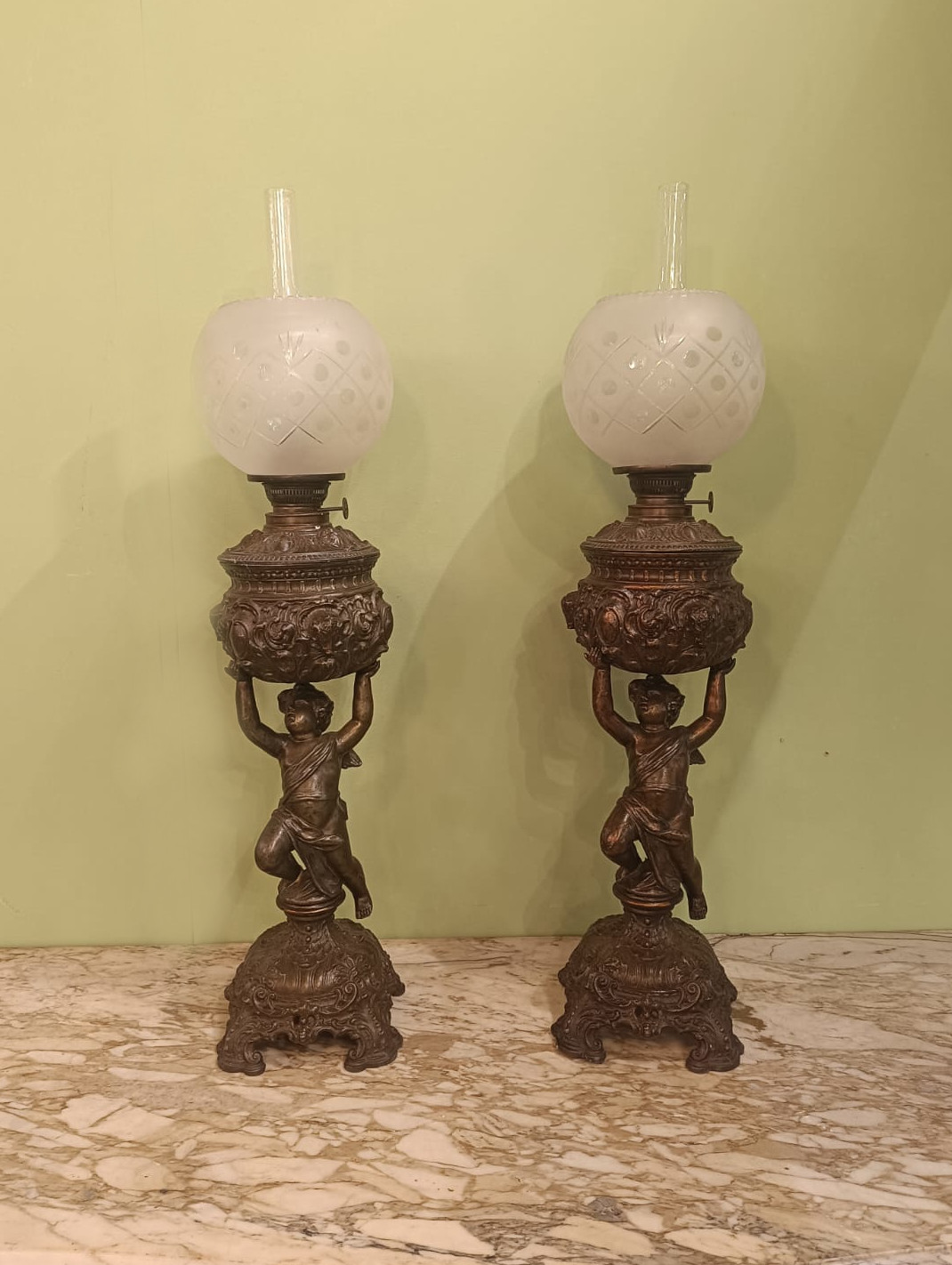 Coppia di lampade a petrolio con paralumi in opalina decorati e putti che “sorreggono” le parti superiori dei lumi. In perfette condizioni.