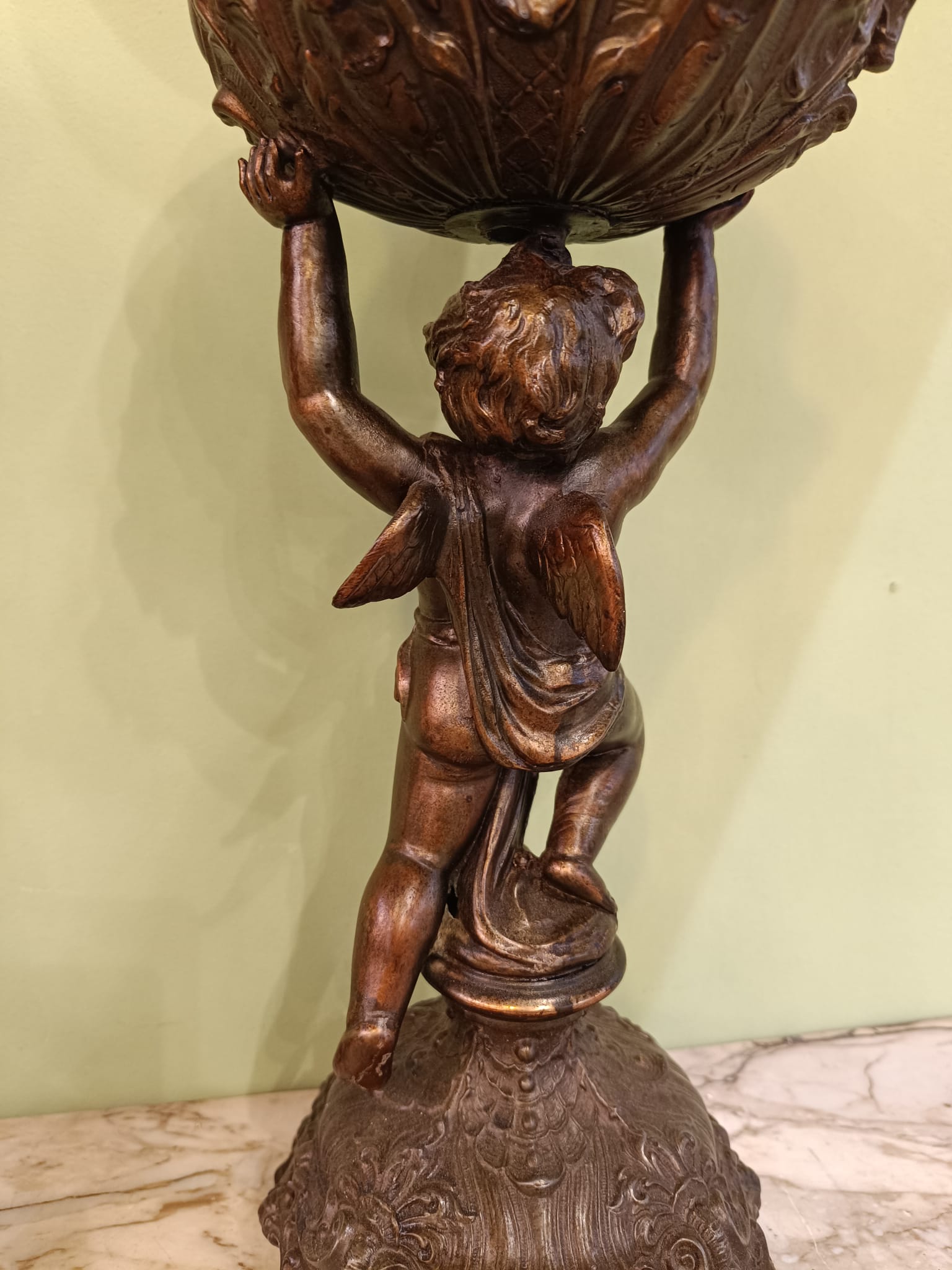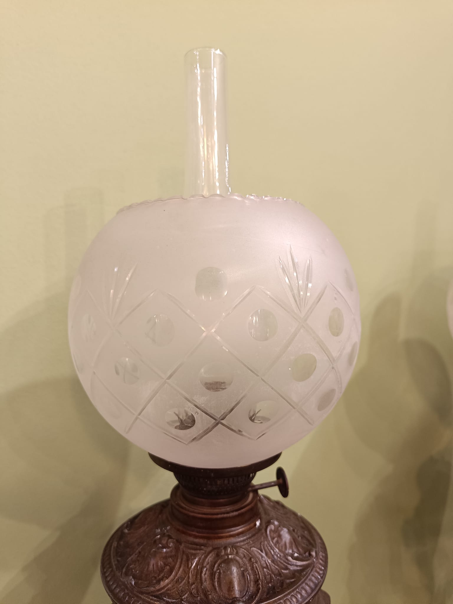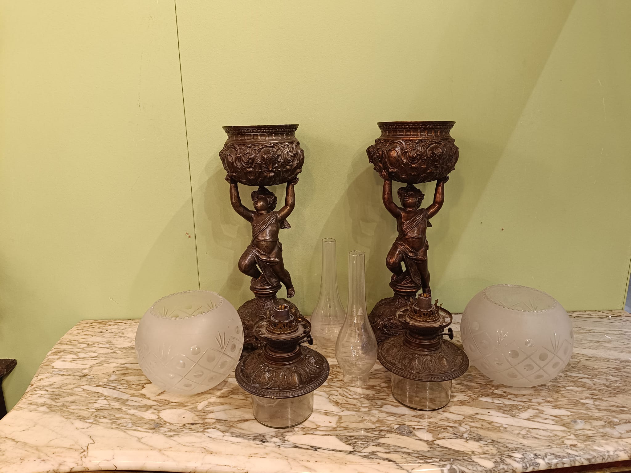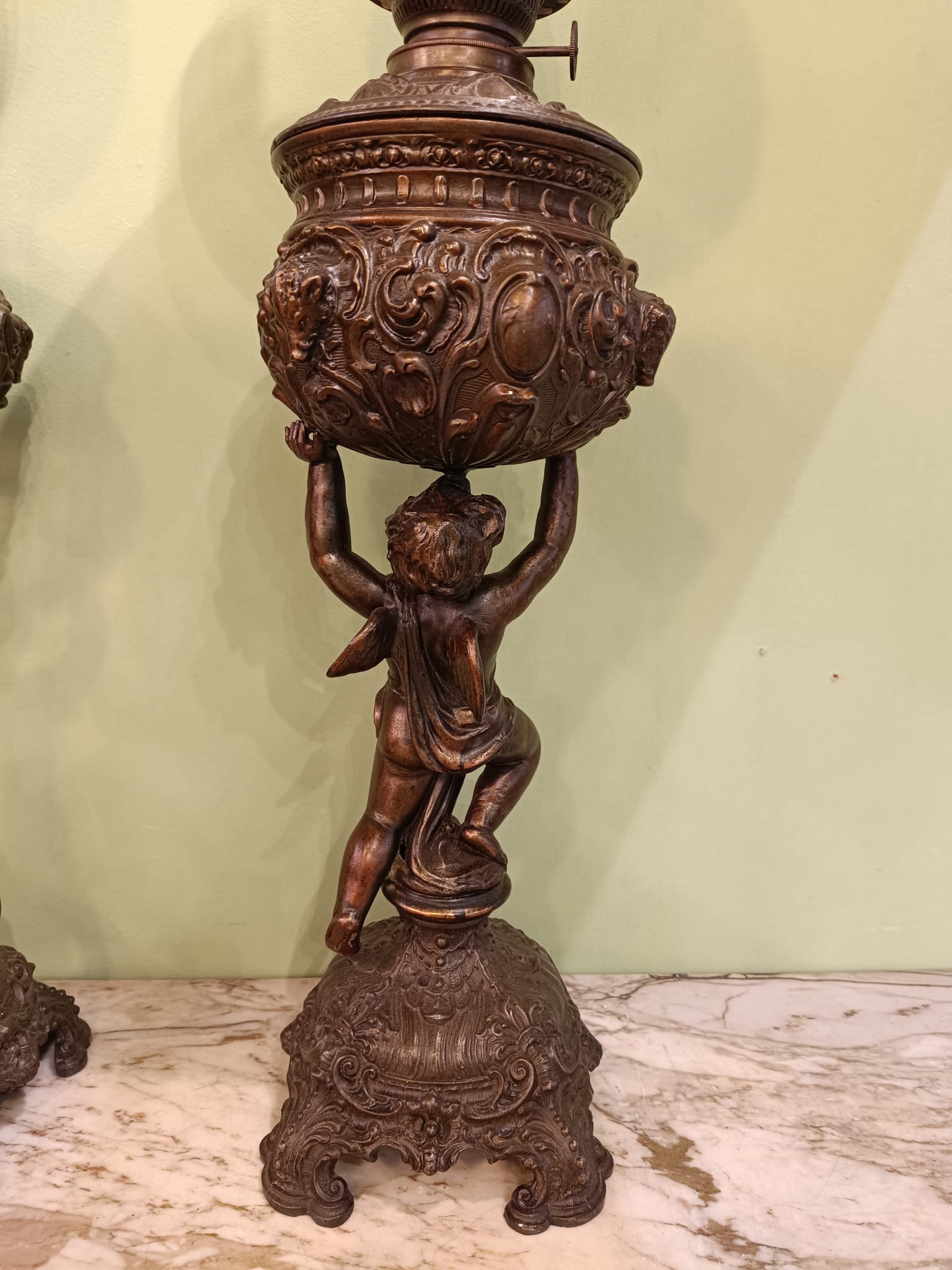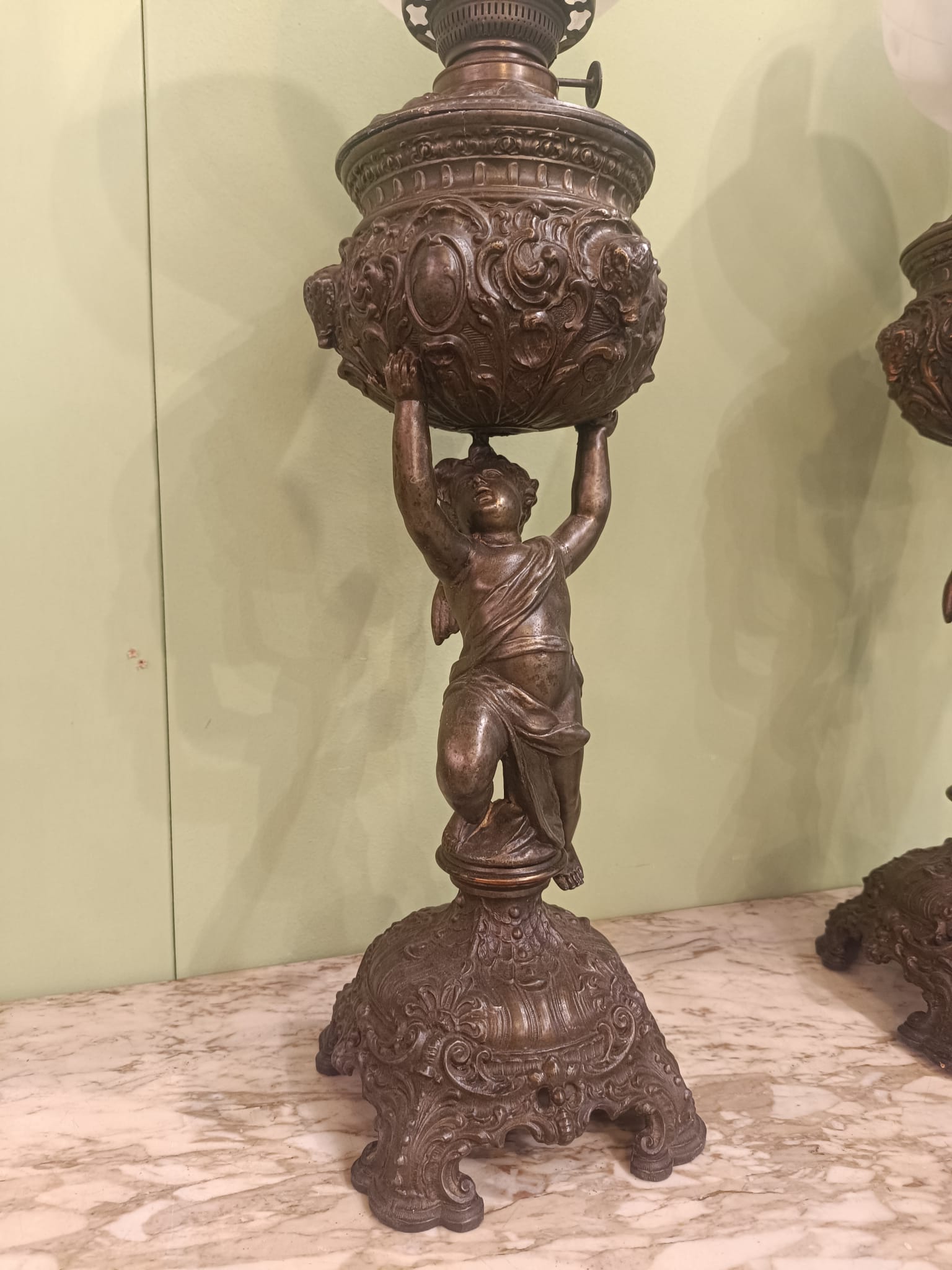 Coppia di lampade a petrolio con paralumi in opalina decorati e putti che “sorreggono” le parti superiori dei lumi. In perfette condizioni.