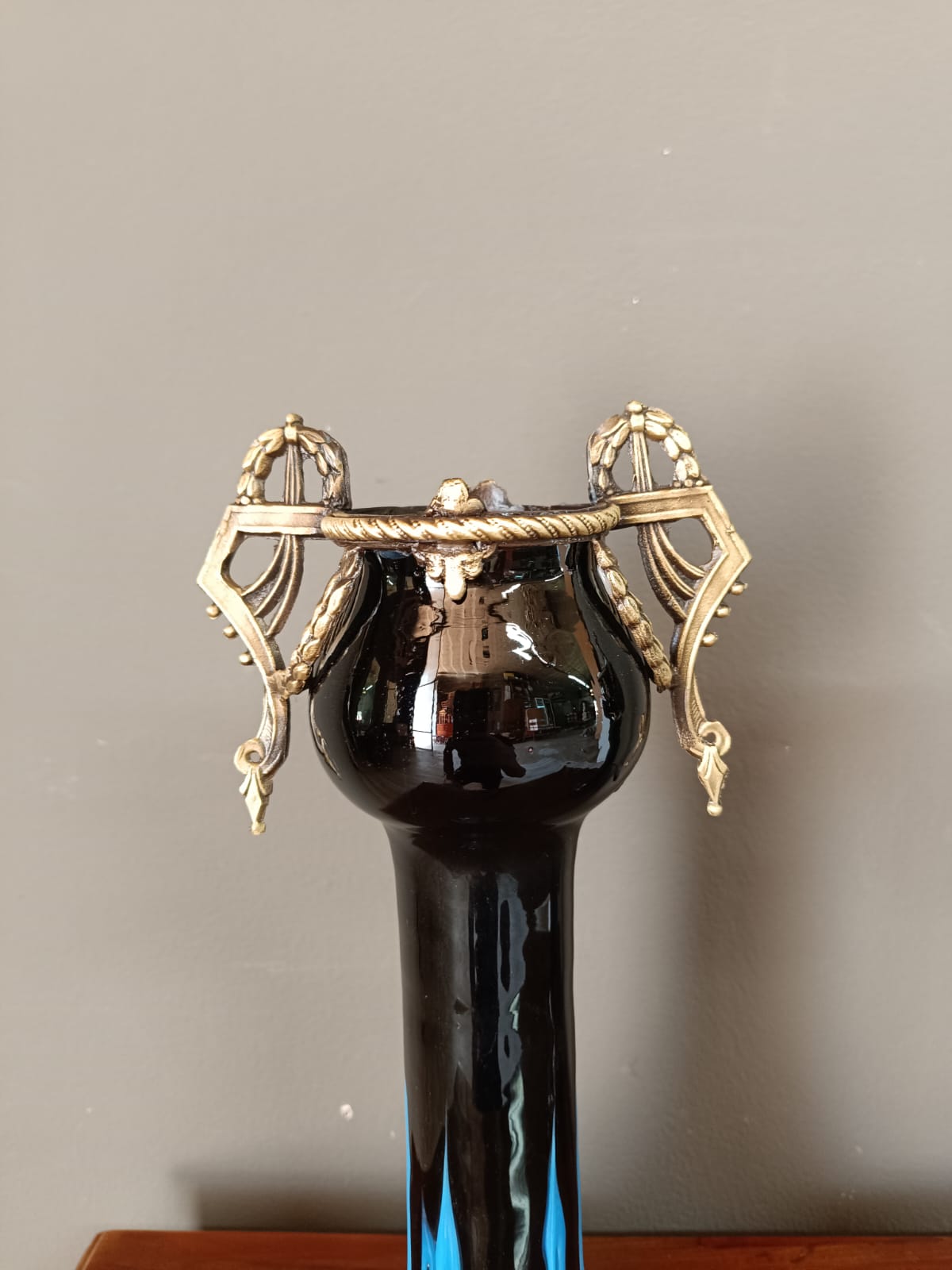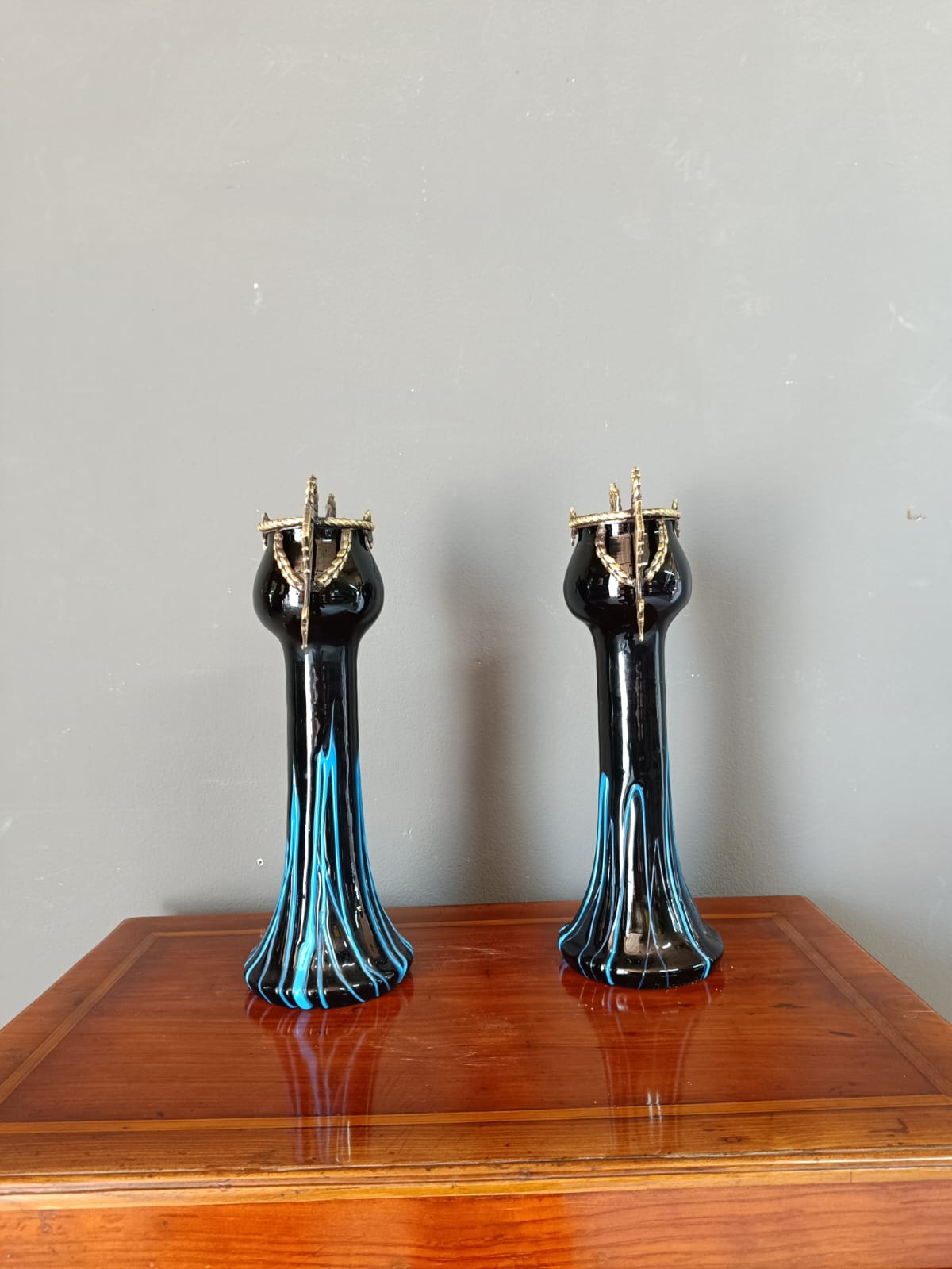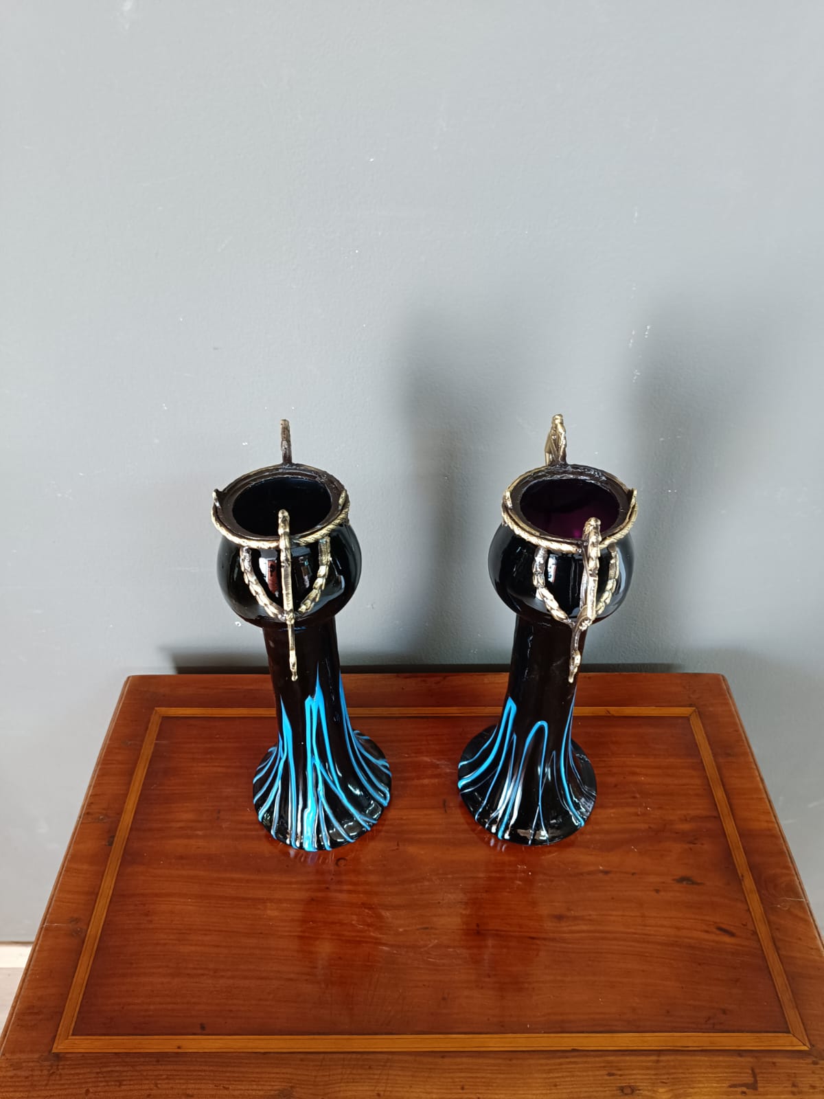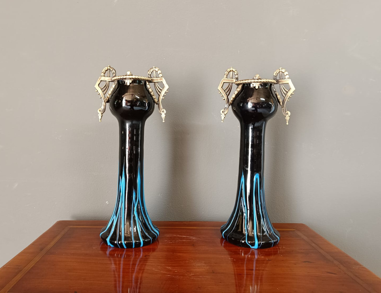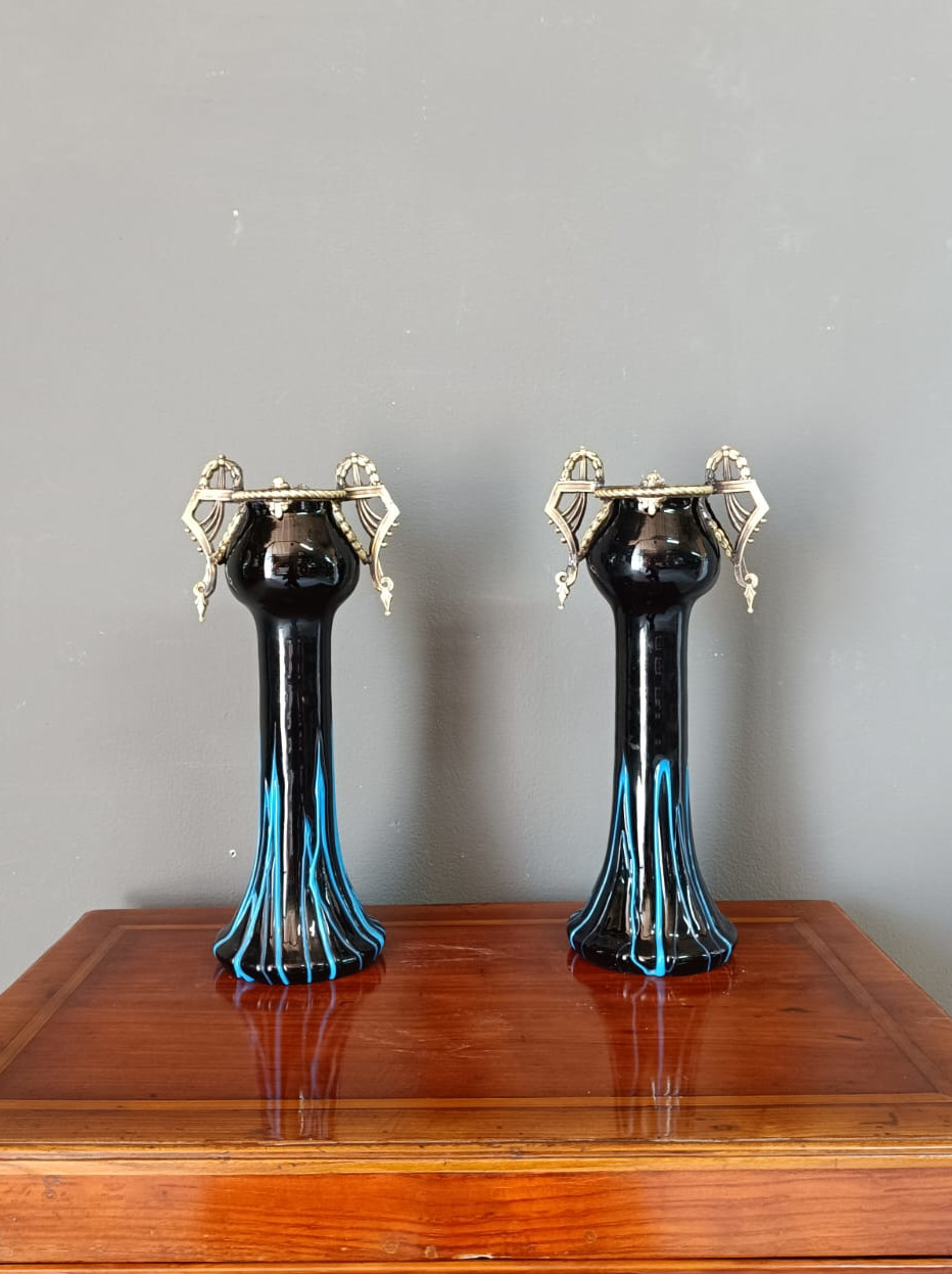 Insolita coppia di portafiori del periodo Liberty in vetro di opalina scuro e parti in bronzo dorato patinato. Entrambi i pezzi sono in perfetto stato.