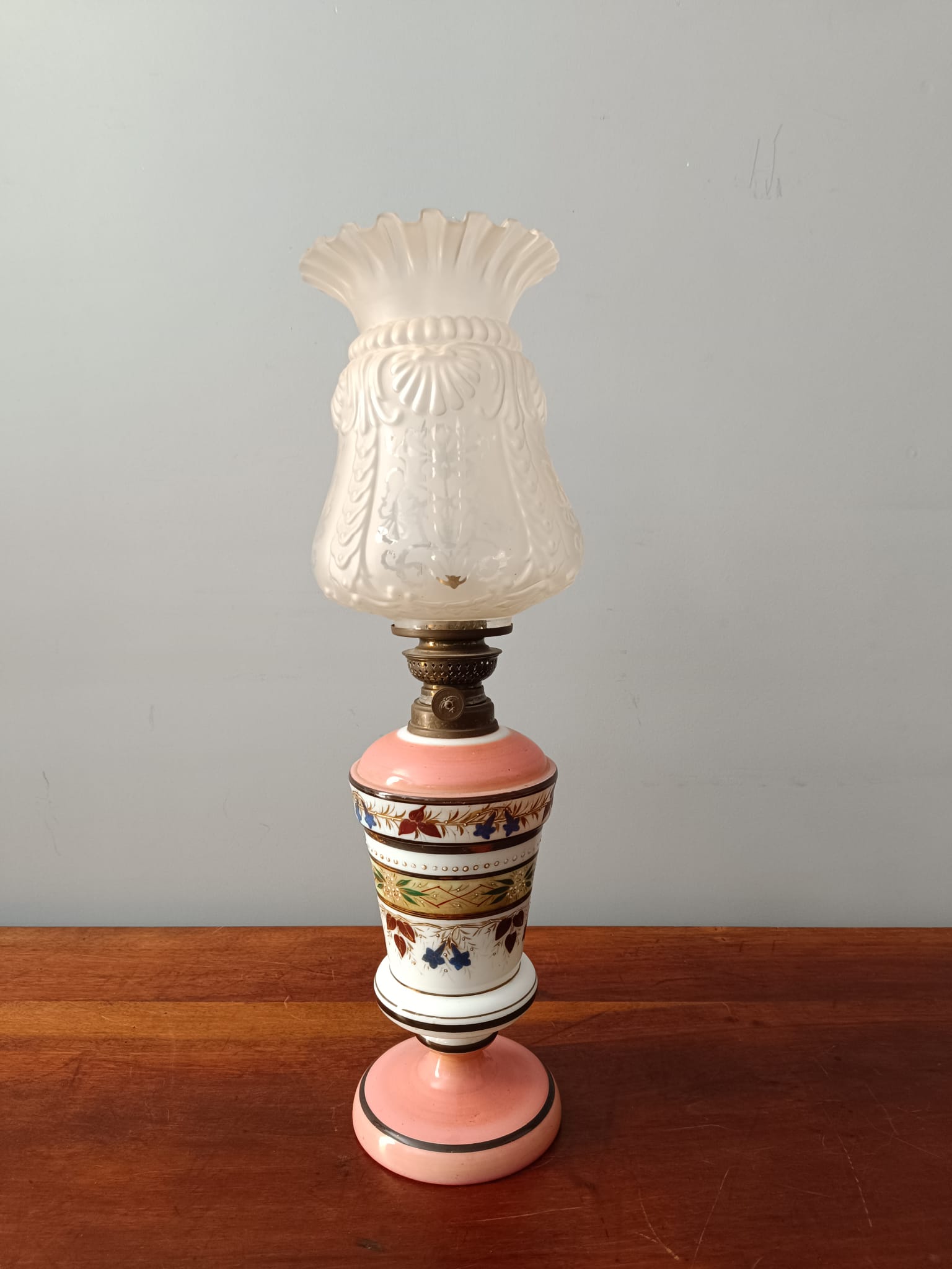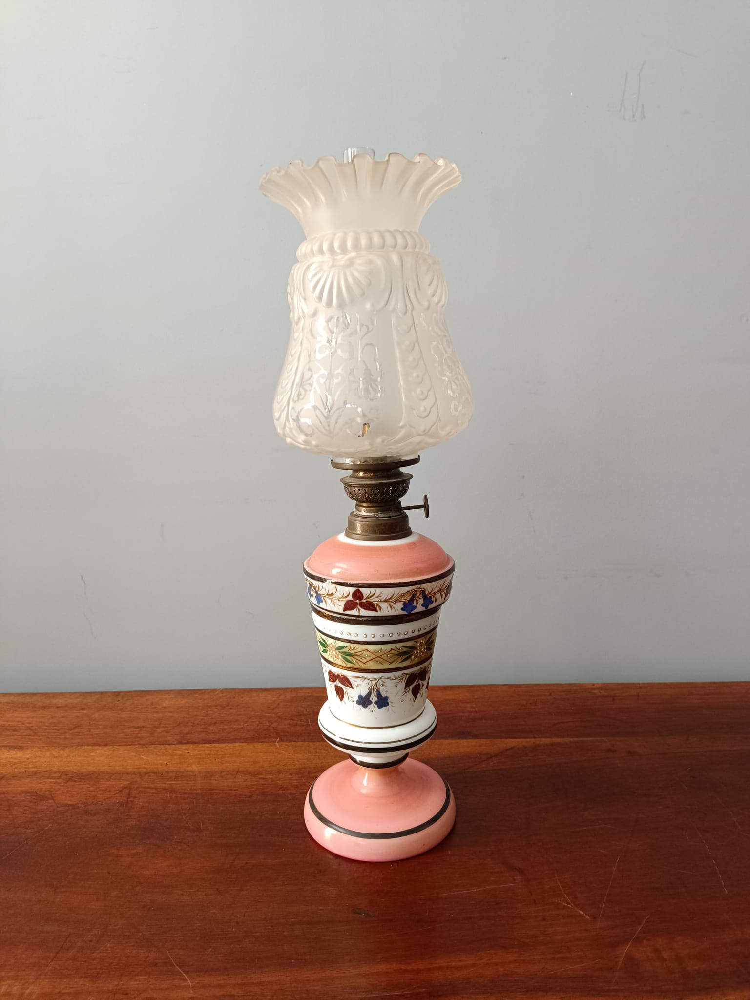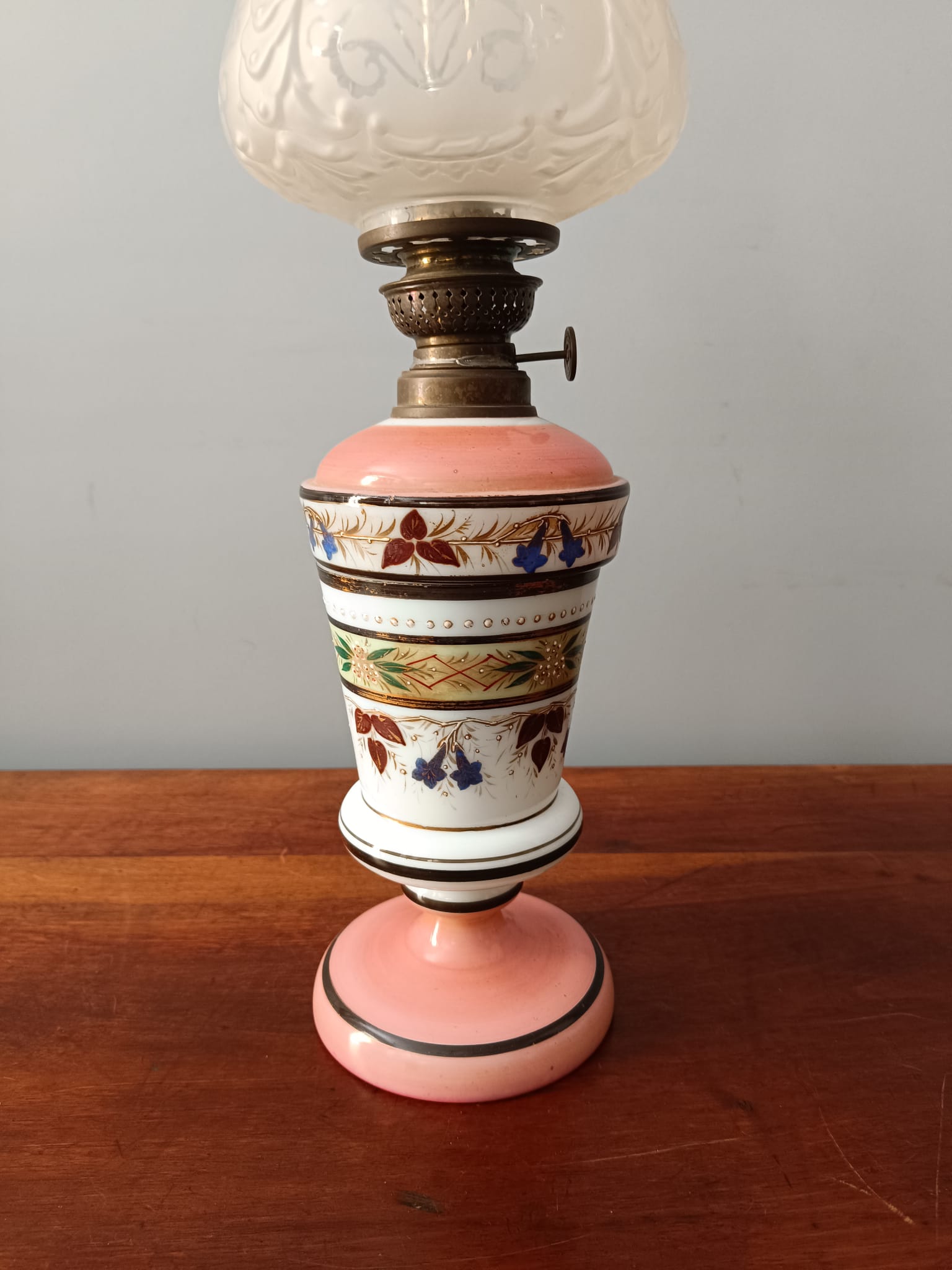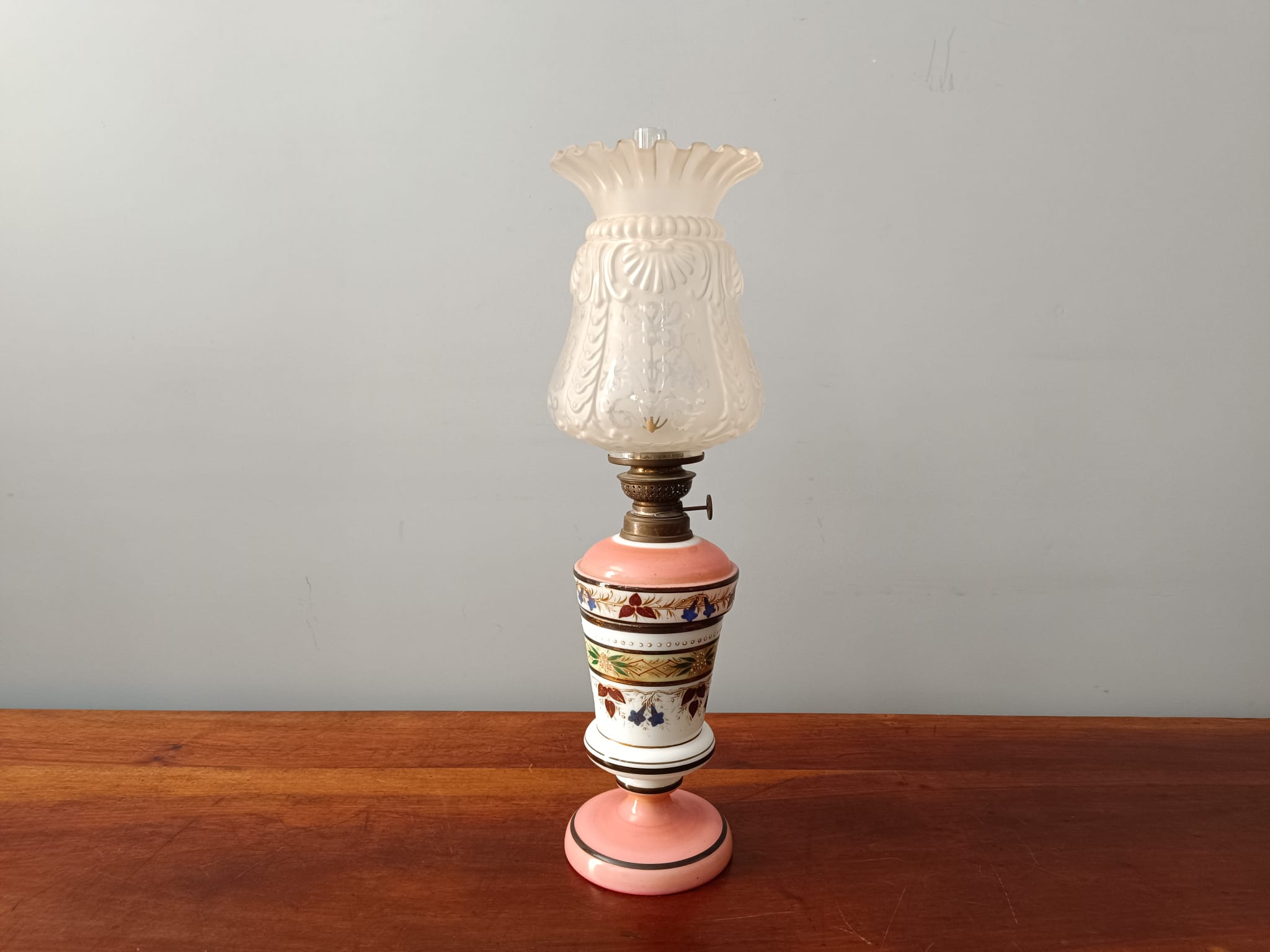 Raffinato lume a petrolio in vetro di opalina con dipinti a mano raffiguranti motivi floreali. Perfetto stato conservativo. Vetro finemente lavorato.