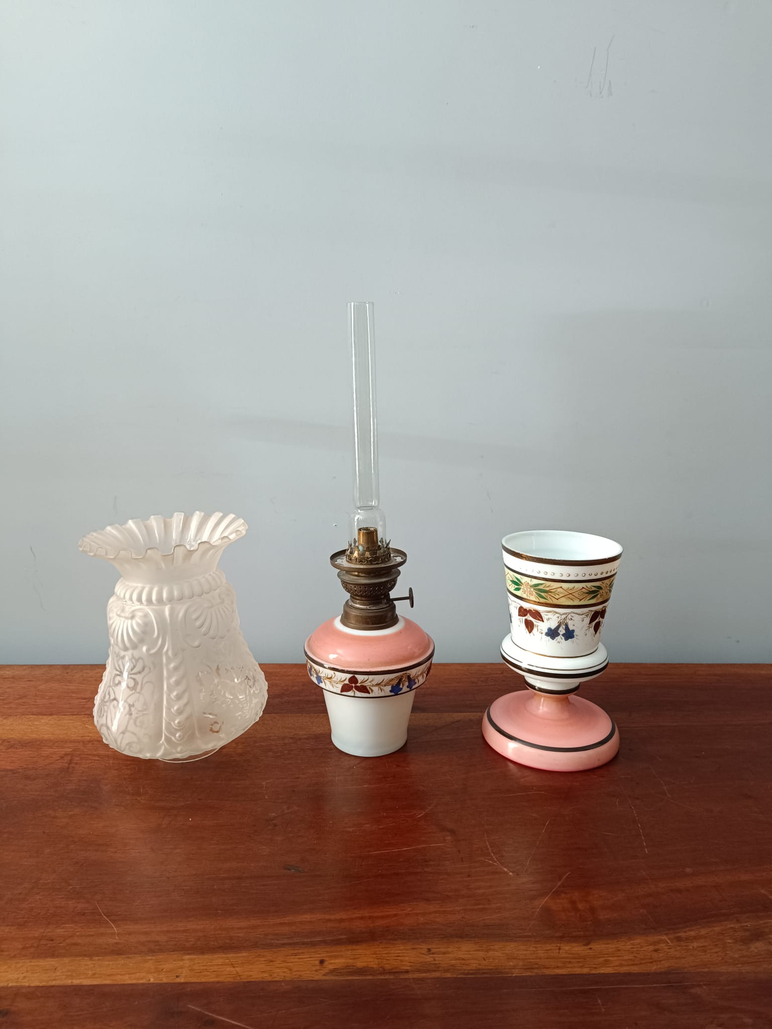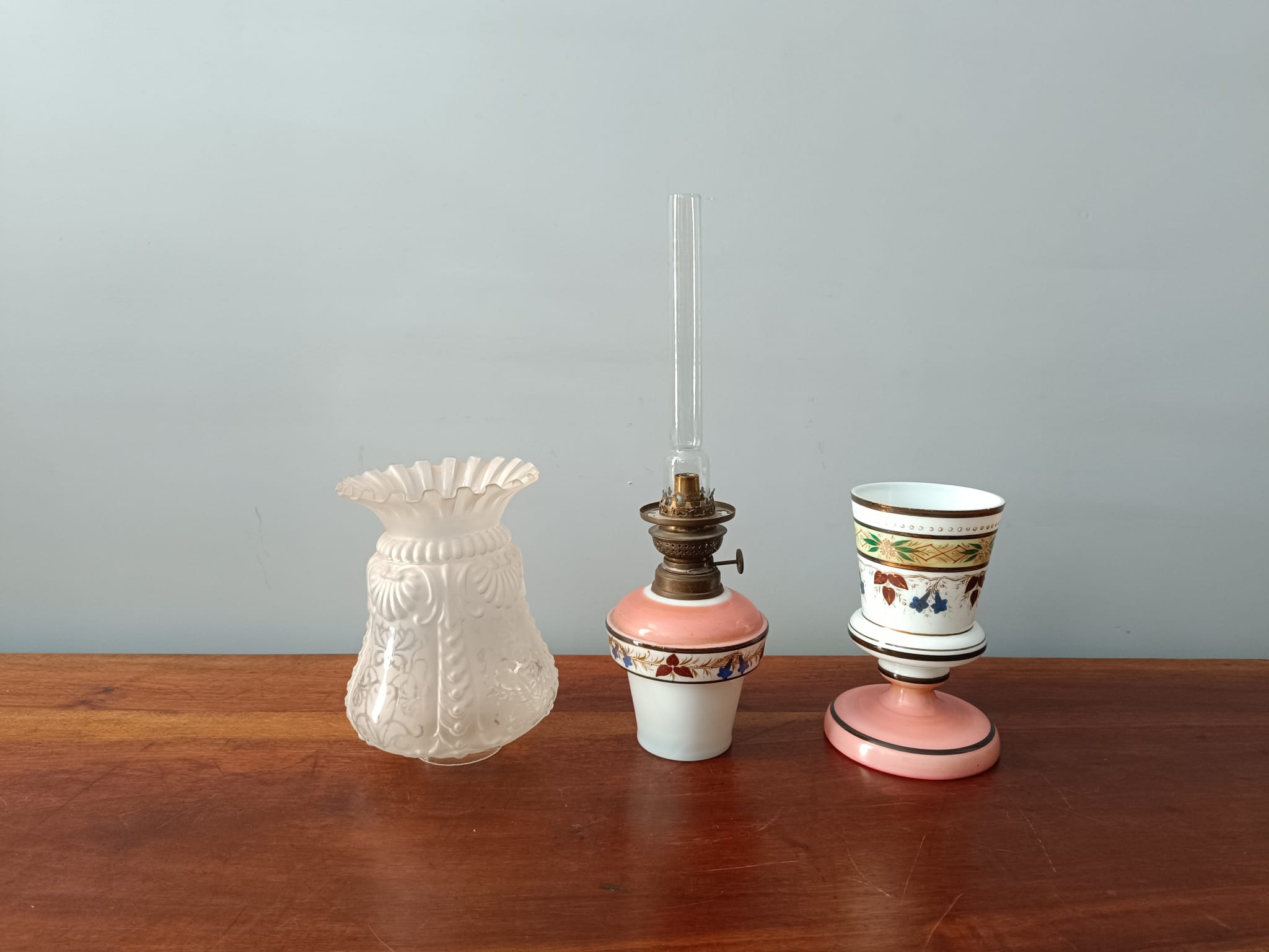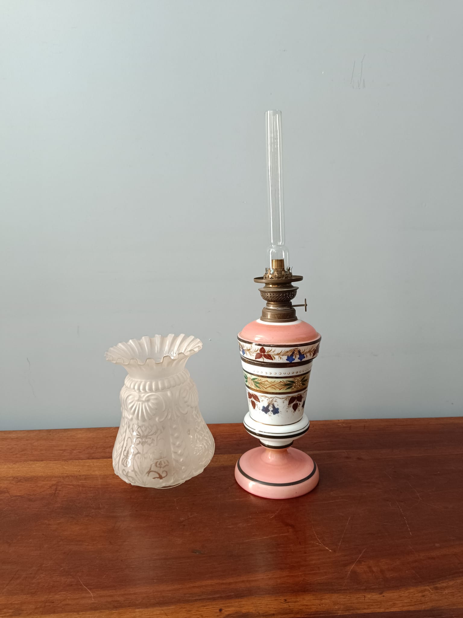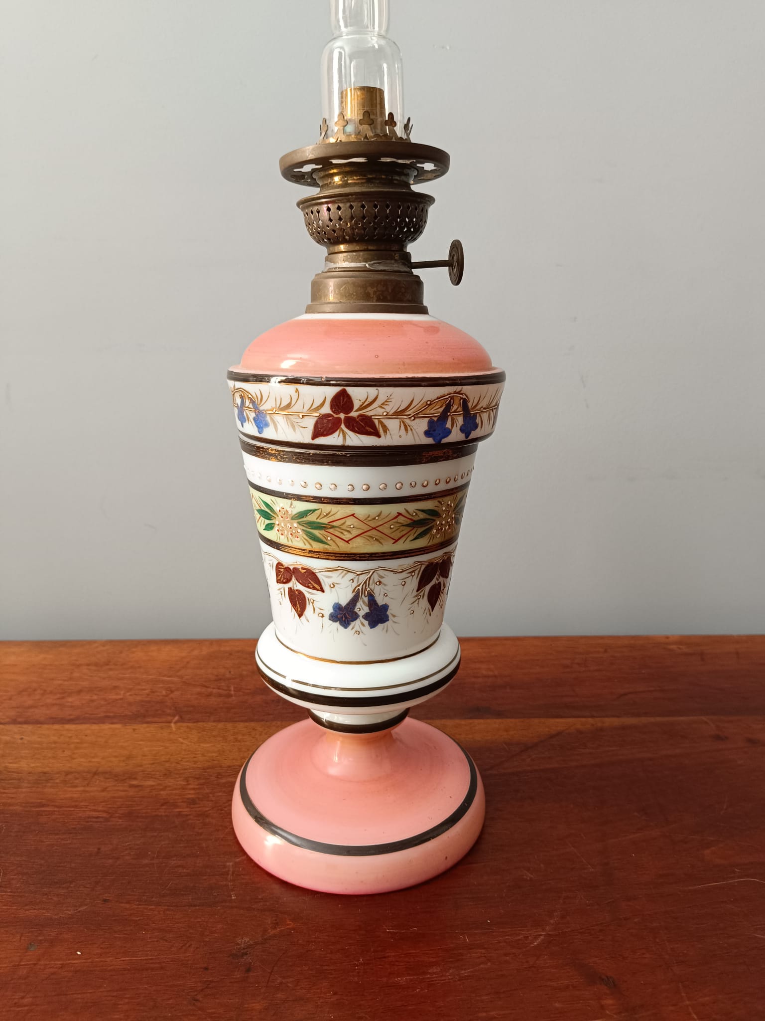 Raffinato lume a petrolio in vetro di opalina con dipinti a mano raffiguranti motivi floreali. Perfetto stato conservativo. Vetro finemente lavorato.