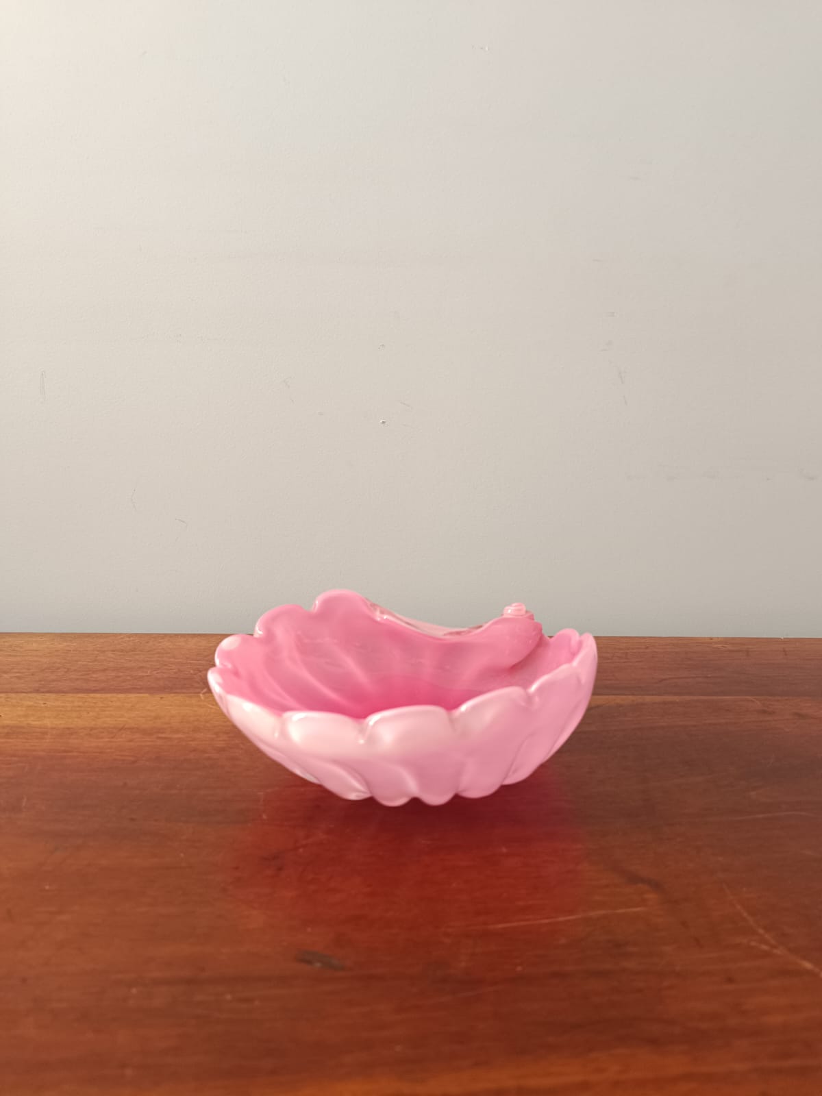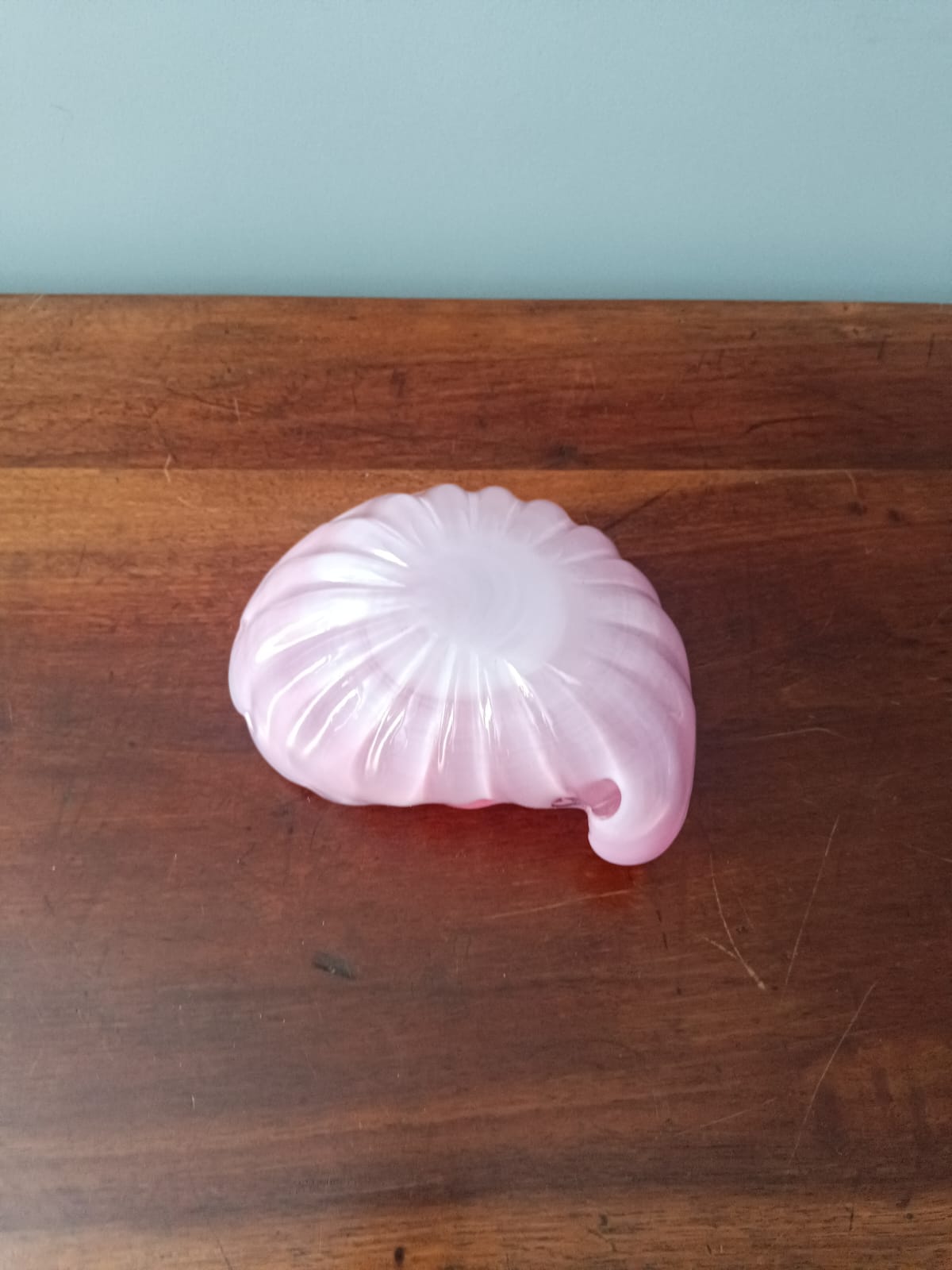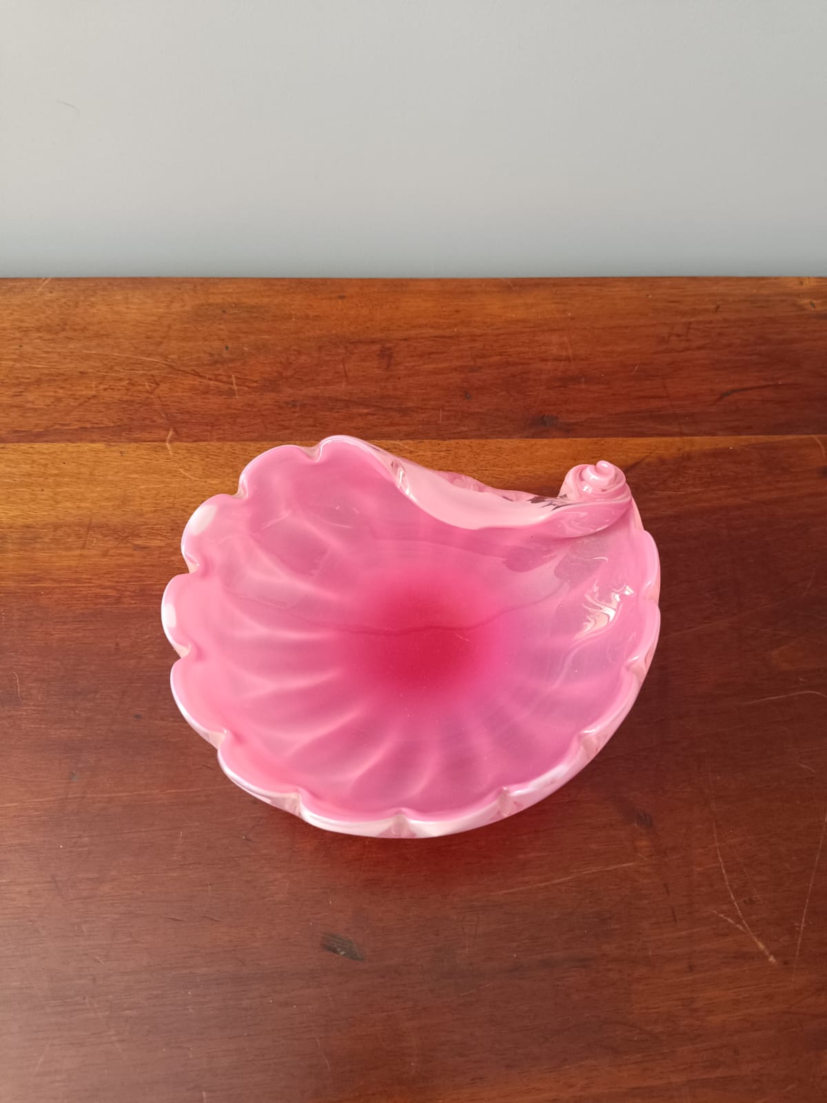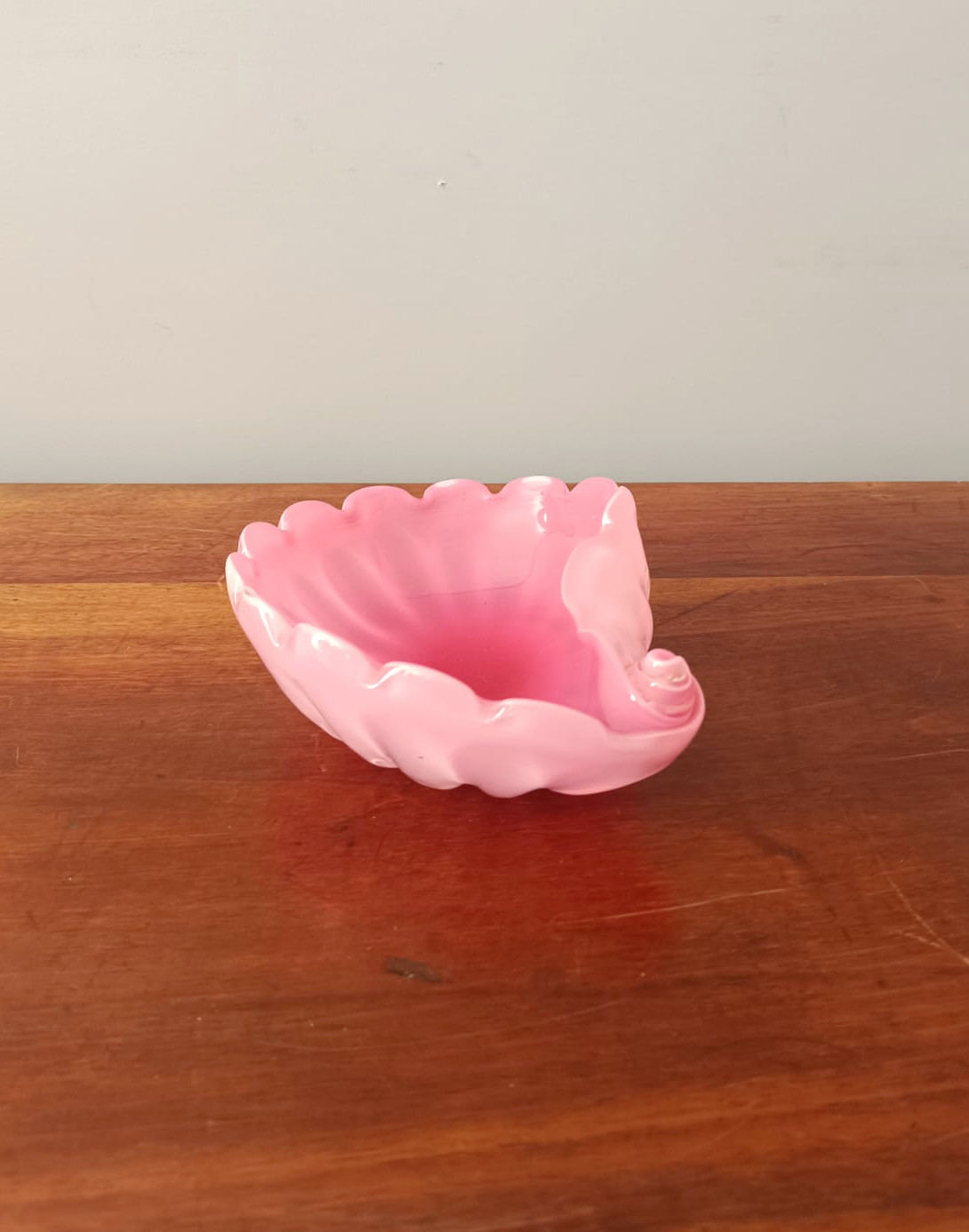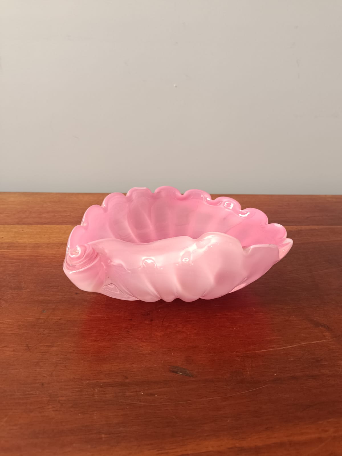 Posacenere in vetro di opalina di colore rosa a forma di conchiglia. Perfette condizioni. Non ci sono sbeccature o lesioni.