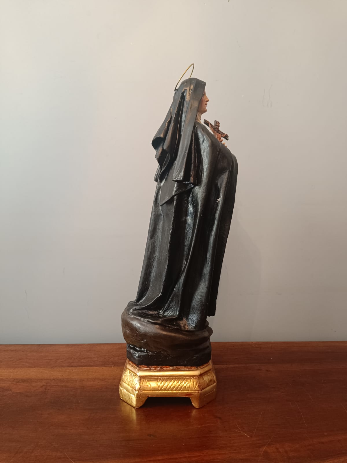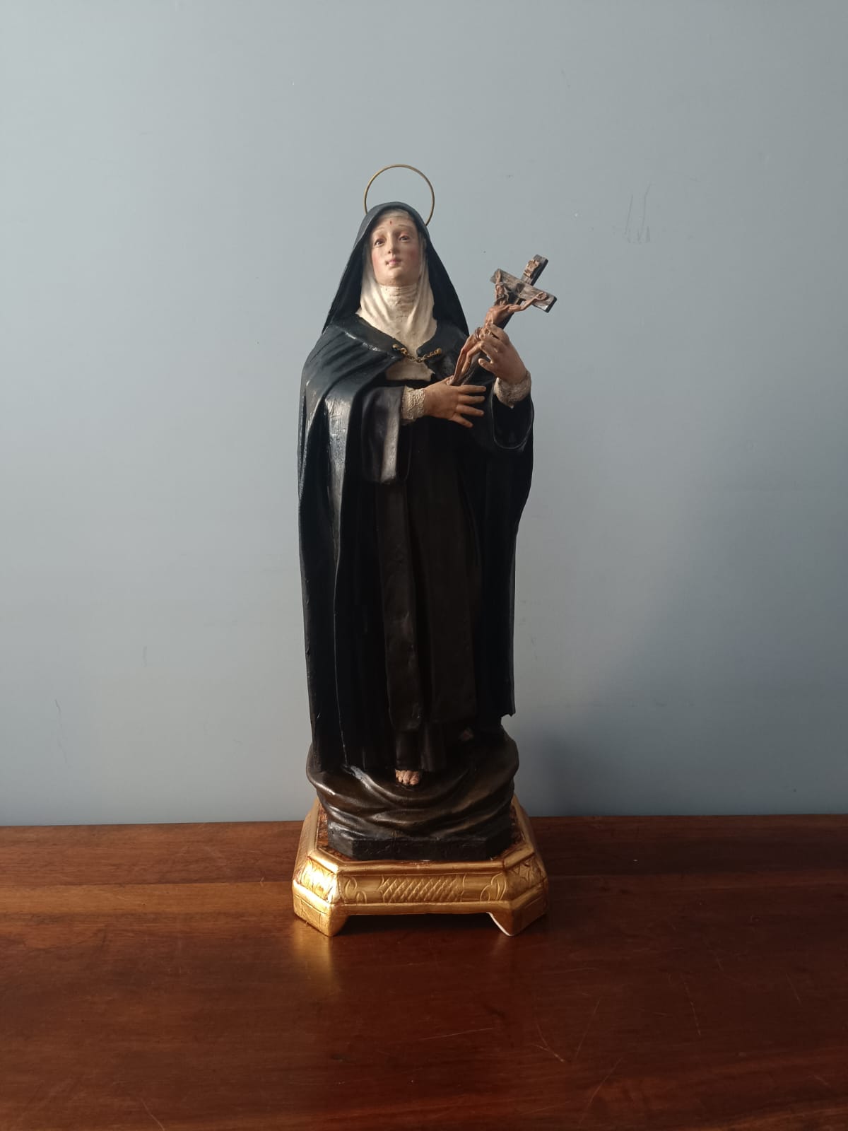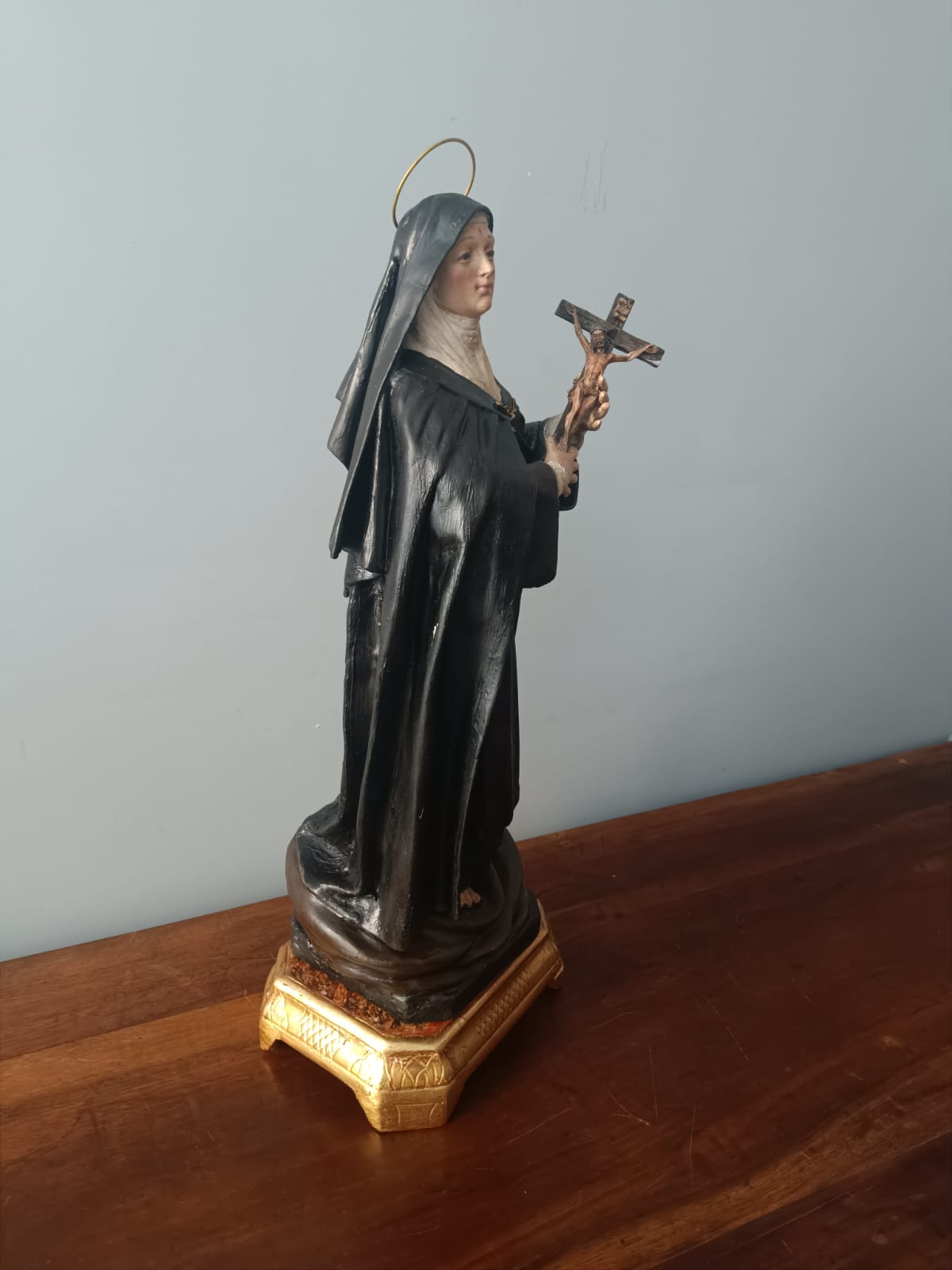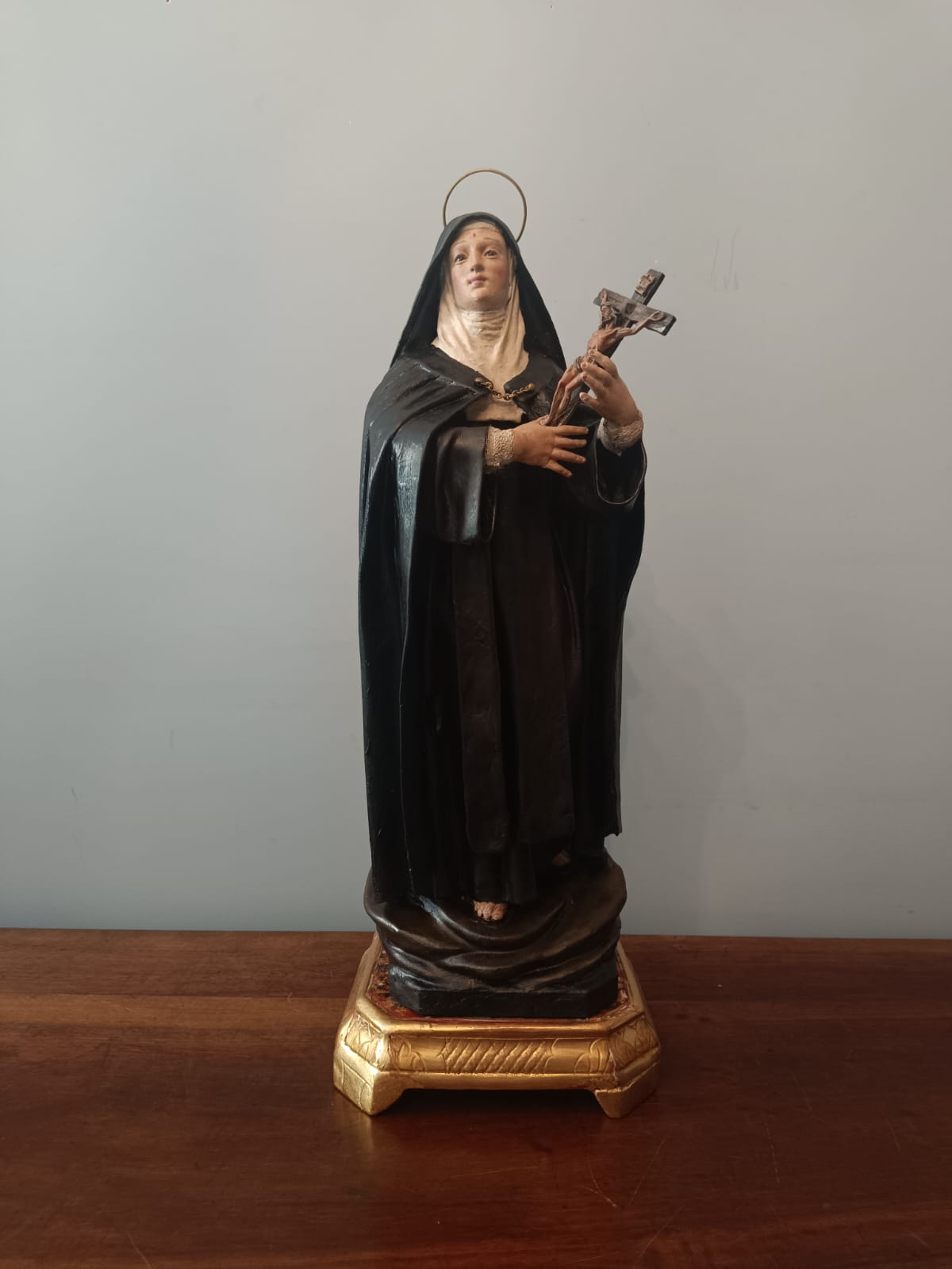 Antica statua in cartapesta poggiata su base in legno dorato raffigurante Santa Rita. Gli occhi di questa statua sono in vetro. Ottima manifattura.