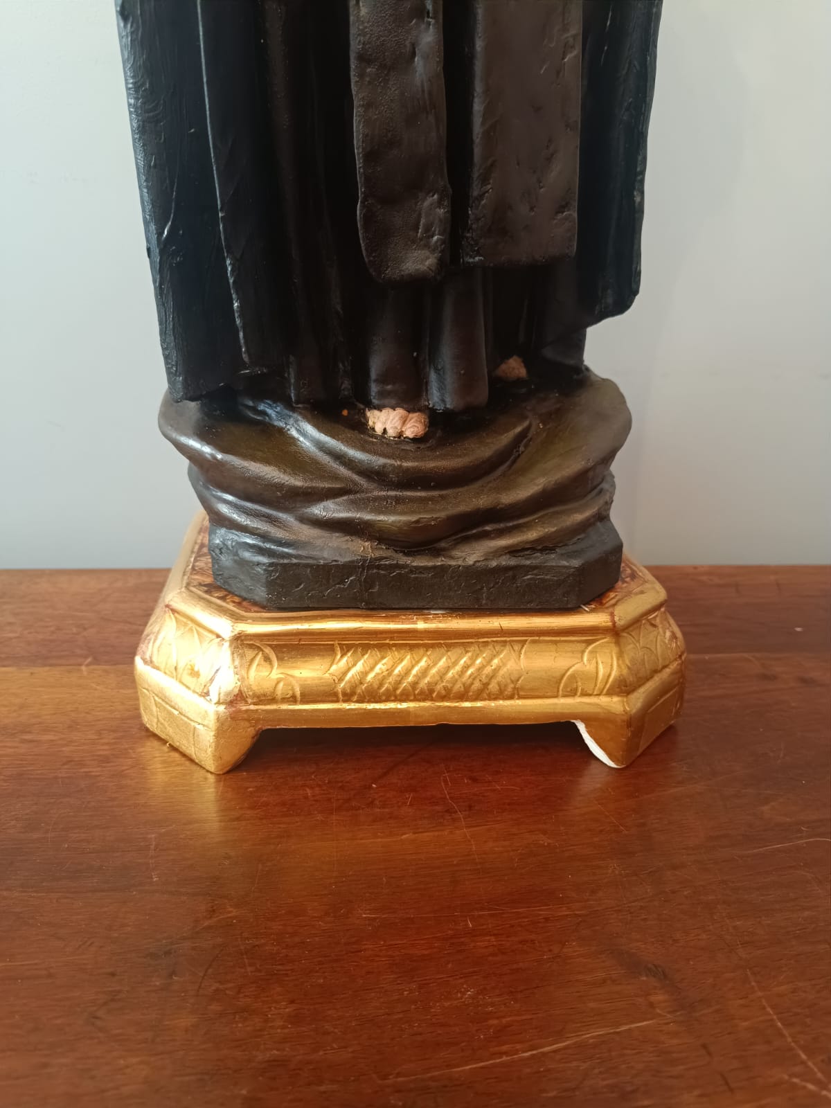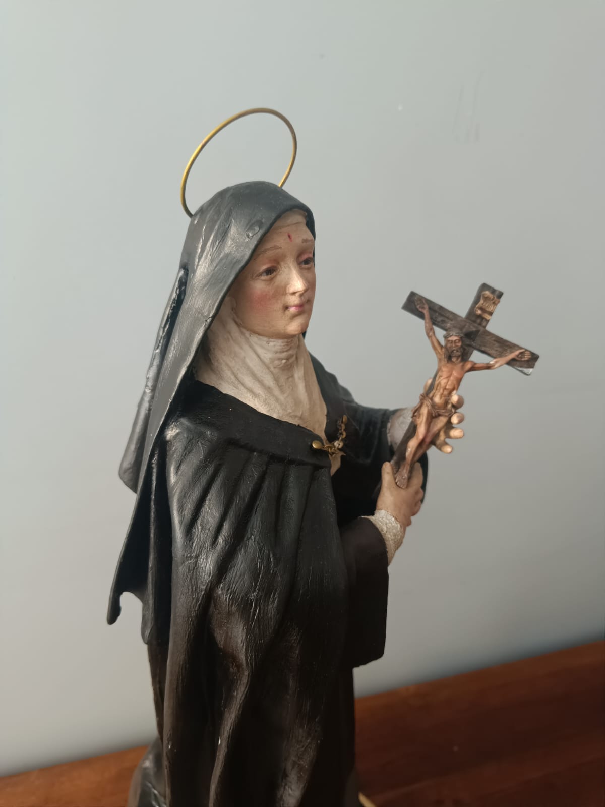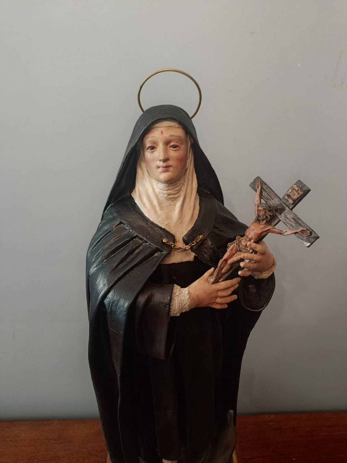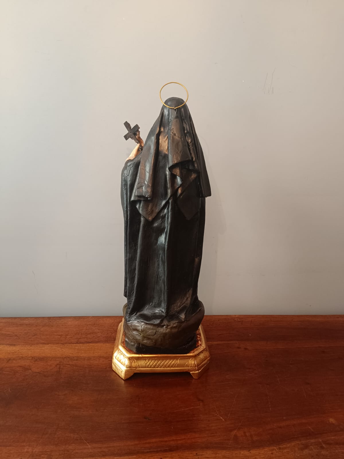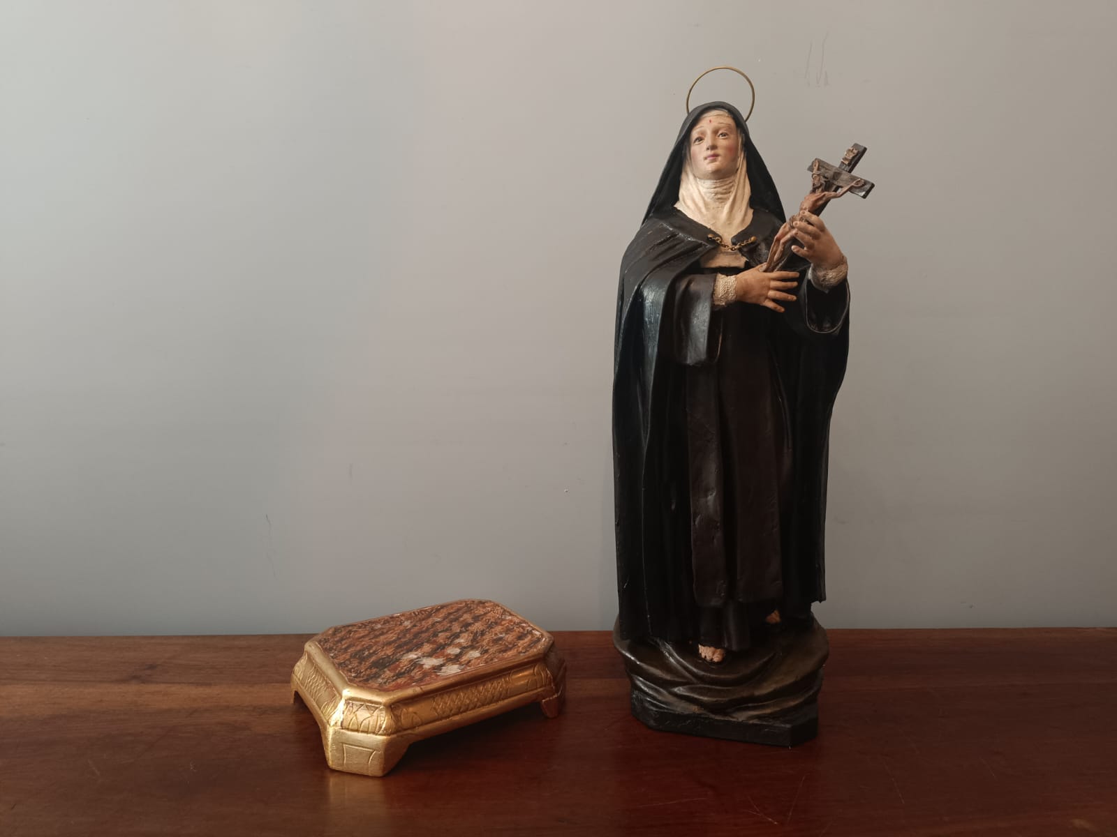 Antica statua in cartapesta poggiata su base in legno dorato raffigurante Santa Rita. Gli occhi di questa statua sono in vetro. Ottima manifattura.