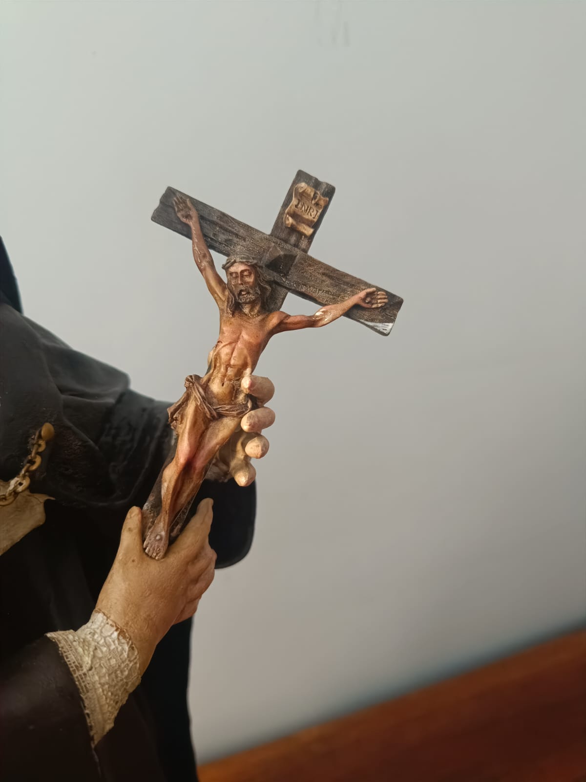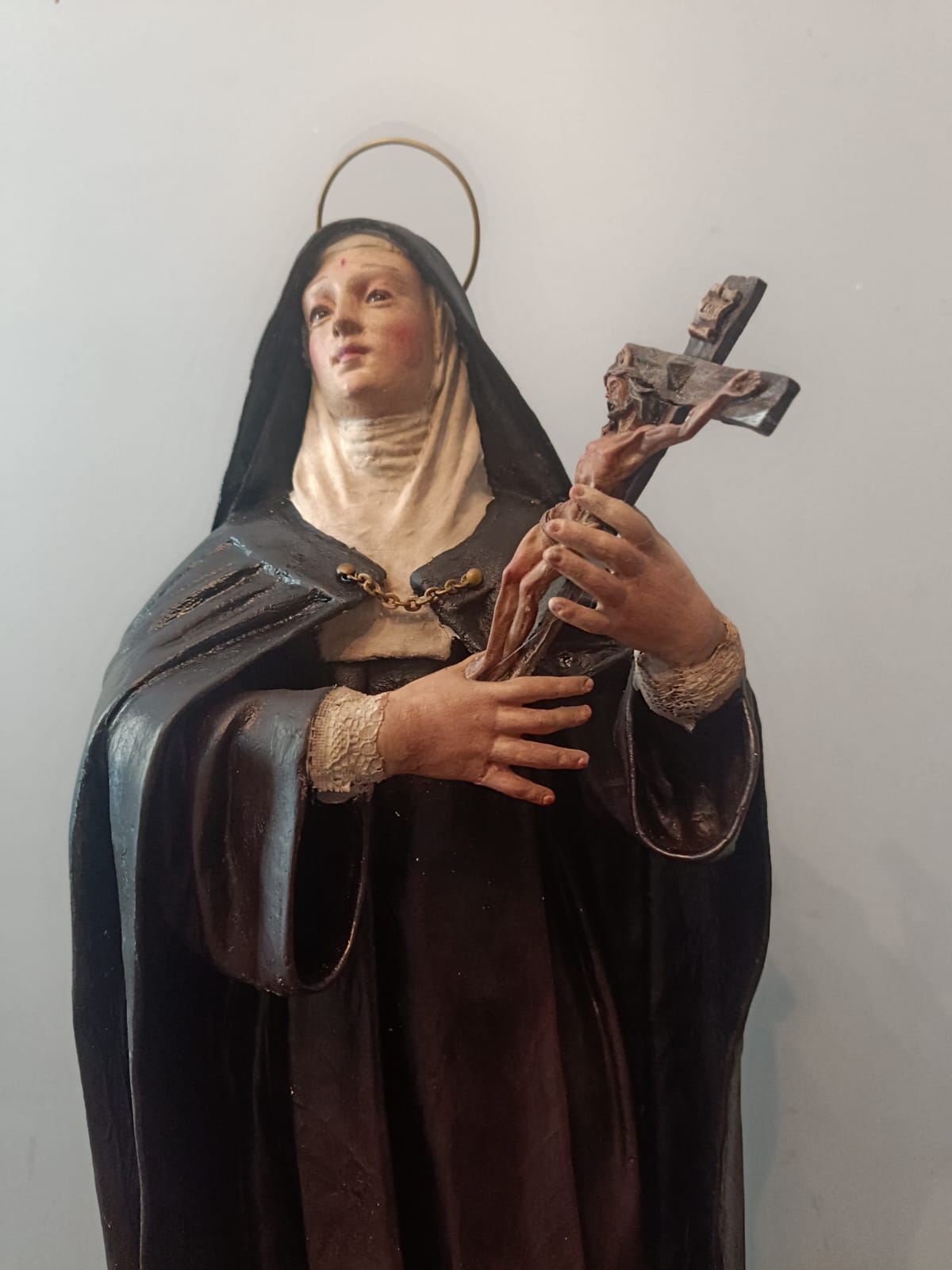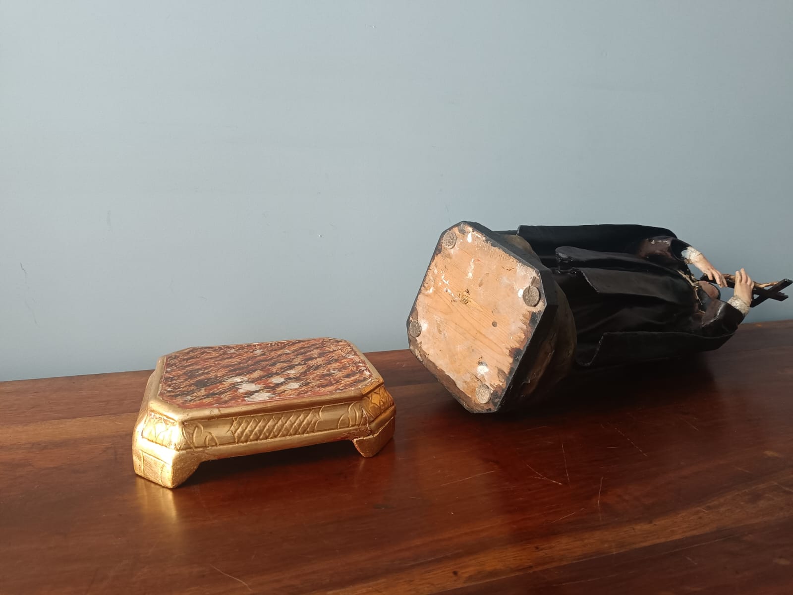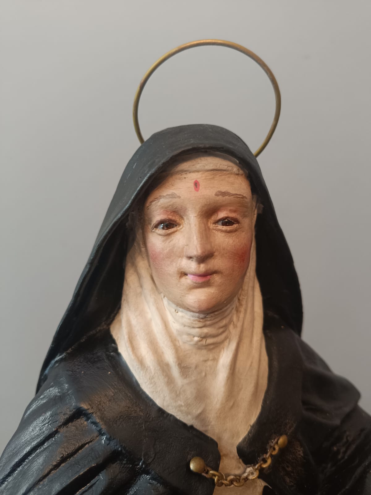 Antica statua in cartapesta poggiata su base in legno dorato raffigurante Santa Rita. Gli occhi di questa statua sono in vetro. Ottima manifattura.
