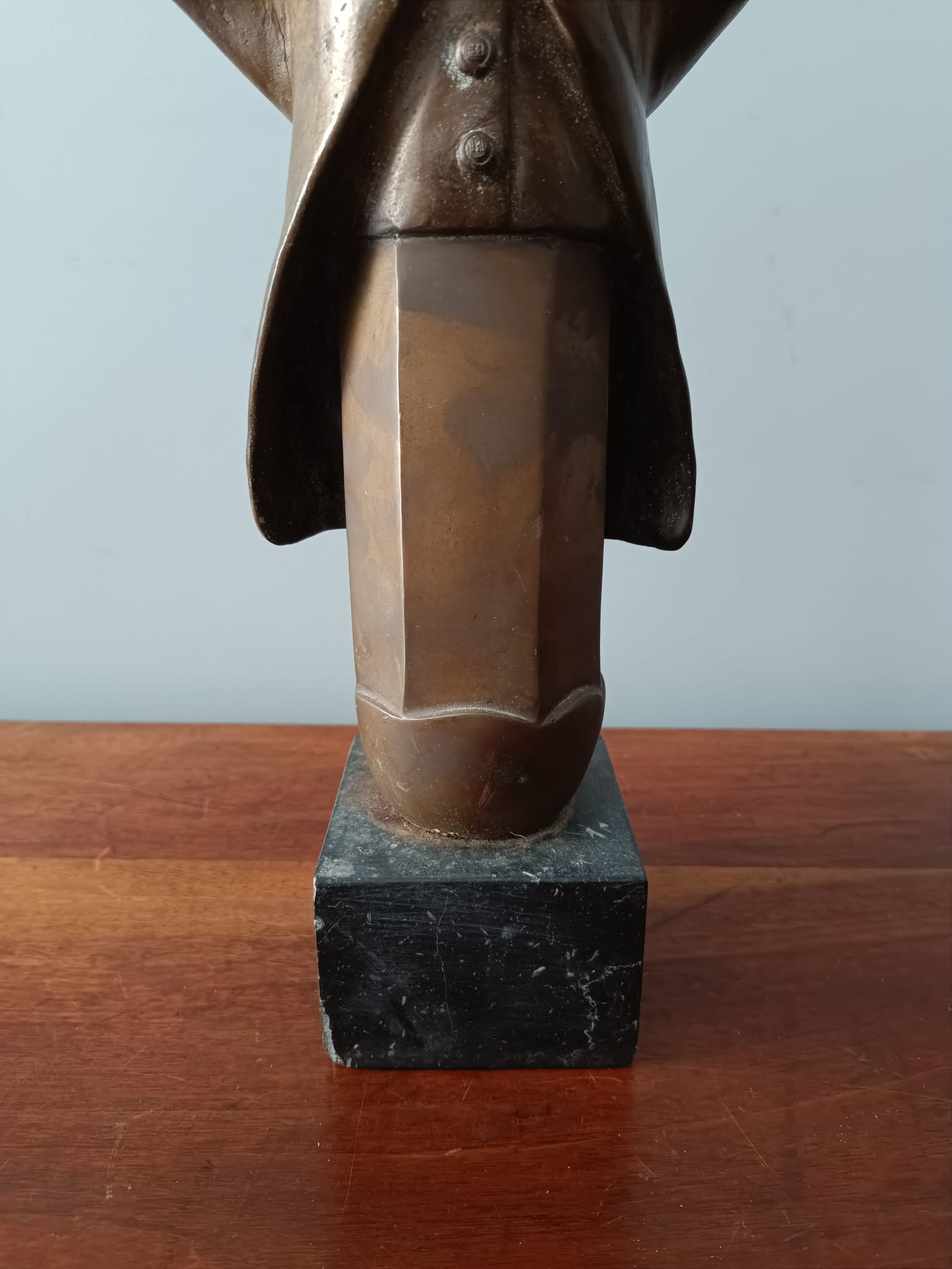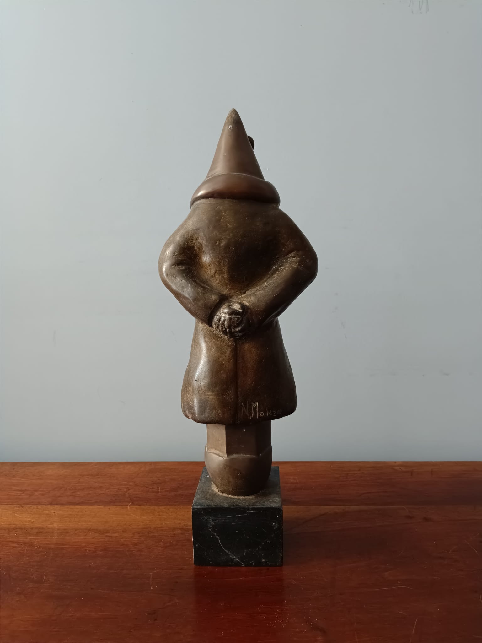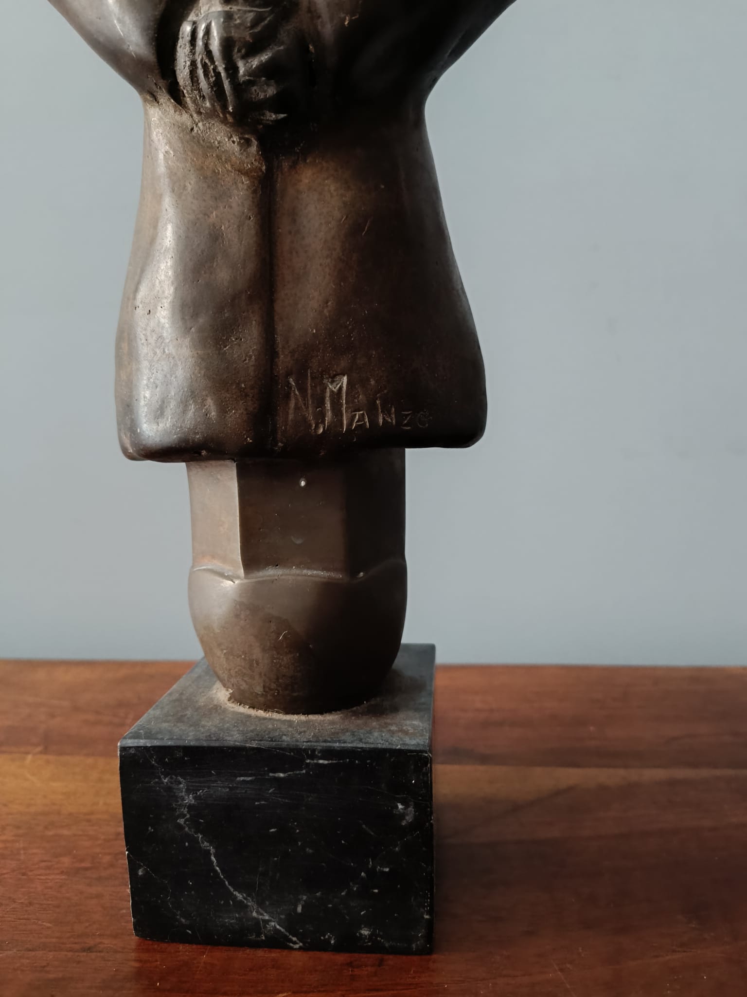 Scultura in bronzo degli anni 40 poggiata su base in marmo nero raffigurante un comandante della marina. La scultura è firmata sulla parte retrostante N. Manzo. La particolarità di questo bronzo sono le forme insolite del personaggio rappresentato.