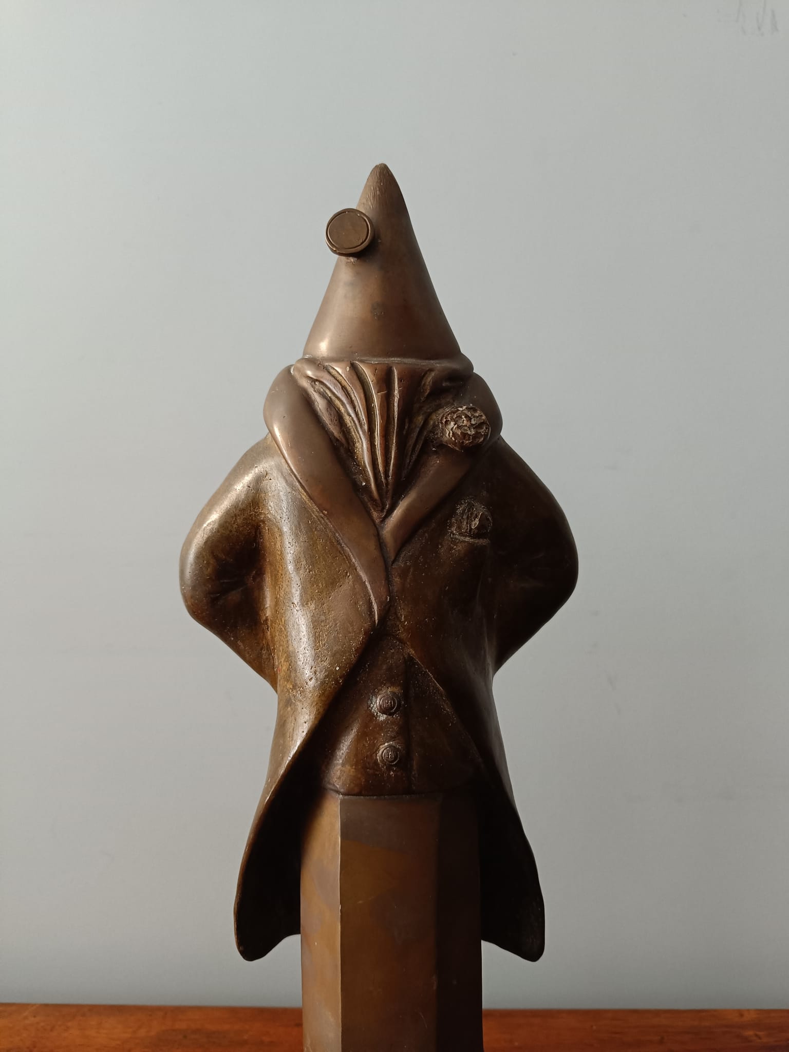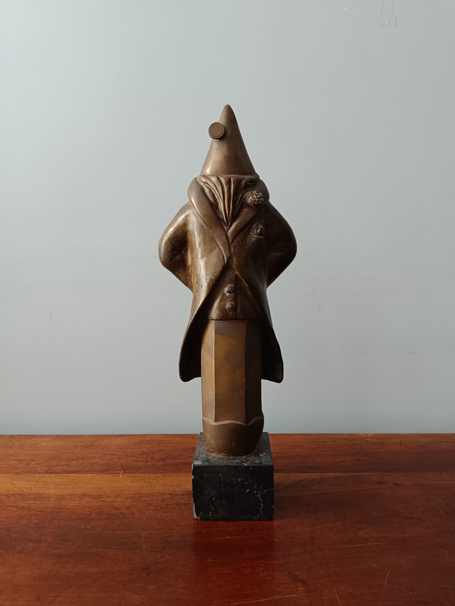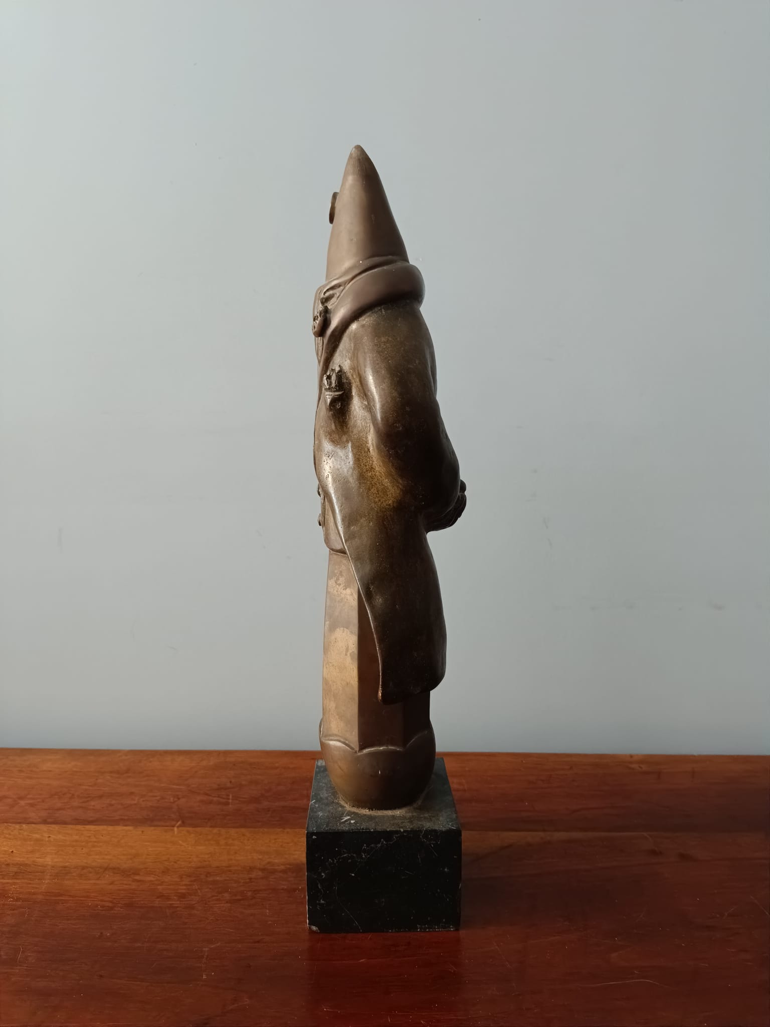 Scultura in bronzo degli anni 40 poggiata su base in marmo nero raffigurante un comandante della marina. La scultura è firmata sulla parte retrostante N. Manzo. La particolarità di questo bronzo sono le forme insolite del personaggio rappresentato.