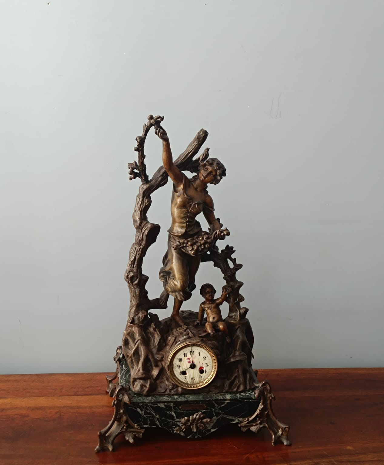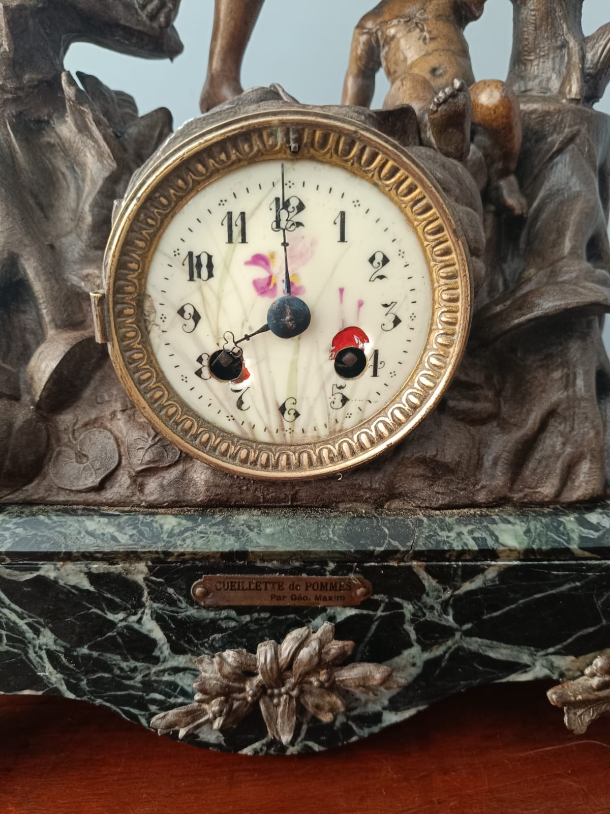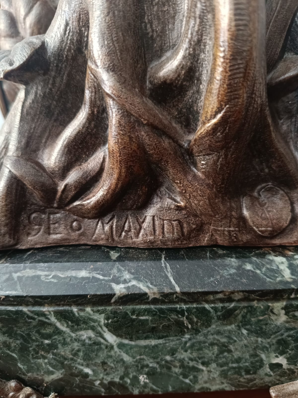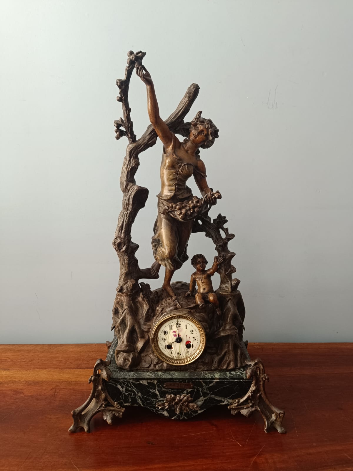 Importante scultura francese del periodo Liberty (1920 circa) raffigurante una contadina con bambino in ambiente paesaggistico. Per questa scultura sono stati utilizzati materiali come il bronzo, la porcellana e il marmo verde alpi. Rifiniture molto delicate. Firmata Géo Maxim. In perfetto stato conservativo.