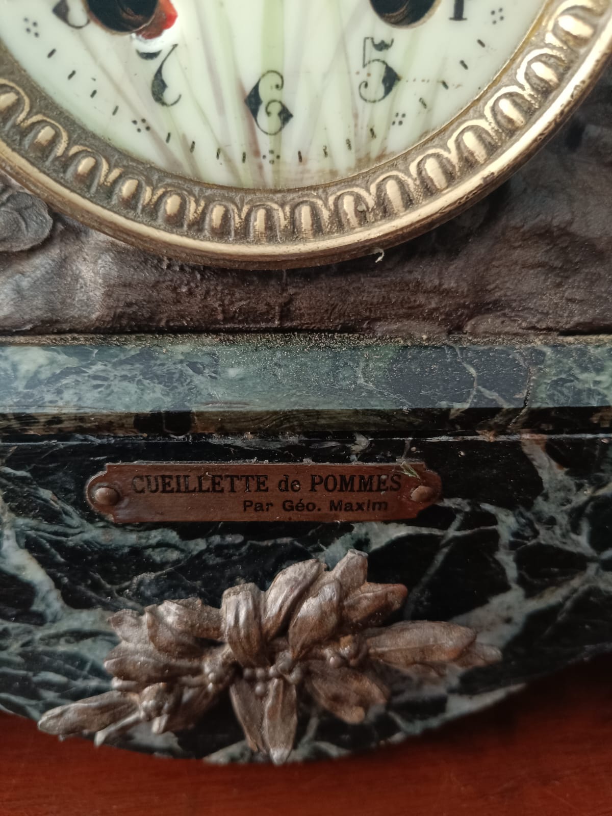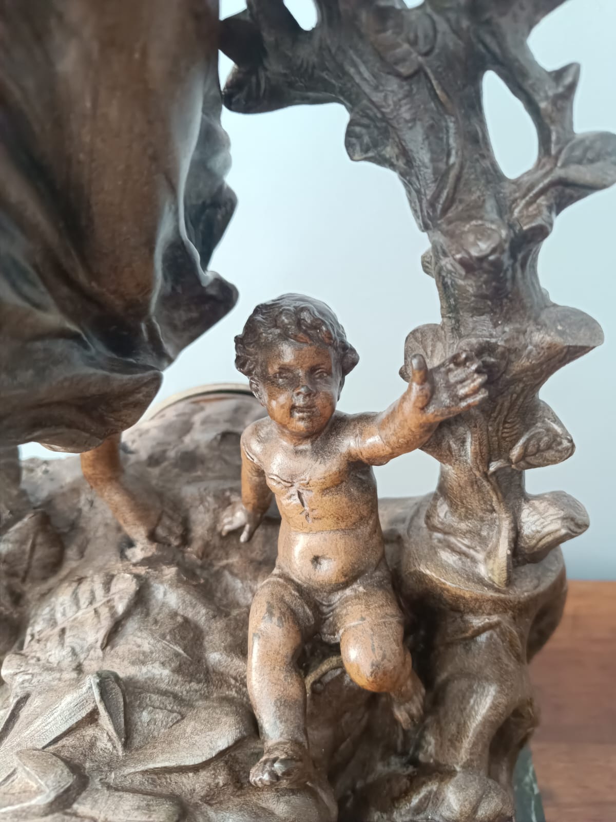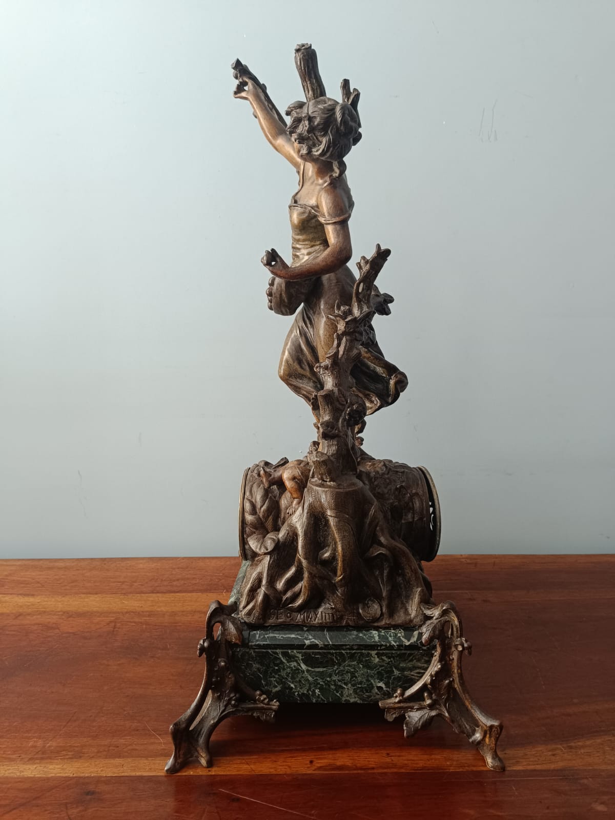 Importante scultura francese del periodo Liberty (1920 circa) raffigurante una contadina con bambino in ambiente paesaggistico. Per questa scultura sono stati utilizzati materiali come il bronzo, la porcellana e il marmo verde alpi. Rifiniture molto delicate. Firmata Géo Maxim. In perfetto stato conservativo.