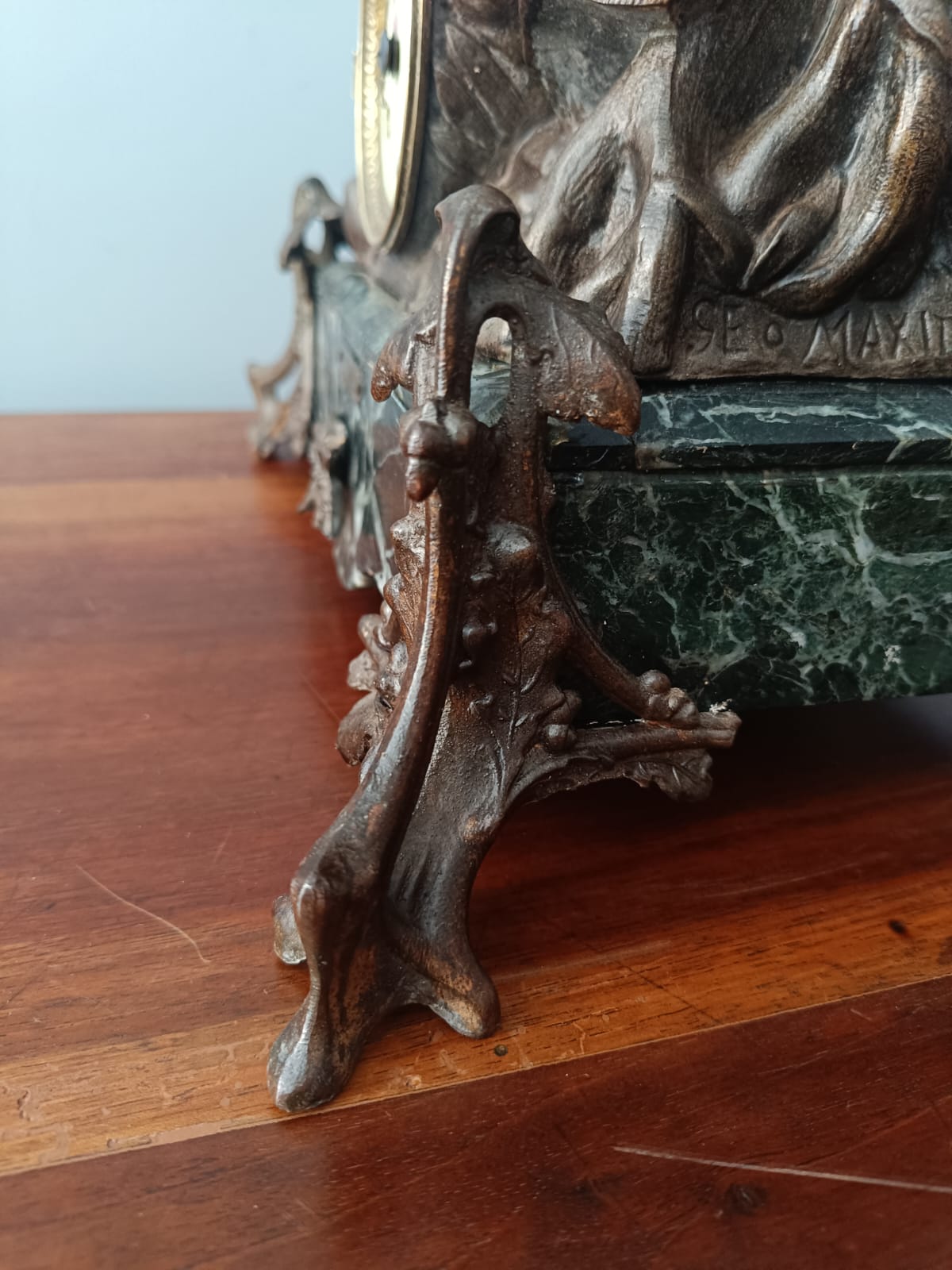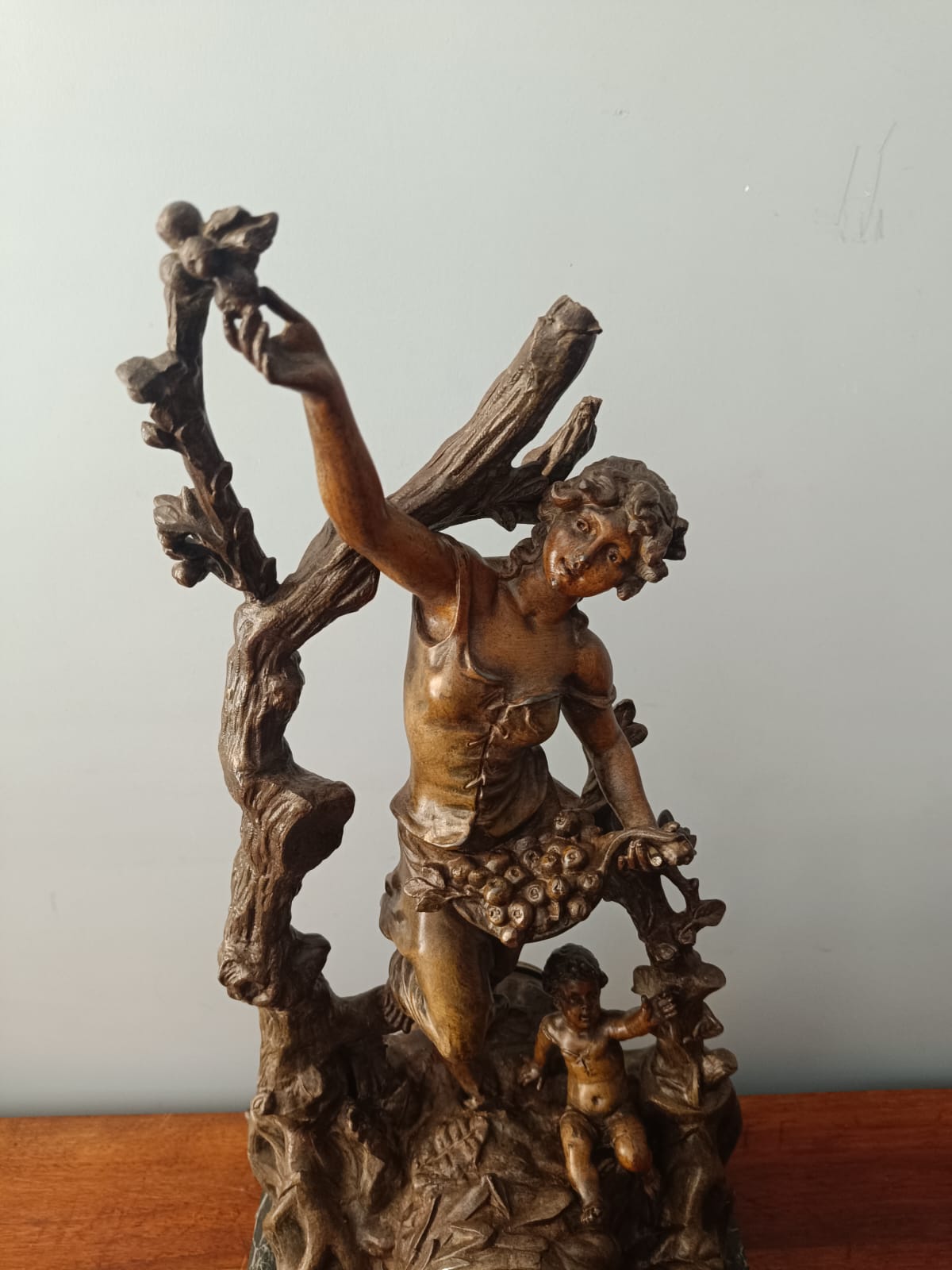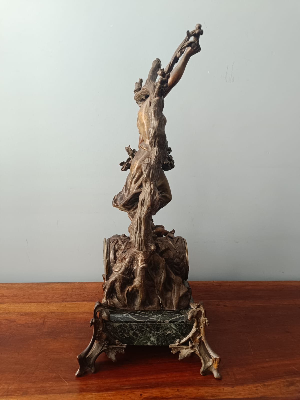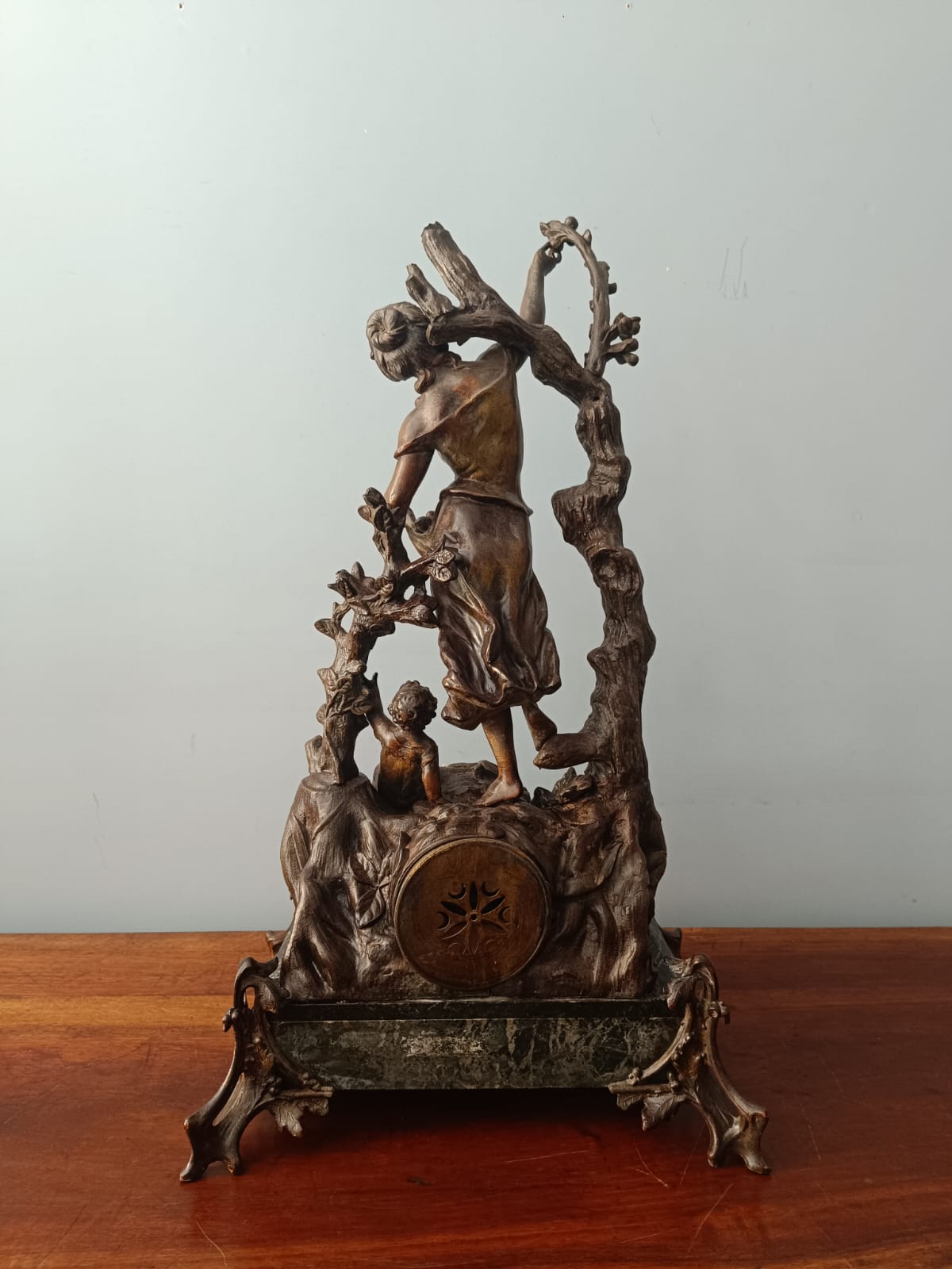 Importante scultura francese del periodo Liberty (1920 circa) raffigurante una contadina con bambino in ambiente paesaggistico. Per questa scultura sono stati utilizzati materiali come il bronzo, la porcellana e il marmo verde alpi. Rifiniture molto delicate. Firmata Géo Maxim. In perfetto stato conservativo.