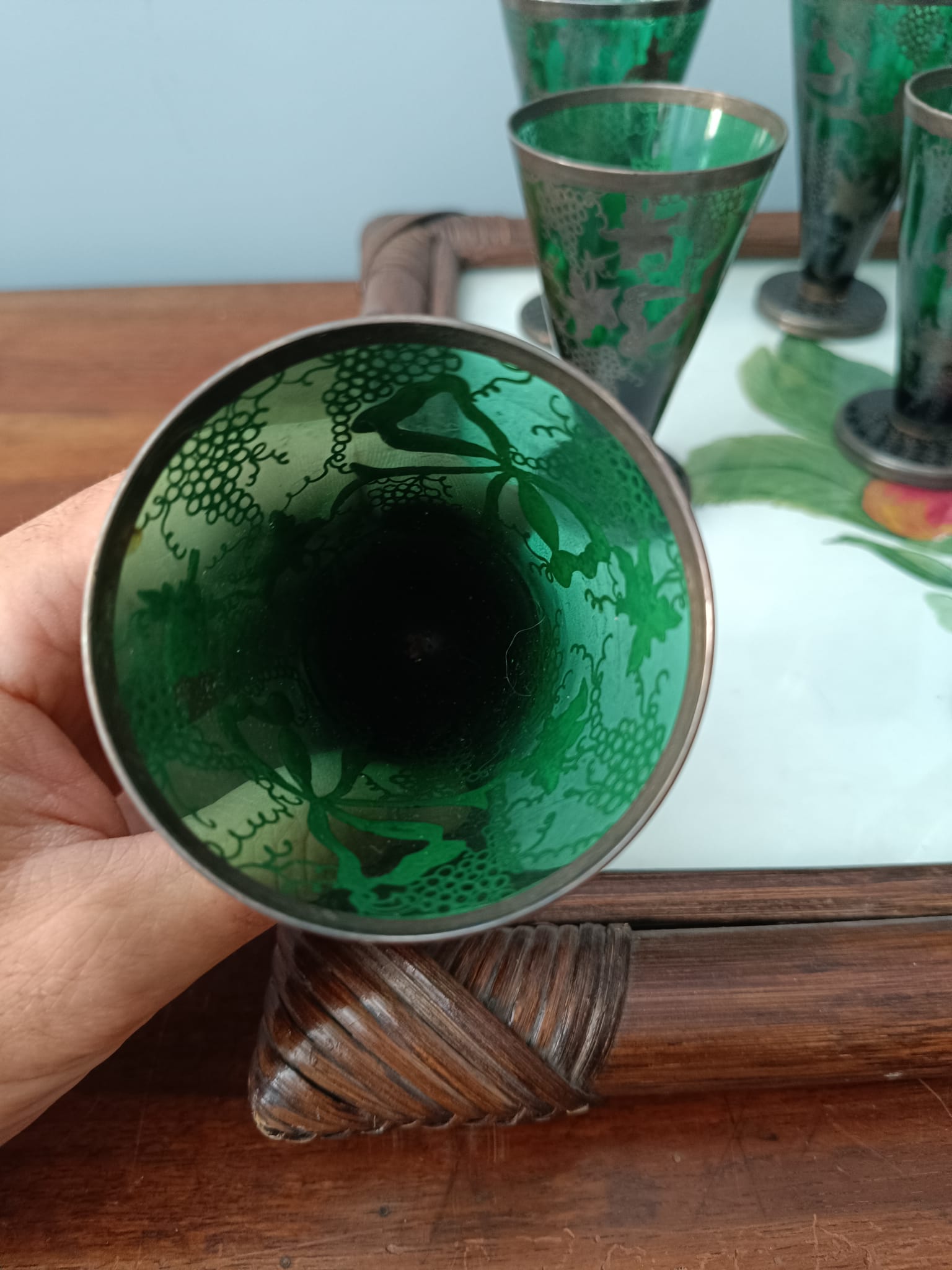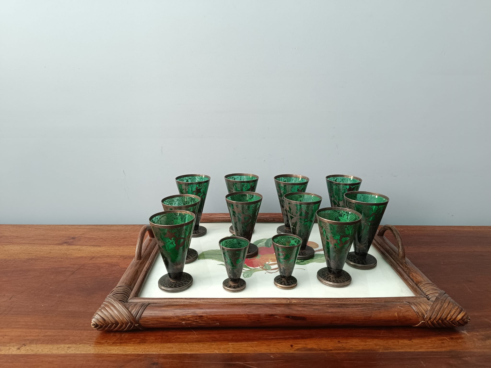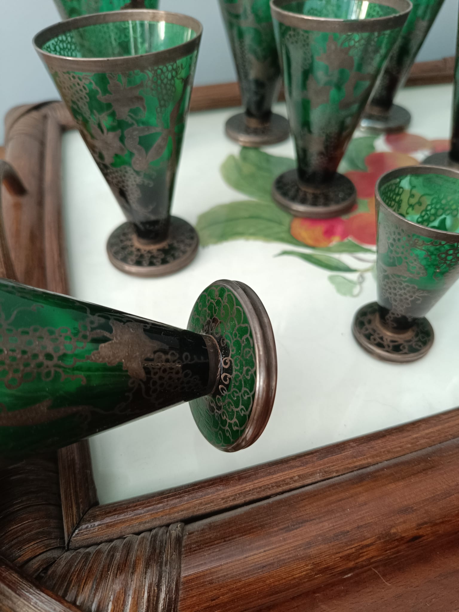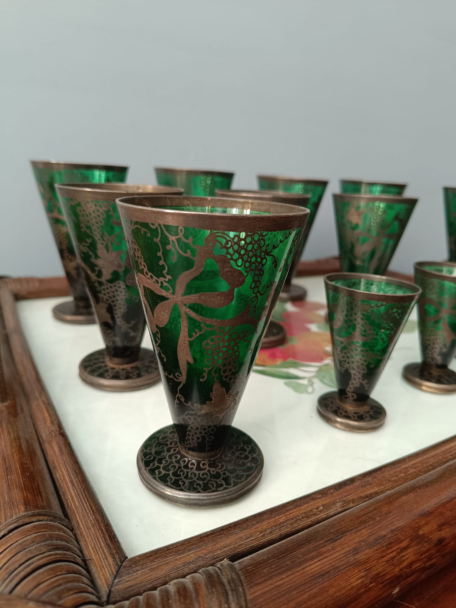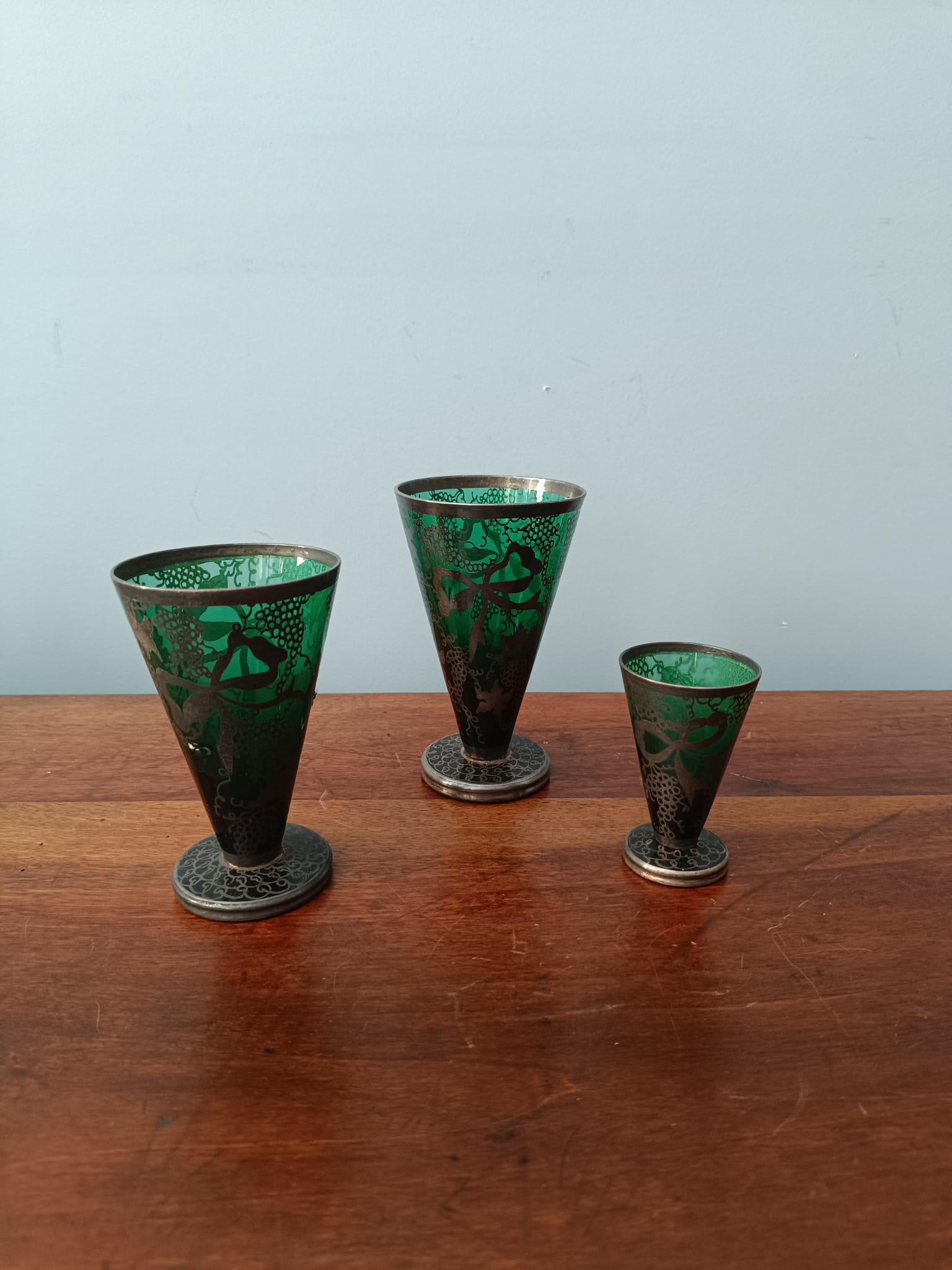 Antico set di bicchieri in vetro soffiato di colore verde con decorazioni in argento a motivi floreali. Fra tutti i bicchieri ci sono tre diverse misure. In perfetto stato conservativo.