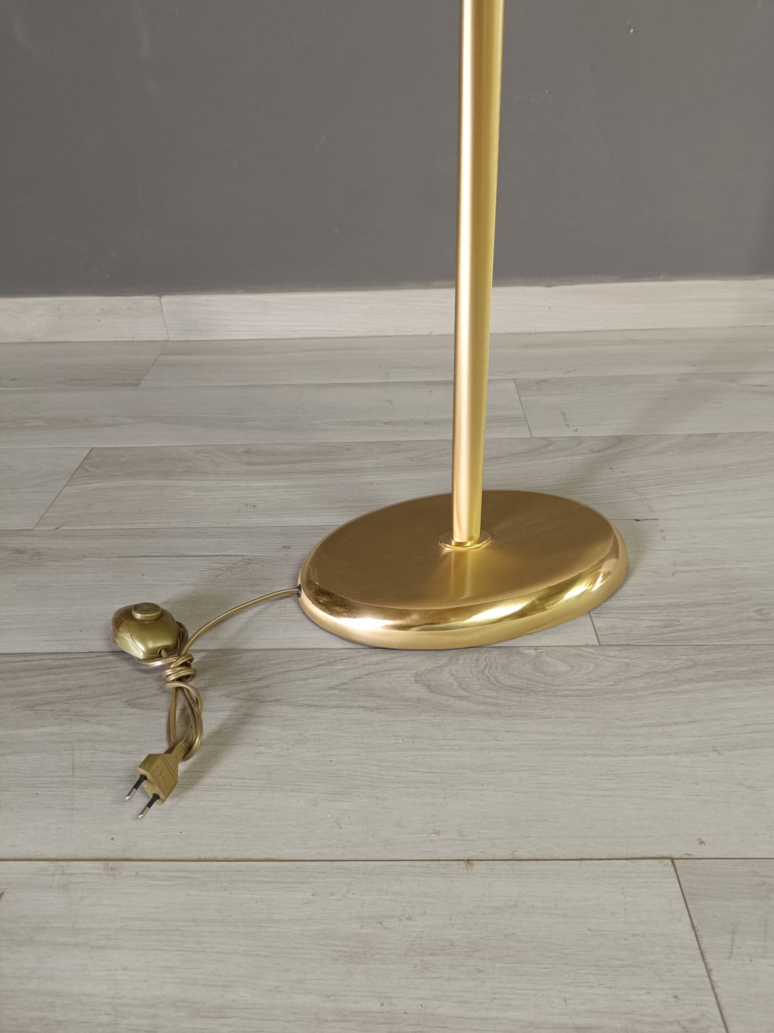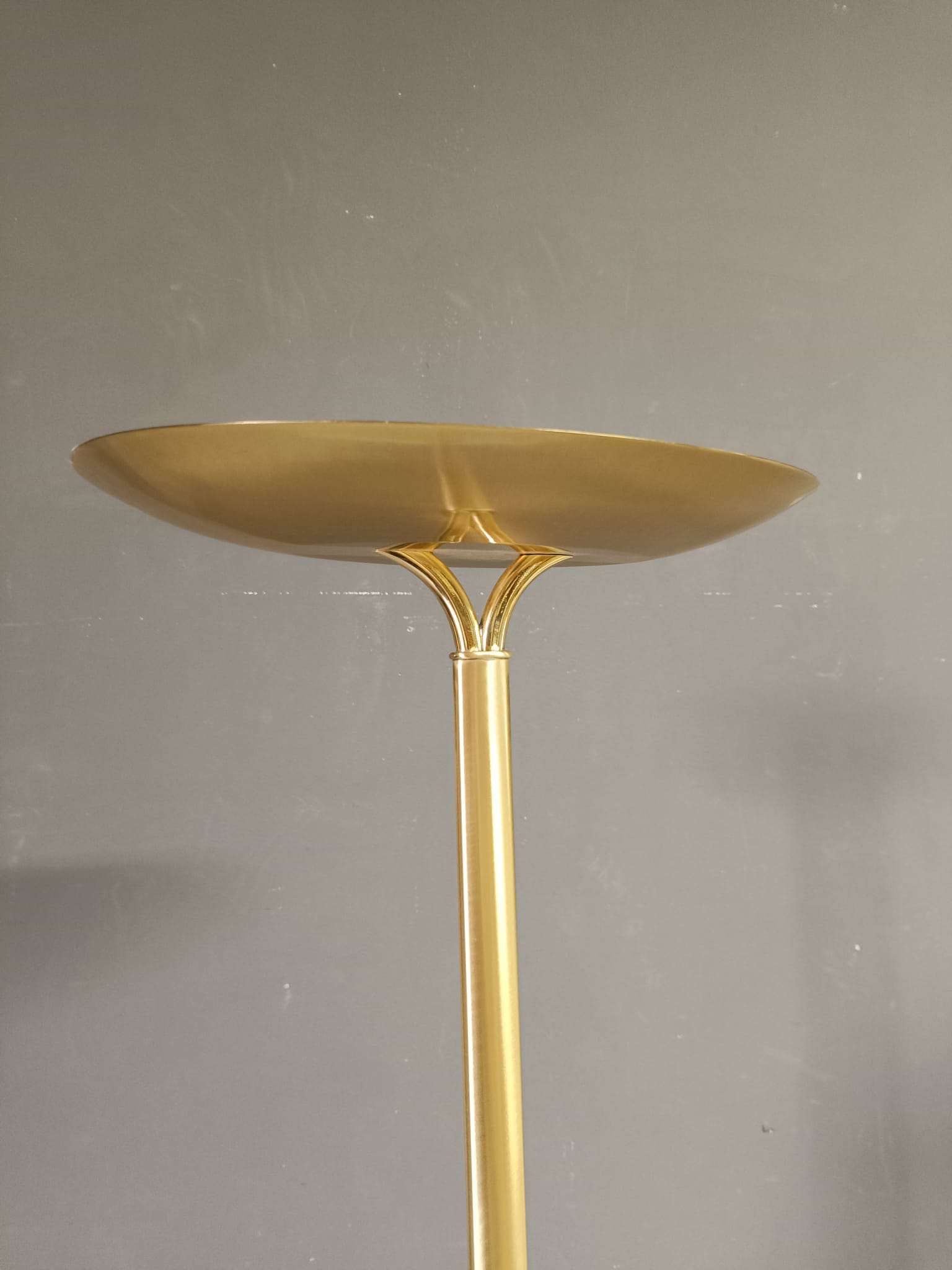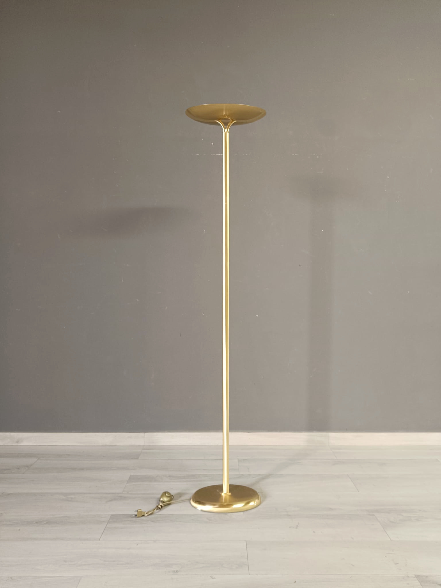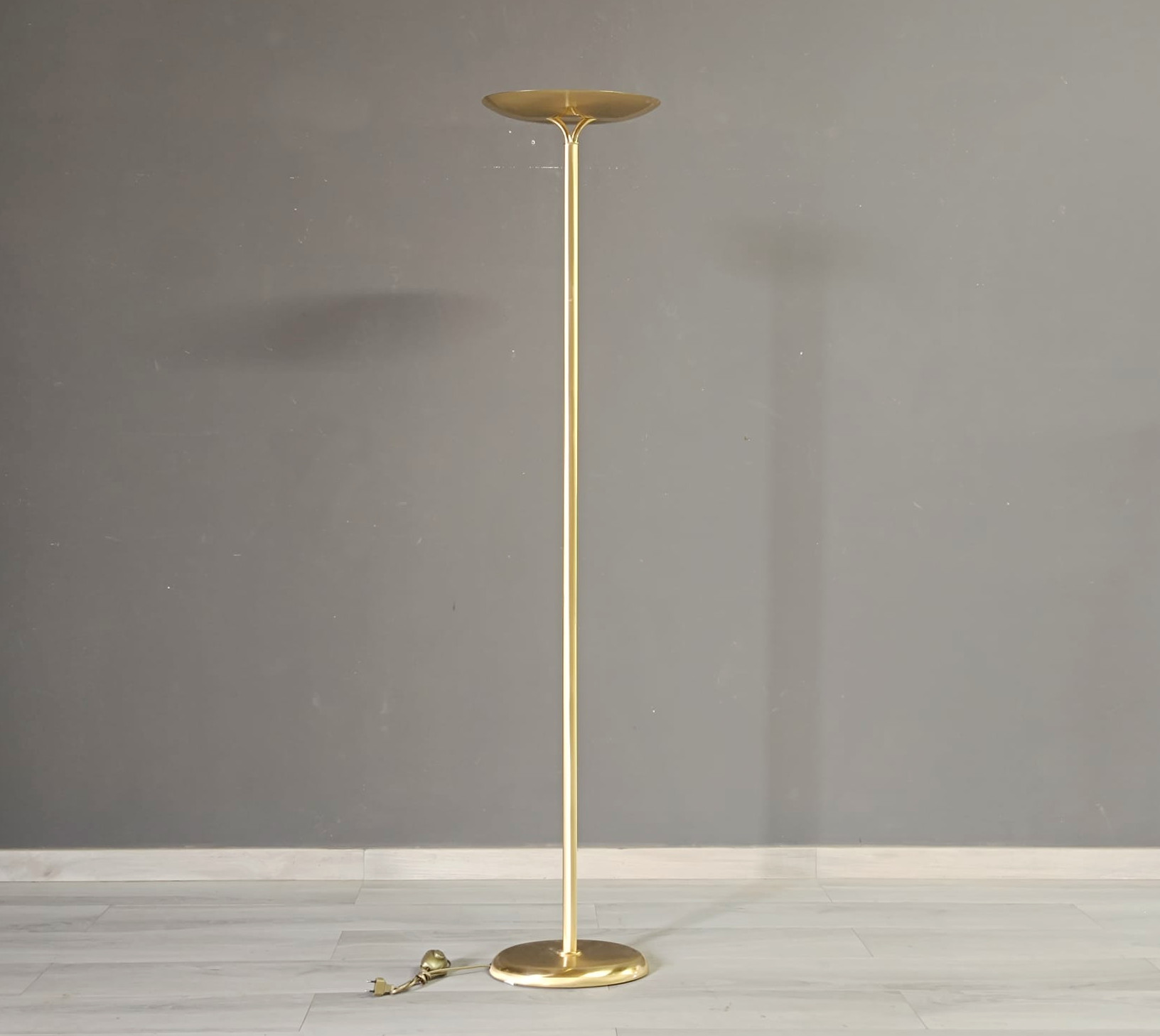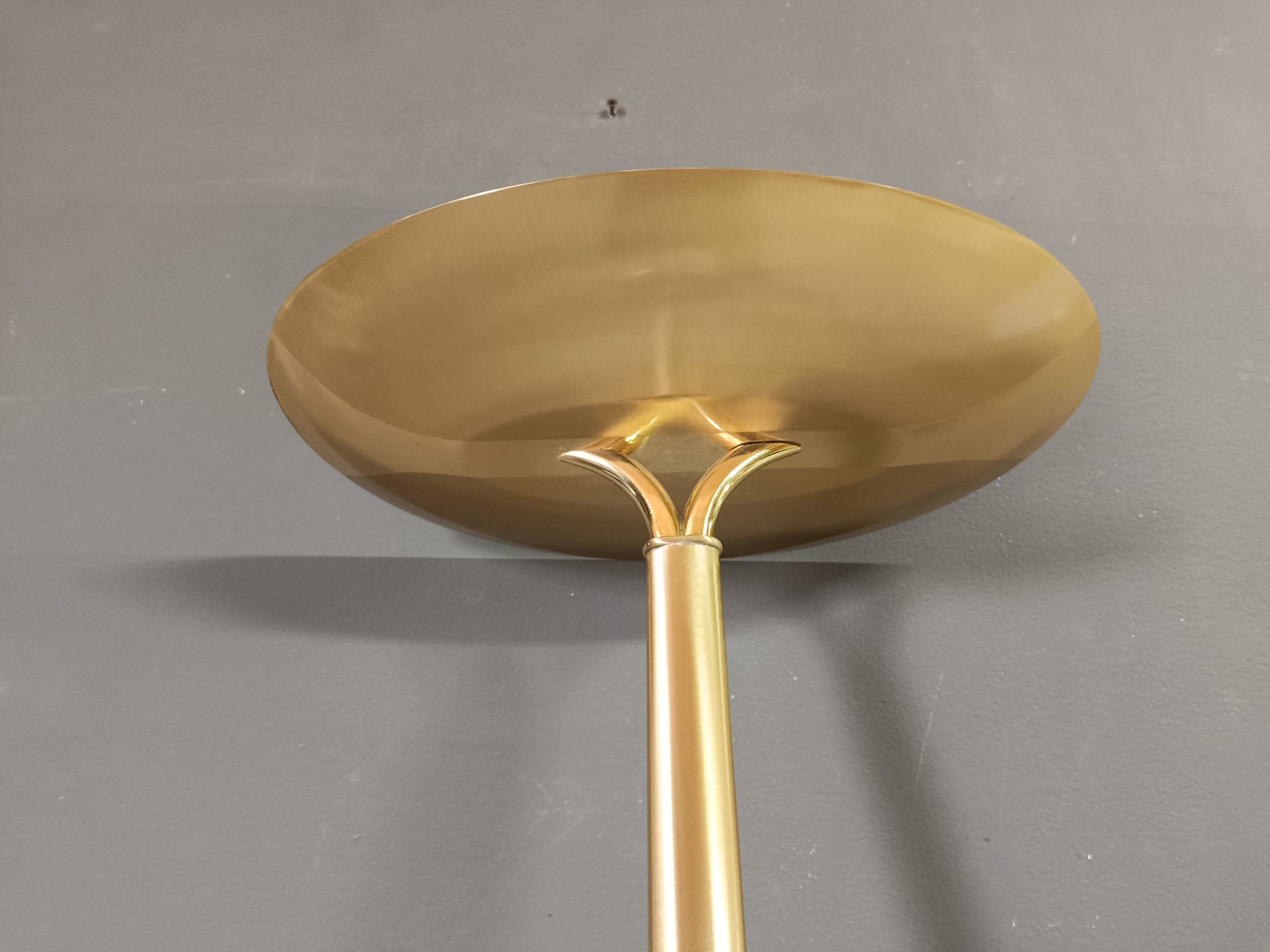 Bellissima lampada da terra in ottone satinato e lucido dalle forme molto semplici. Questa lampada può essere collocata facilmente in qualsiasi contesto di arredo.